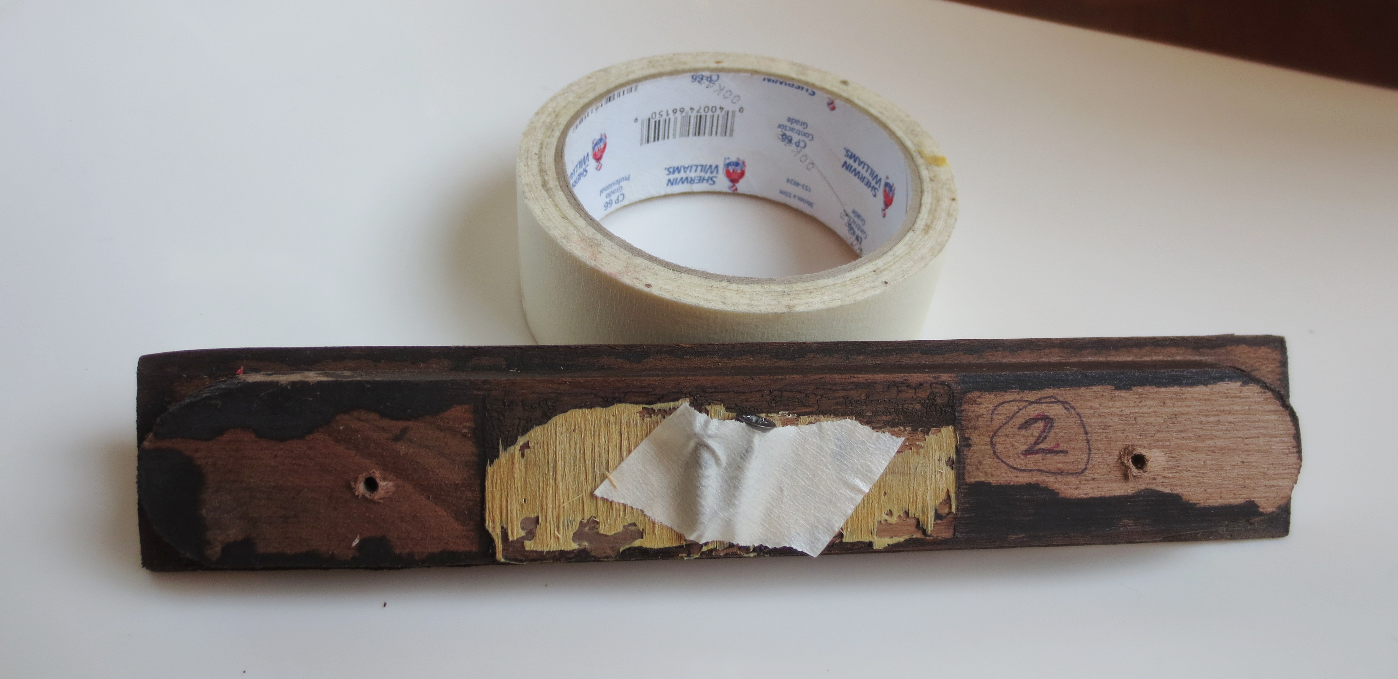 Brush off the dust, then gently wipe with a damp (not wet) rag. Then you will see all the spots you missed. At this point, I like to go over the rough spots as well as the rounded edges and hard-to-reach spots with a piece of sandpaper in my bare hands. Finally, give the whole thing a once-over with 220-grit sandpaper. You don’t need to get down to the bare wood, just get all that old varnish off so the wood is ready for a new stain. Wipe with a damp rag and let dry.