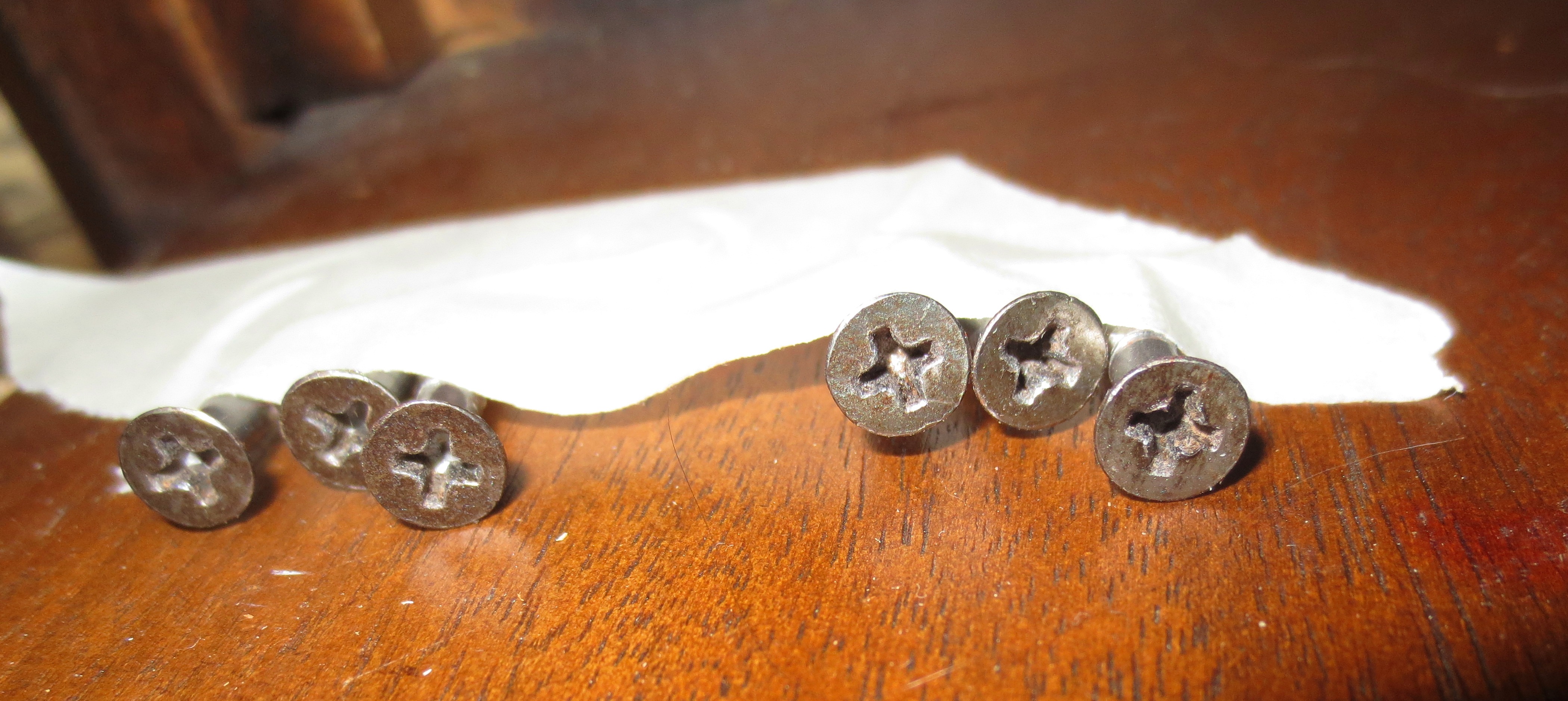 STEP ONE: Pull out the drawers and mark their position on the back (i.e., Top, Middle, Bottom). You could use 1, 2 and 3, but then you might forget if 1 is the top or the bottom. This has actually happened to me. Unscrew the drawer pulls and tape the screws to the back of the pulls. Also, be sure to mark the pulls with the position of the mother drawer. This may seem a bit anal, but when a screw has been sitting happily in a hole for over 40 years, it may resist being screwed into another hole (this is not a euphemism for anything).