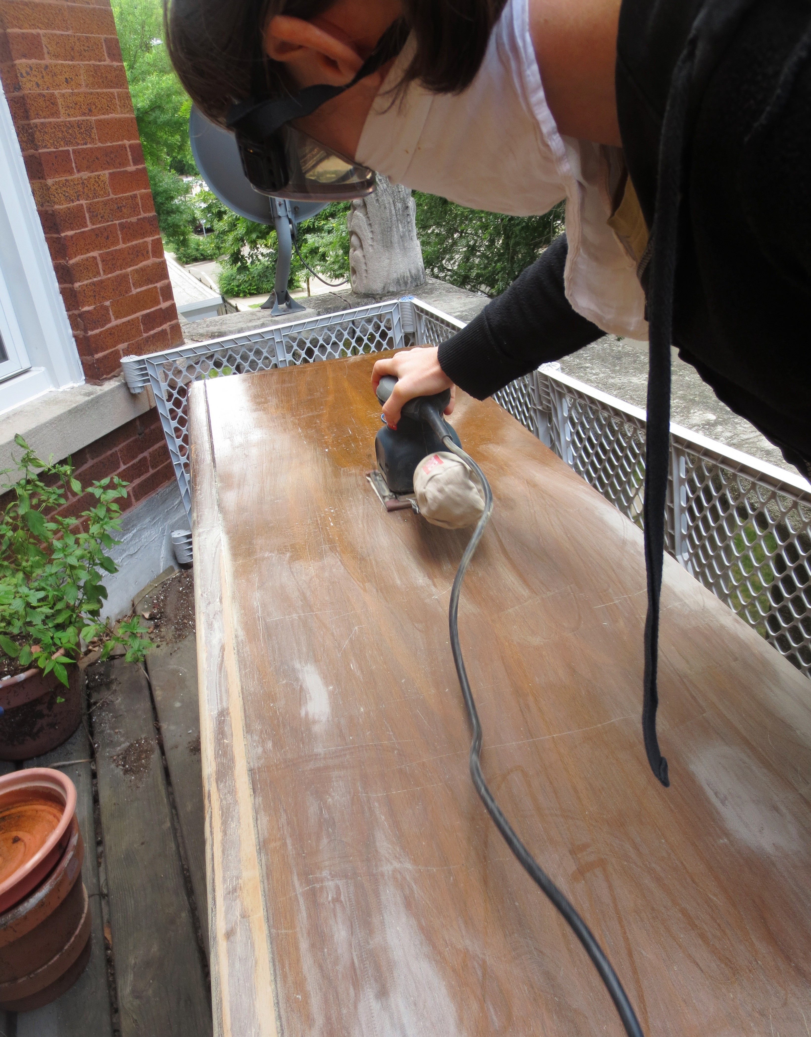 STEP TWO: Move the cabinet body to a totally bare room, or preferably outdoors (I used our front porch, which isn’t legally a porch). Use a 100-grit sandpaper and a power sander to remove the old varnish.