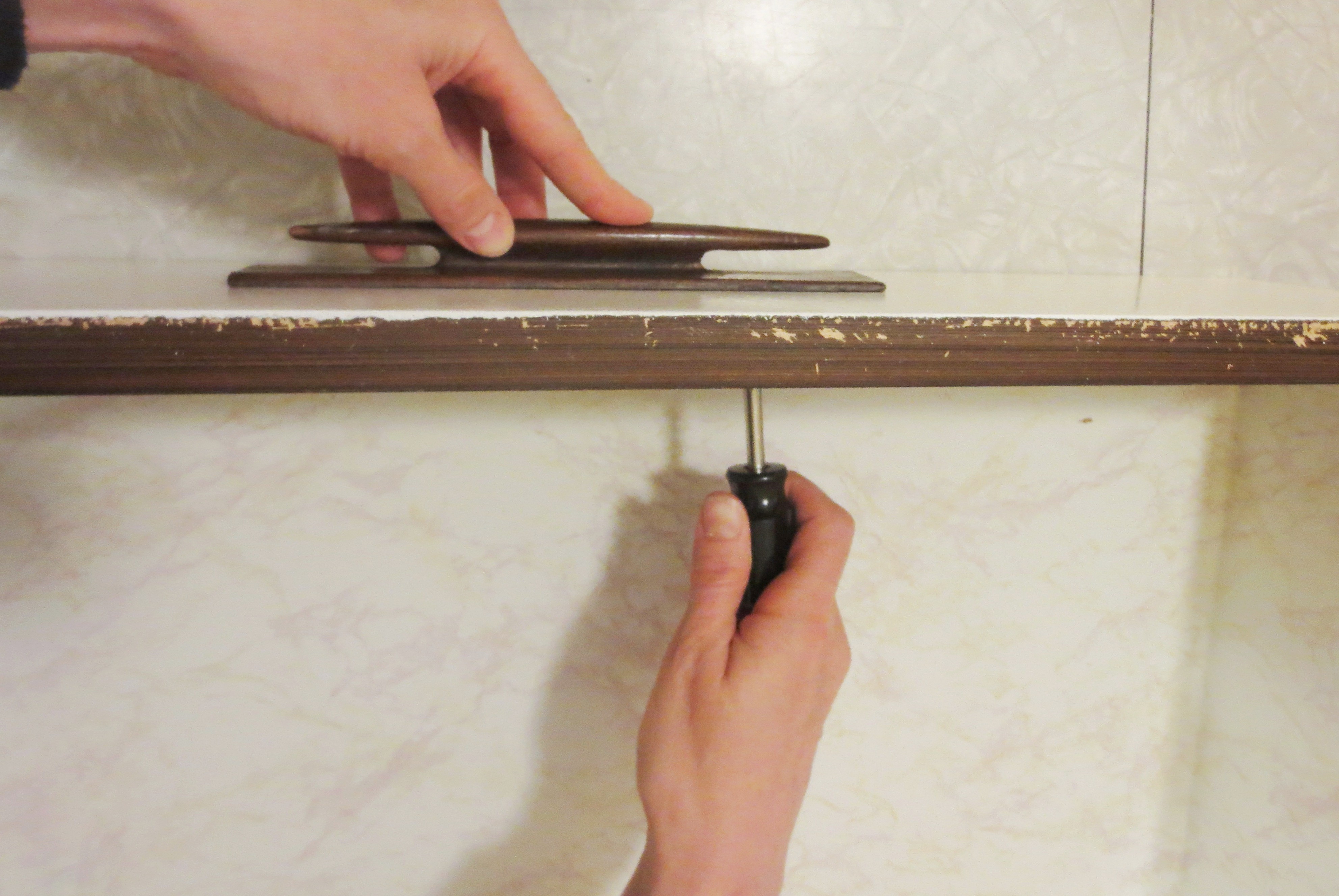 STEP EIGHT: When all the varnish has dried, screw the pulls back onto the drawers, and the doors back into their hinges.