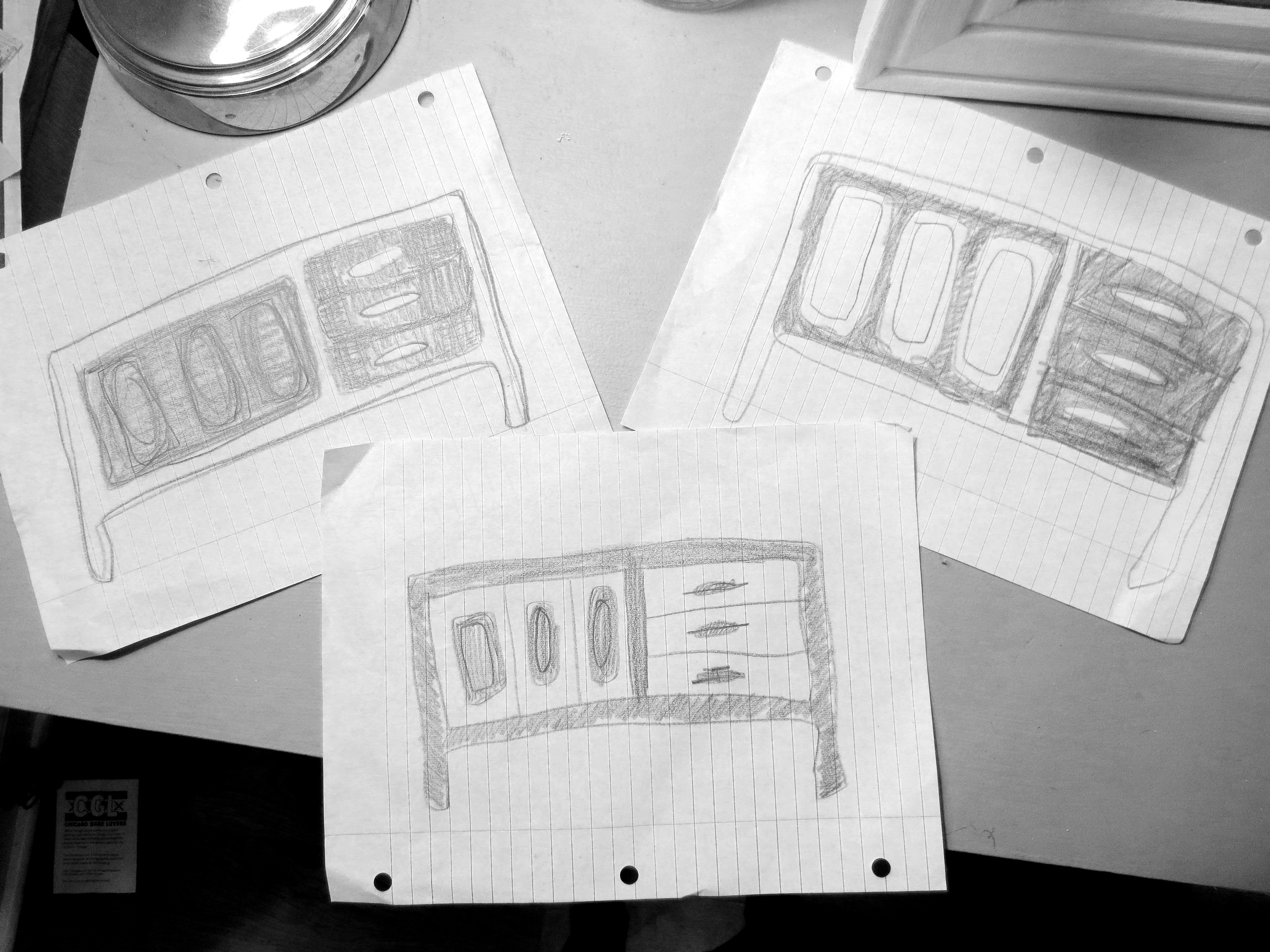 Structurally speaking, this thing was in perfect shape. But on the surface, it needed a lot of sanding and some combination of stain and paint. My goal was to keep most of the original wood surface, but stain it darker, then use white paint to highlight the fabulous cabinet lines and drawer pulls. I borrowed my kids’ crayons to sketch out a few options, and settled on a modified version of number 2.
