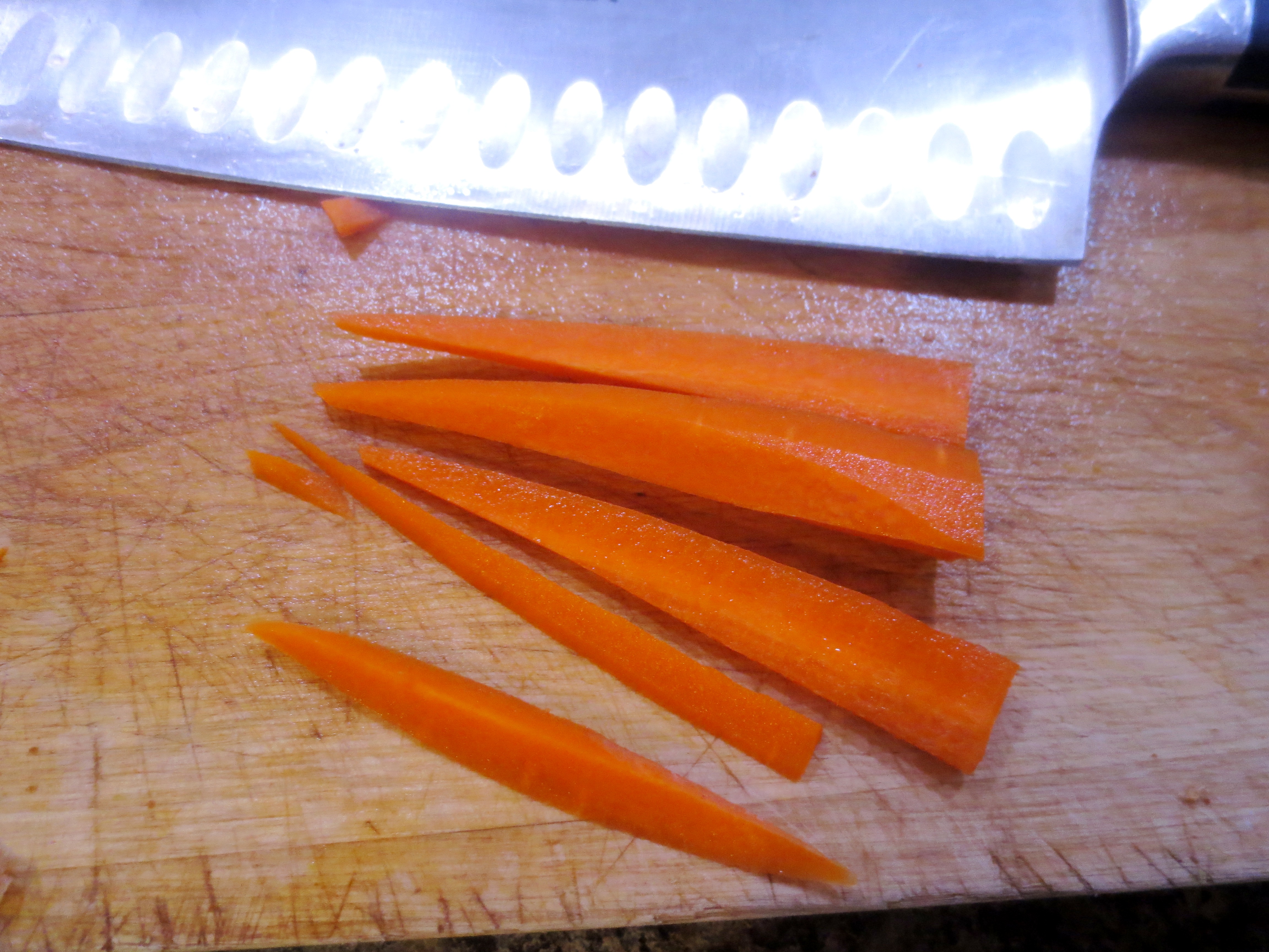 Wash your fruit and carrots. Peel the carrots and slice them into thin sticks. The best sticks for sticking are the ones that come from the pointy bottom of the carrot — the pointier the better.