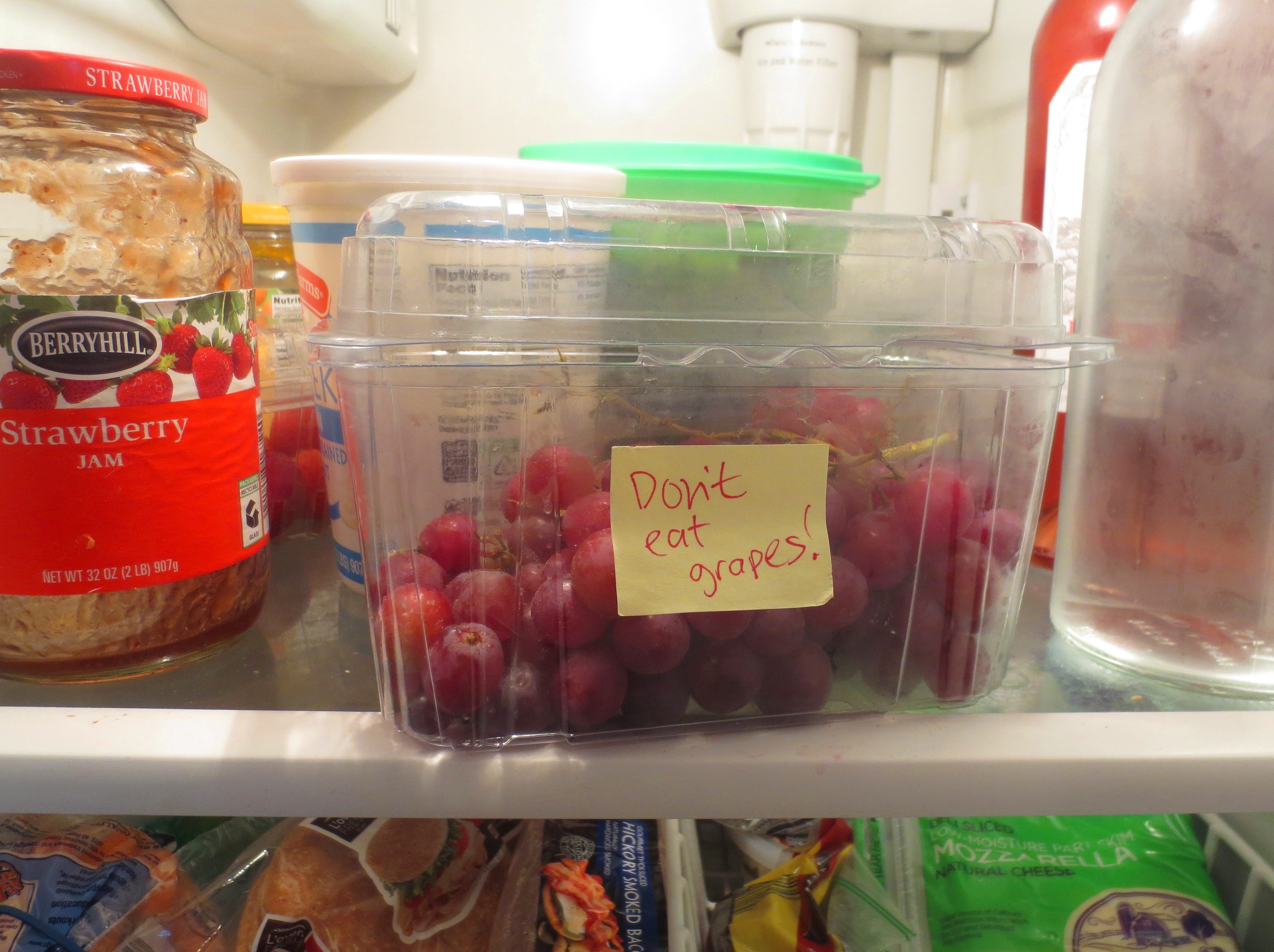 STEP ONE: Select the kind of fruit to use, as long as it is a “mushy” fruit and not a hard one. My daughter’s top three fruits were grapes, strawberries and prunes (yes, prunes). Hide the fruit from your family until the time is right, or perhaps leave a threatening note. Most family members — without knowing why — will instinctively eat the thing that you are saving up for a special project (we were making these for Estelle’s day camp picnic potluck thingy).