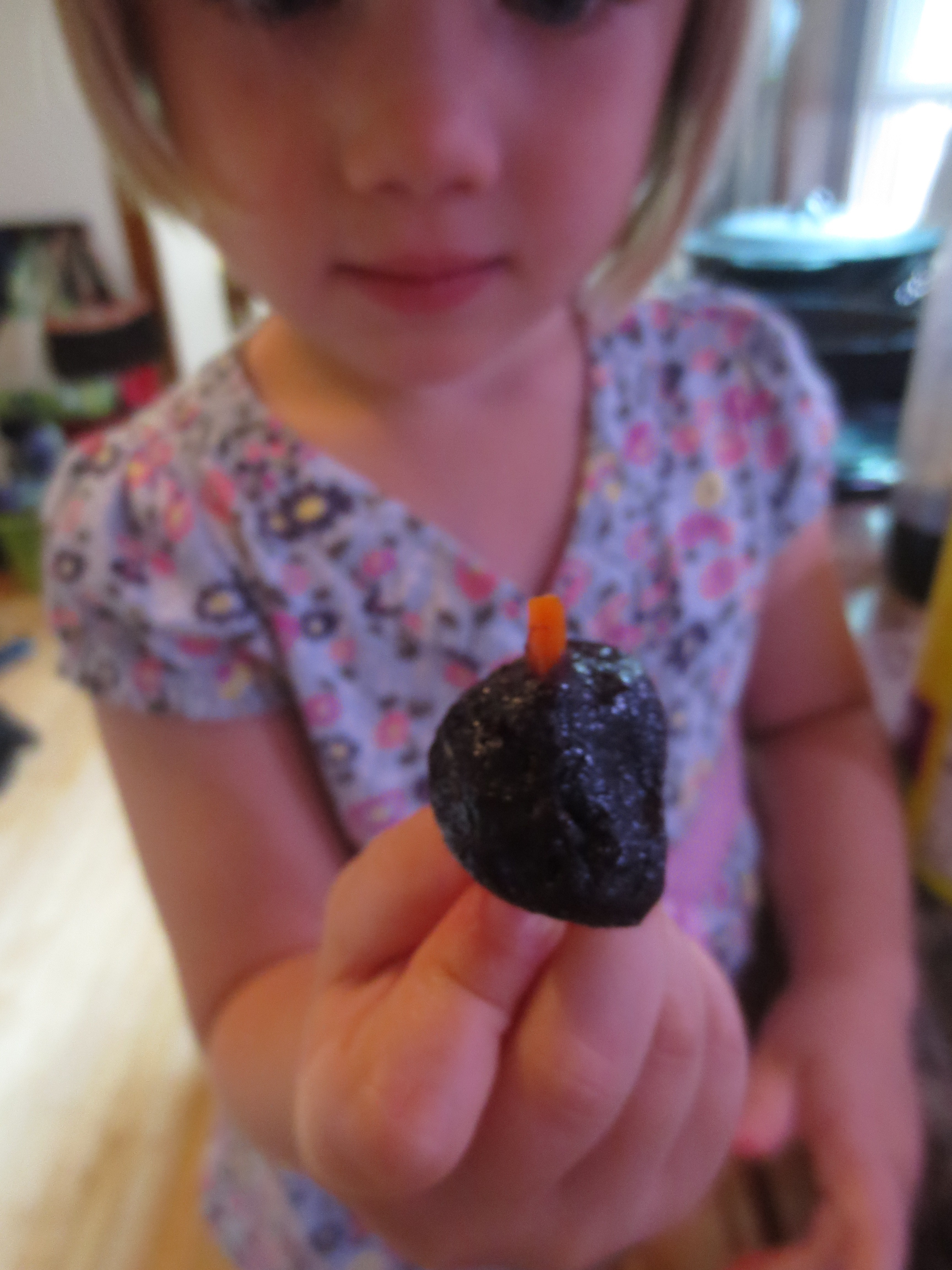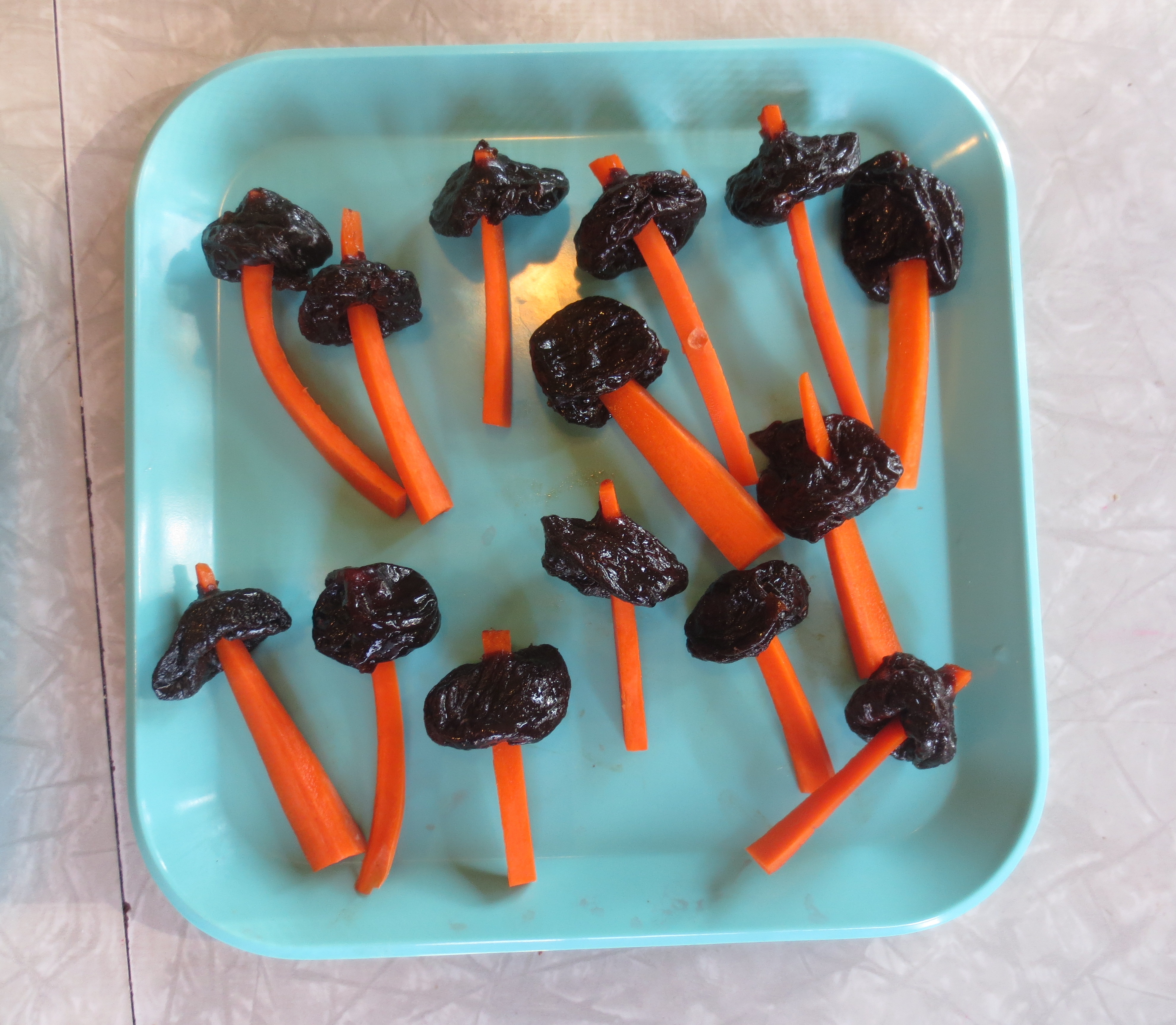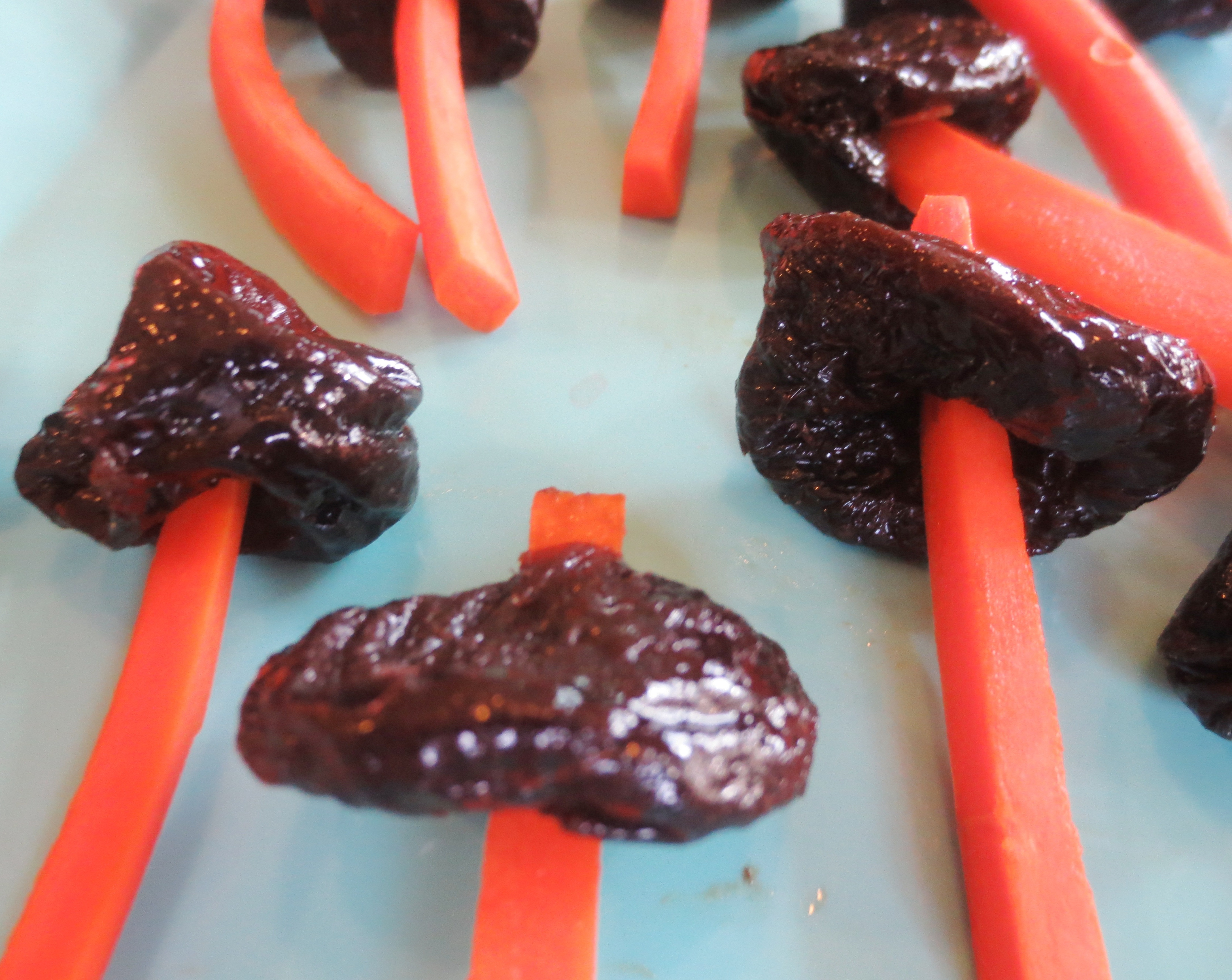 STEP FOUR – PRUNES: Smush up your prunes with your fingers until they are soft. Then jam the carrot stick in there and mold the prune back into a pleasant shape. You may pierce the prune completely to ensure proper skewering — it actually looks kind of cool with the carrot point sticking out the top.