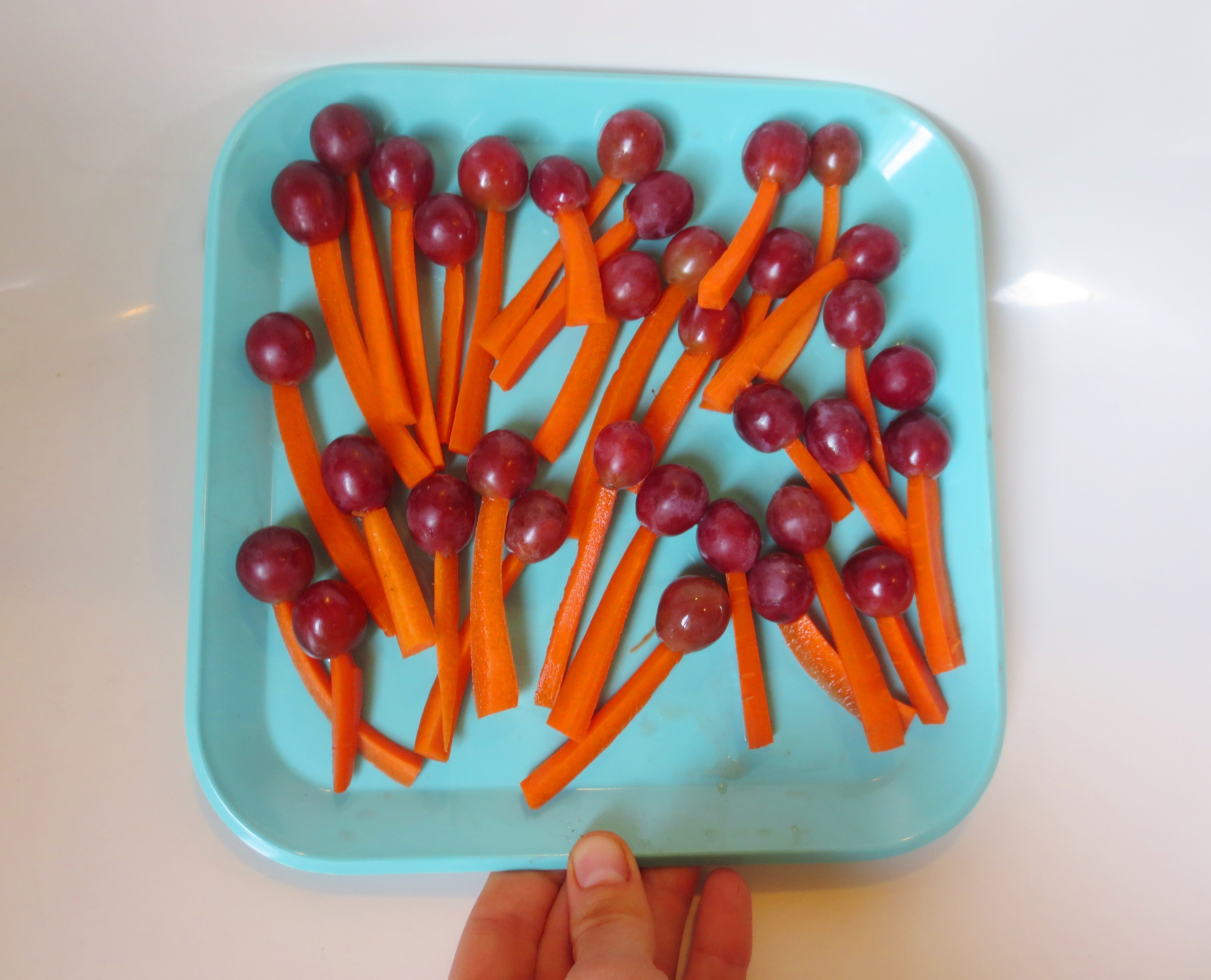 STEP TWO – GRAPES: Start with grapes, because grapes are small and slippery and take more patience. Remove grapes from their stems and push the pointy end of the carrot stick into the hole where the grape stem used to be. Push it up about 3/4 way into the grape, so that it is securely lodged but not pushing out the other end.