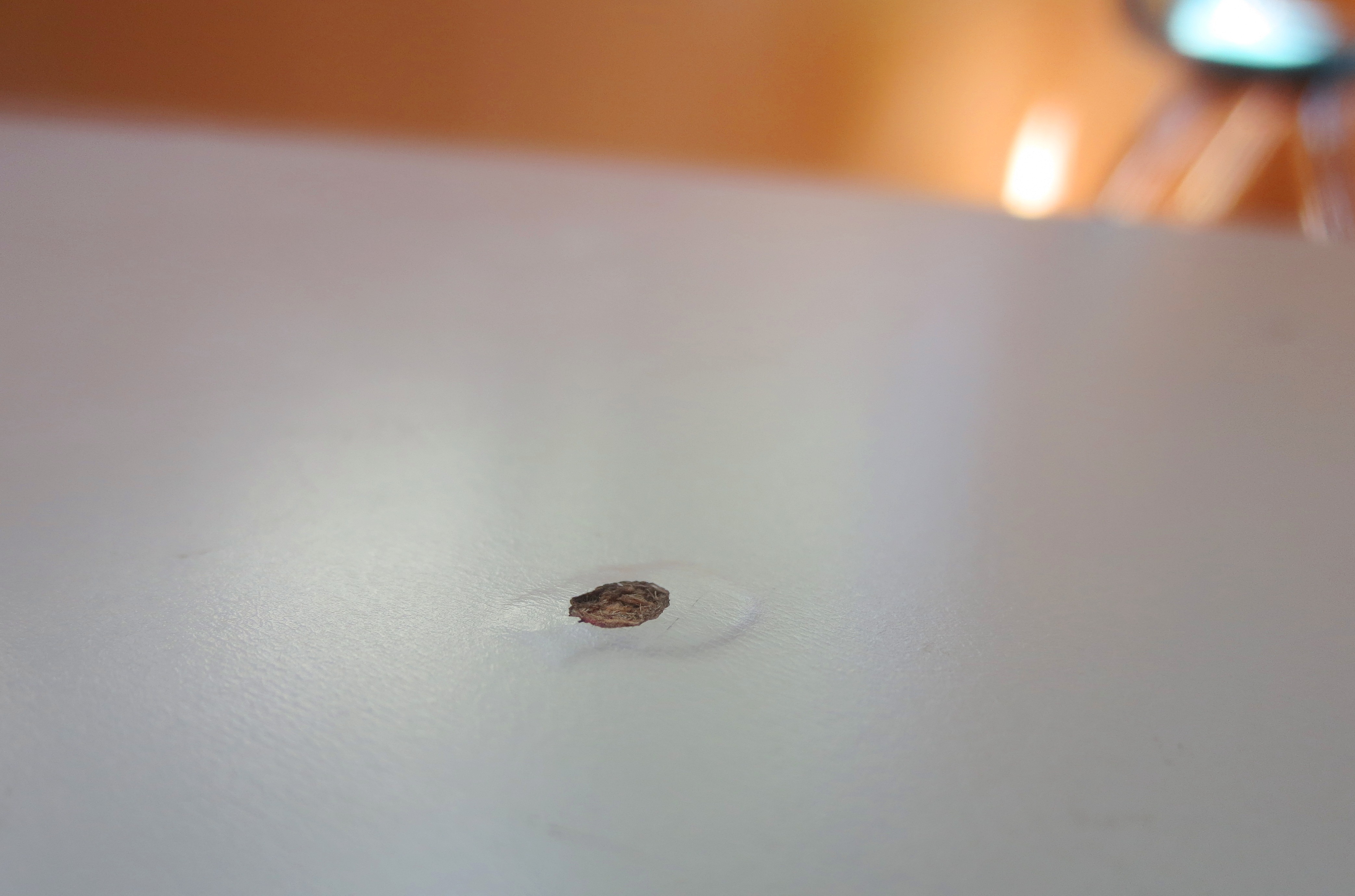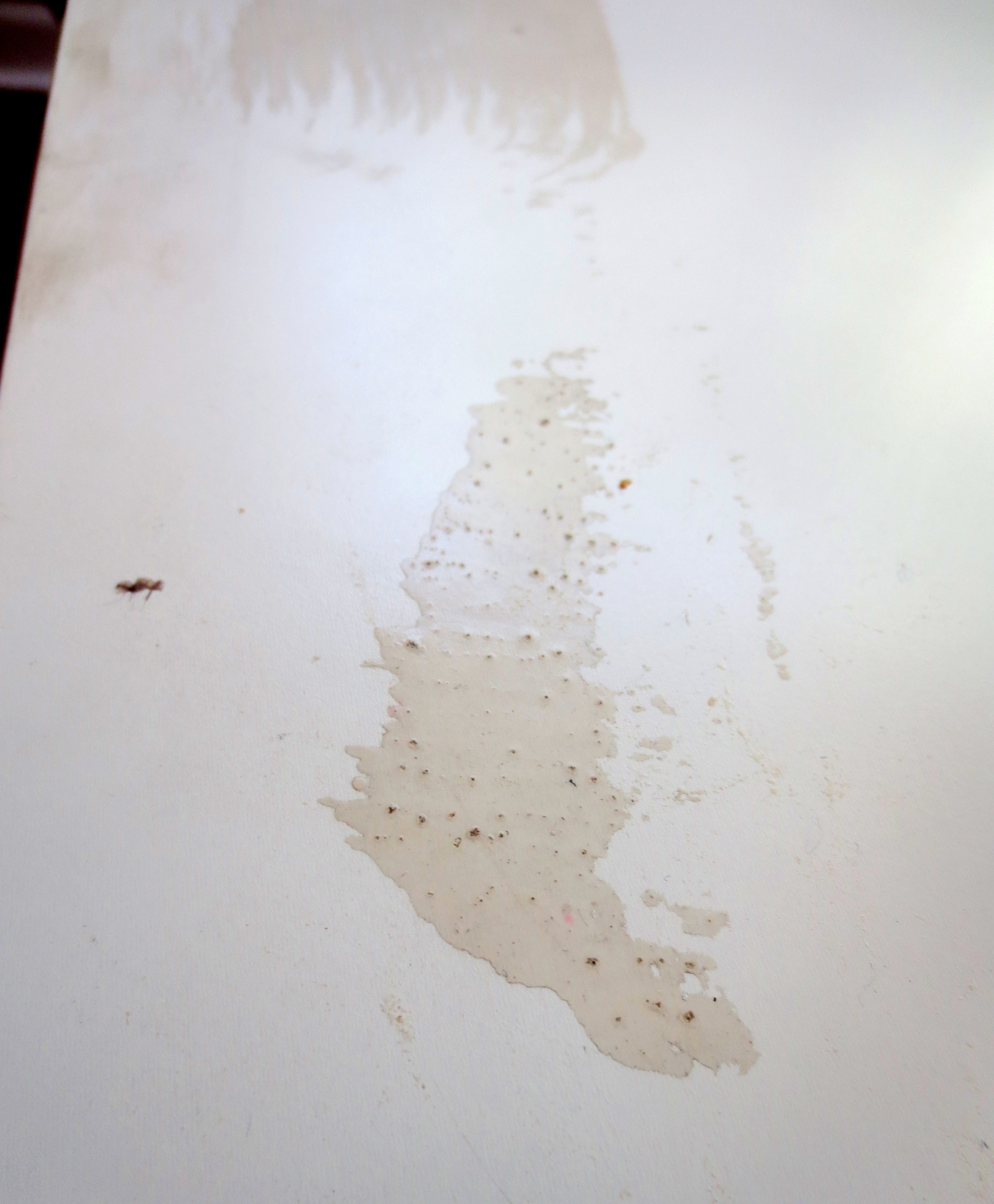 It’s a solid bench, and never wobbled for a second. But after just a few months in our dining room, blemishes started to appear on the veneer surface. Tiny holes in the finish would allow untold gallons of spilled milk to penetrate the vulnerable particleboard below, which would then swell and expand the surface blemishes even further: