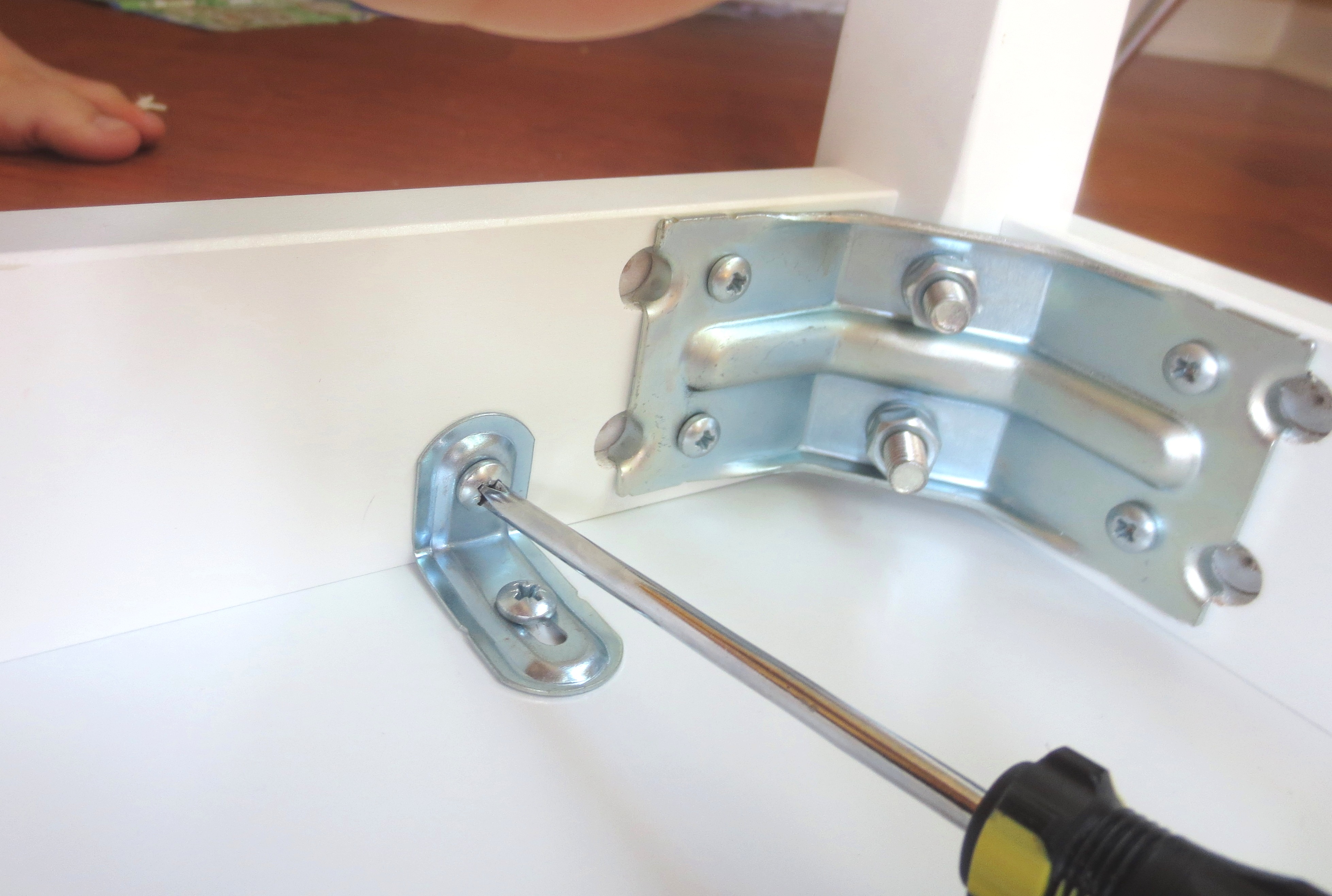 Place the leg base back on top of your upside-down seat panel. Line up the screw holes on the leg base with the marks you’ve made on the seat.