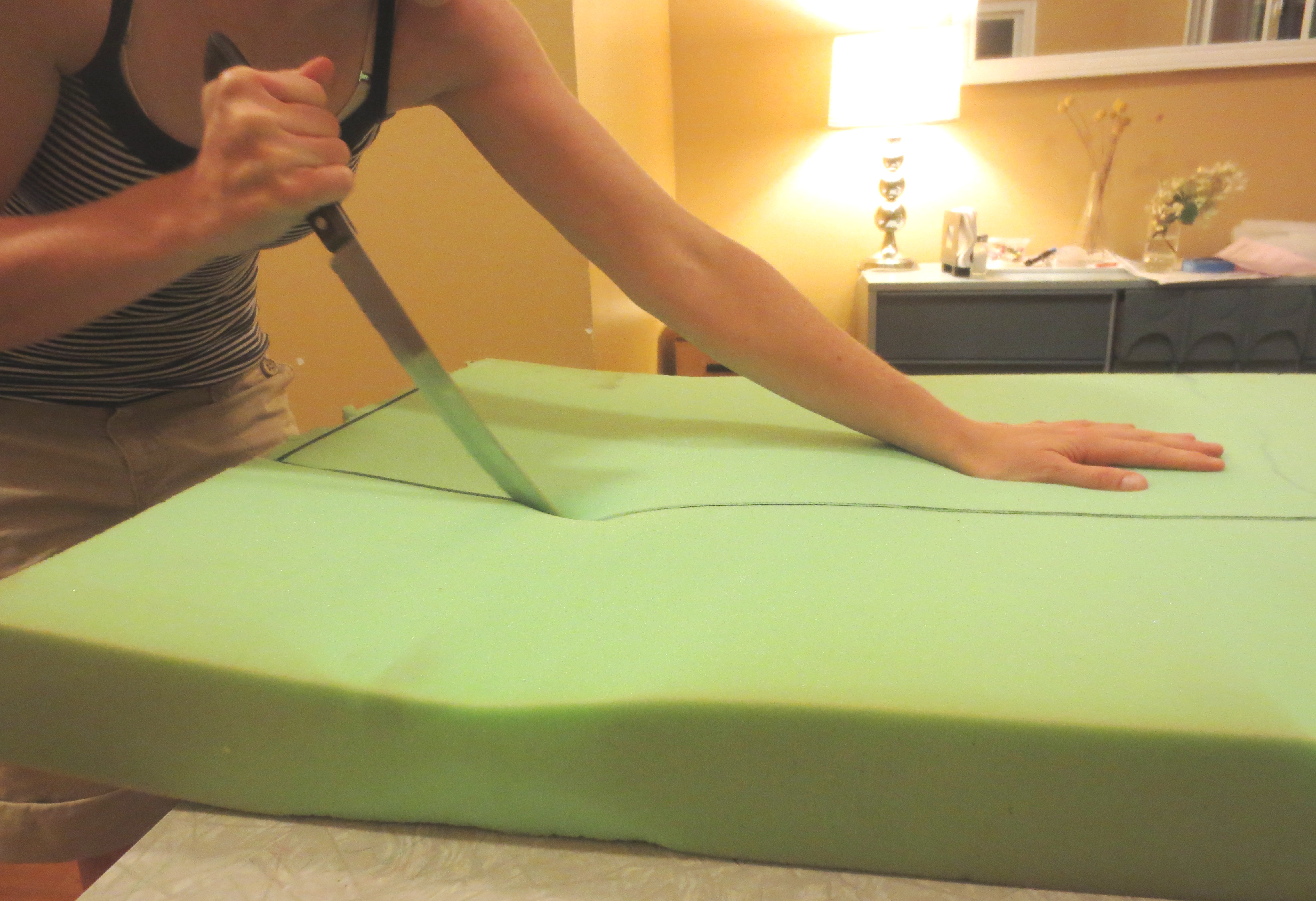 Especially if you acquire your foam from an, ahem, non-traditional source, you’ll need to cut it down to size (and lightly spray with vinegar to eliminate the smell). Simply trace the outline of the seat panel on your foam, then grab your scariest kitchen knife and stab away the excess.