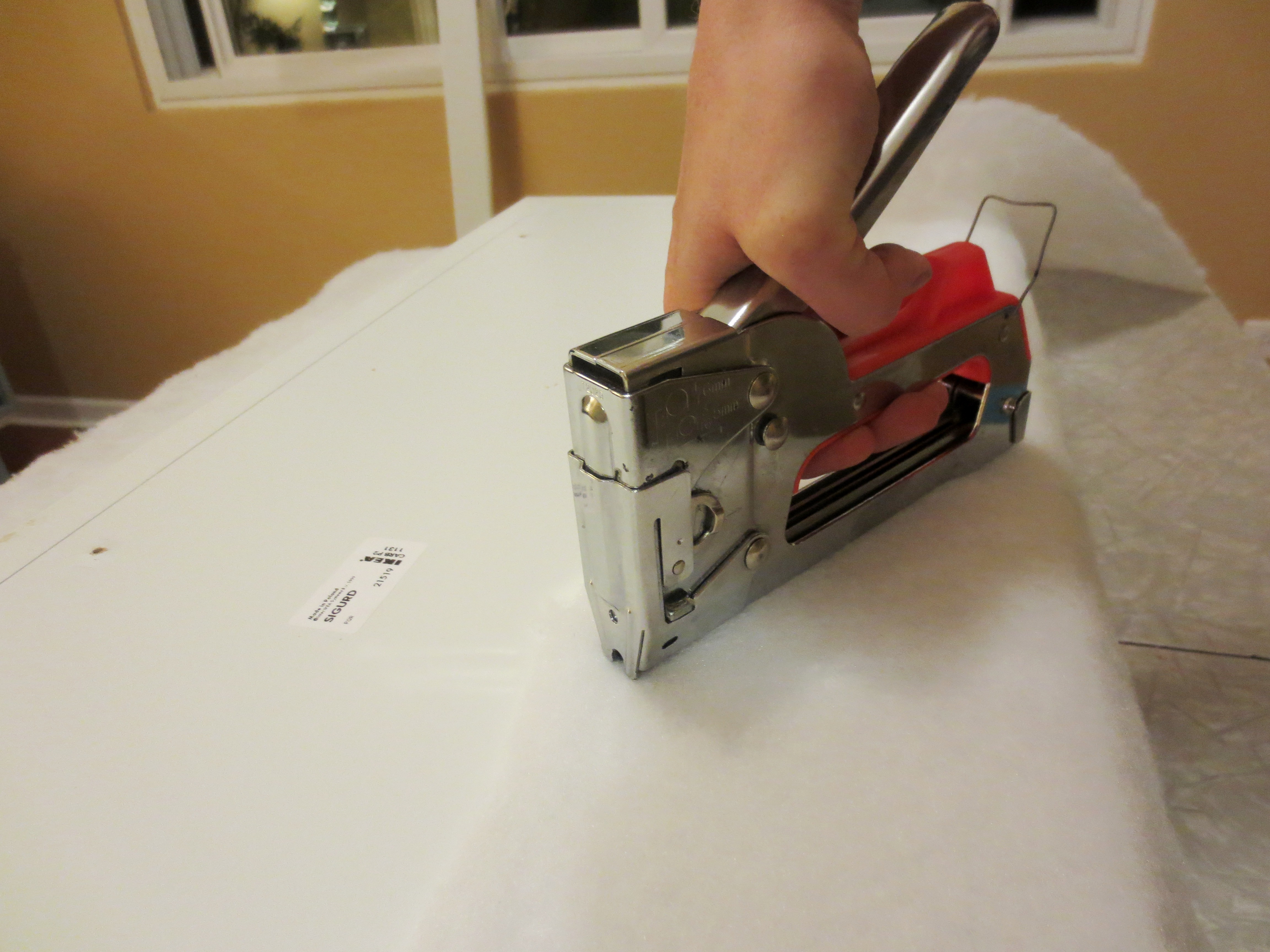 Pull the interfacing tightly over the foam and staple it to the bottom of the seat panel, far enough towards the middle that you will have room to attach your legs again.