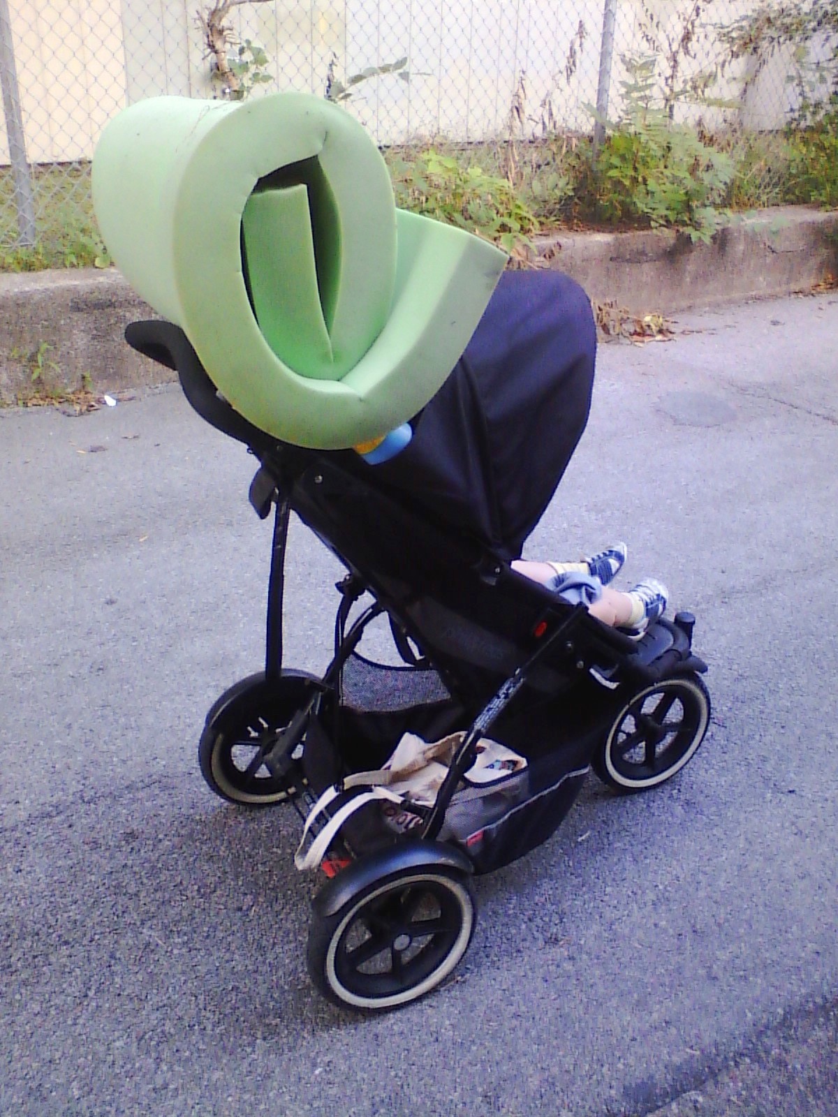 Then, the night before I finished this project, I took the baby on a walk to the store. It was a big moving weekend in Chicago and the alleys were bursting with treasure. Would you believe my luck? I found a perfectly good (mostly) roll of three-inch thick foam perched atop a trash can, charmingly tied up with twine. And it fit right on top of the stroller!