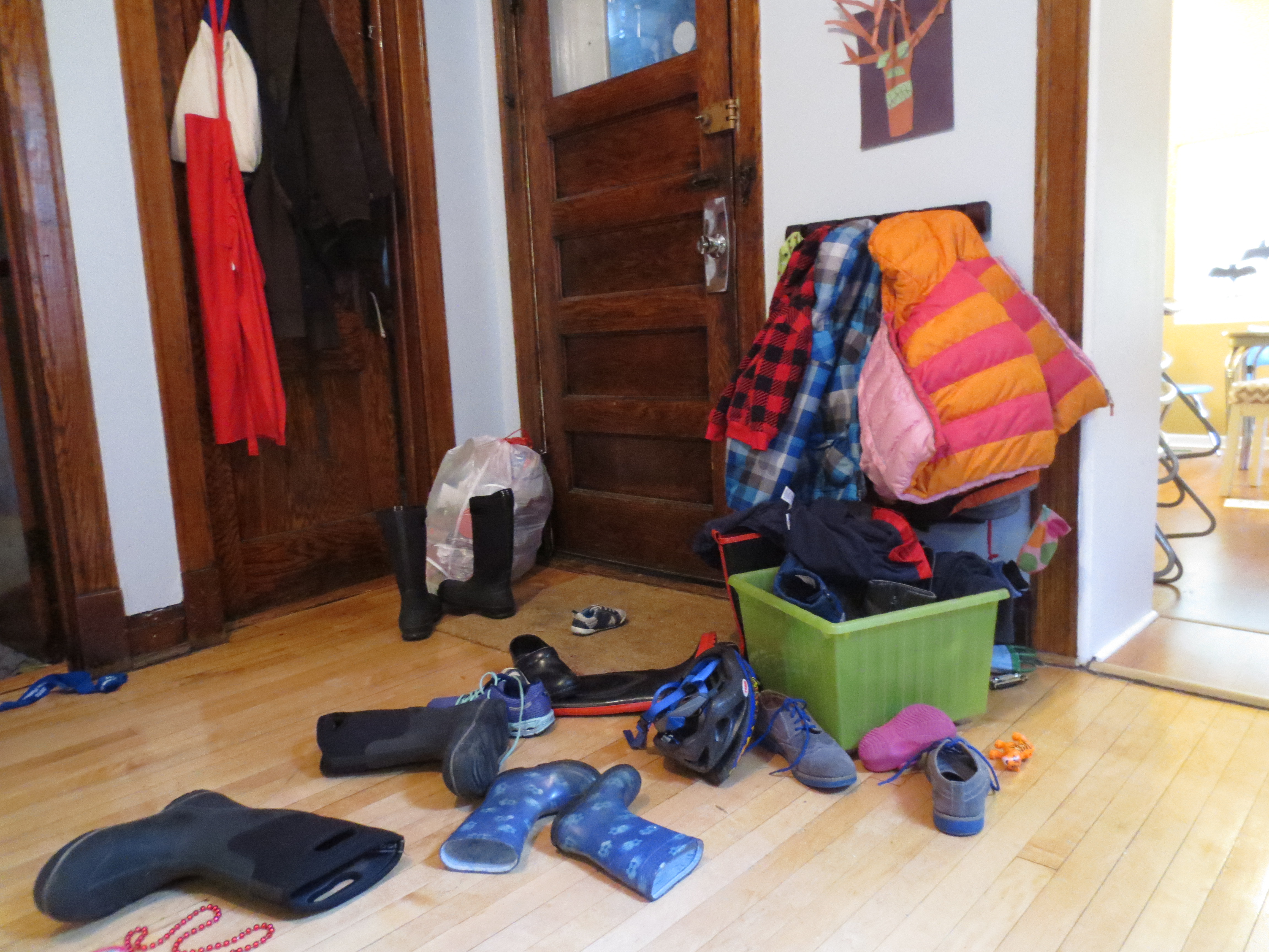 And that’s just in the summer. Winter came early this year in Chicago — around August 12 —  and now the family is shedding piles of boots, hats, coats, and gloves by the back door. Here’s an uncensored “before” shot: