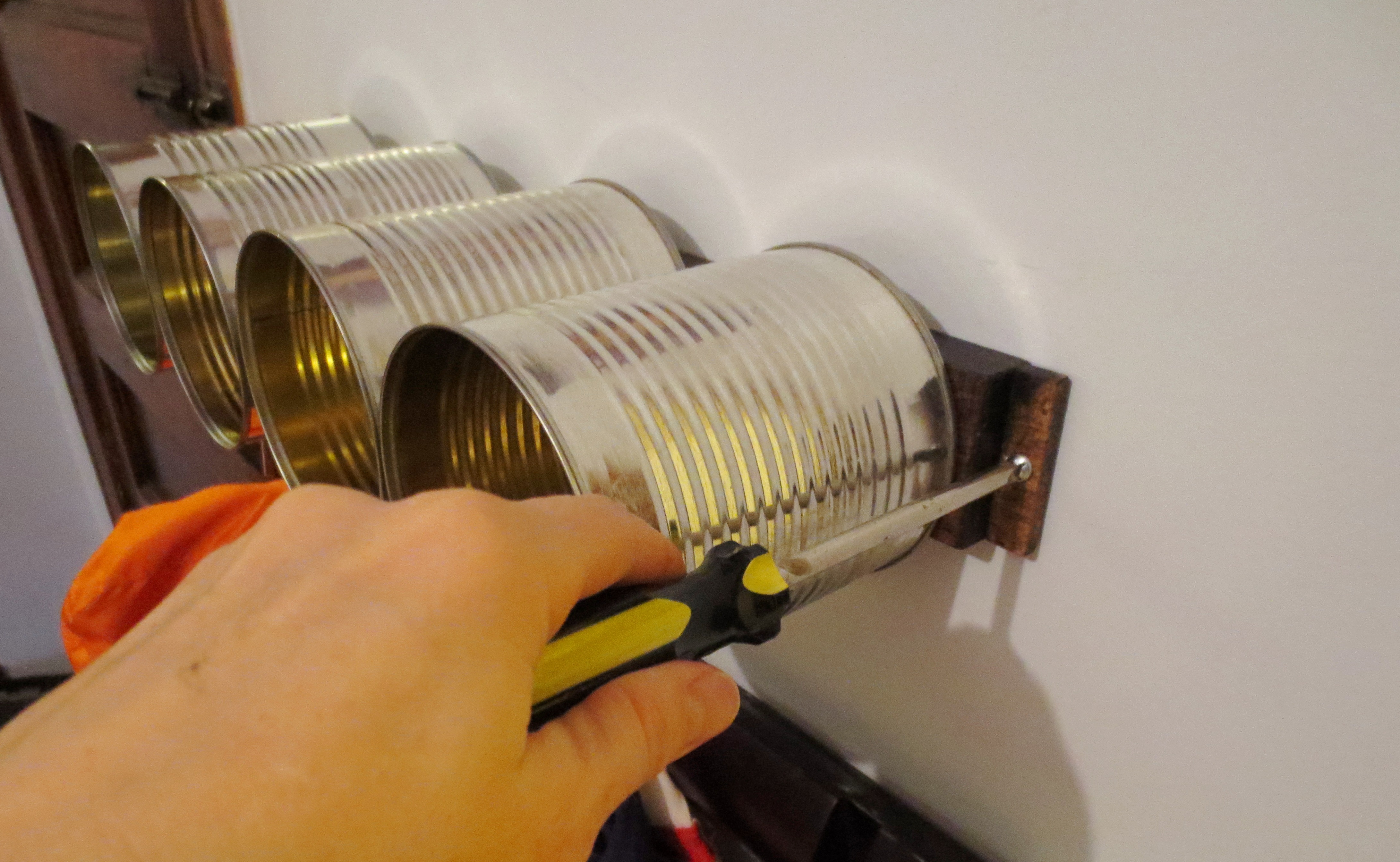 Pick a spot on the wall to screw your cans to. My sweet spot was just above the younger children’s coat rack: easy enough for everyone to reach, but not low enough for the little ones to hang from, or use as a climbing device.