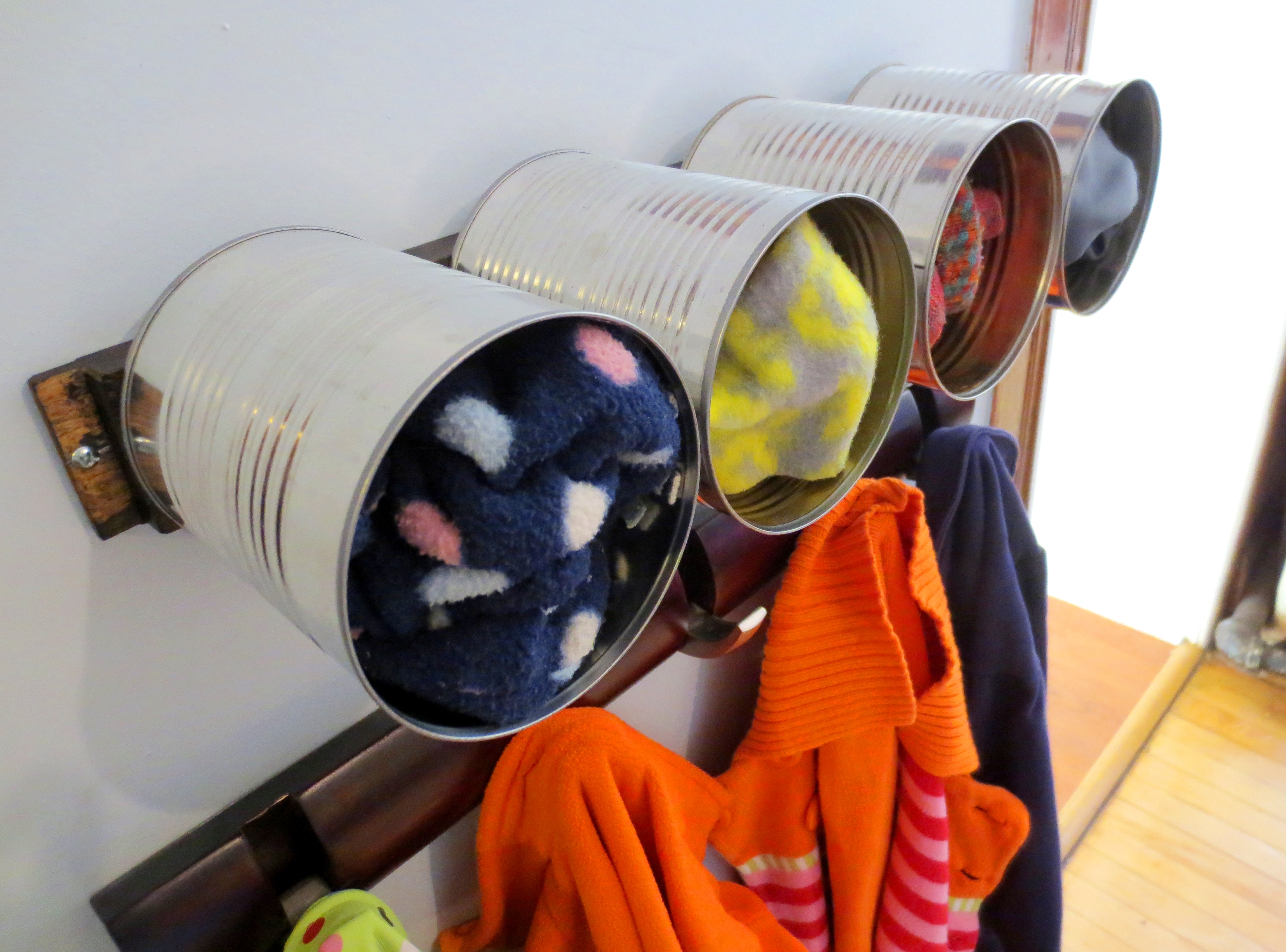 IMG_2872Desperate for relief, but short on both cash and space, I concocted a Hat-and-Glove Storage Center to absorb some of the overflow. The Storage Center has two main ingredients, both recycled: Tin Cans and piece of scrap wood.