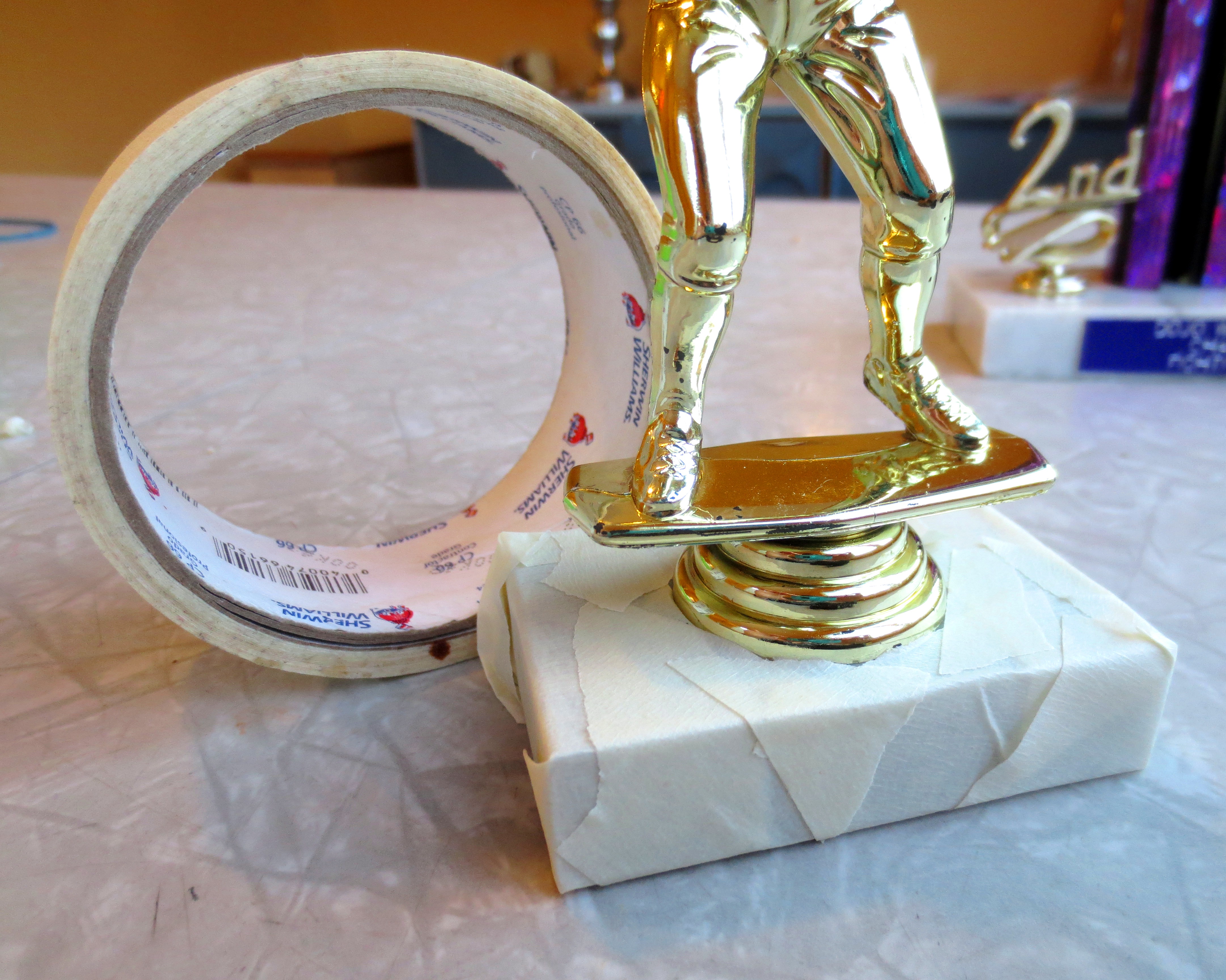 STEP TWO — PAINT: Now we’re going to paint the gold parts of our trophies white, because white makes anything seem more modern and sophisticated. Cover the base of the two smaller trophies in masking tape.