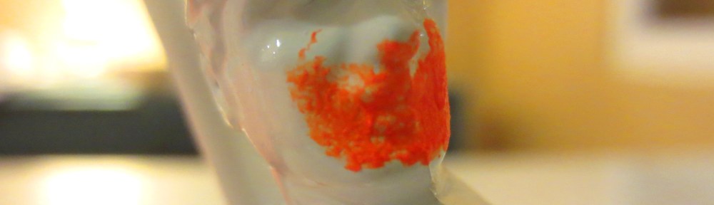 Next, spray some orange paint into the lid of a jelly jar, and use a cotton swab to smear orange around the figure’s mouth and hands, symbolizing a frenzied binge on orange-hued snacks.