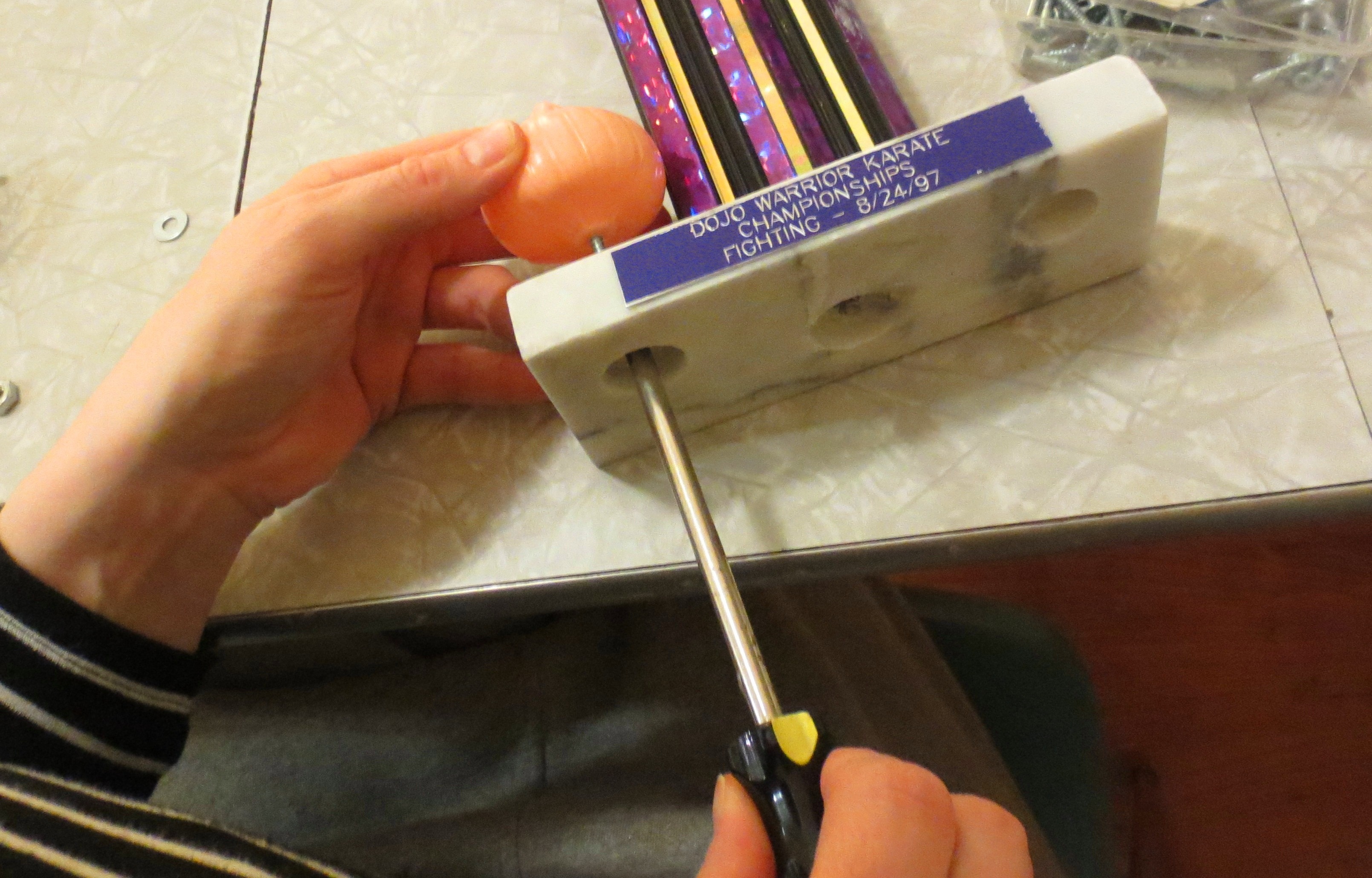 For the “Best Overall” trophy, unscrew the “97” and “2nd Place” icons from the base (but hold on to them for future jewelry projects!). Grab your kids’ toy pepper and onion. Going through the existing hole in the base, push the sharp end of a wood screw through the bottom of your onion. Secure the head of the screw with a washer and screw until the onion is tightly attached to the base.
