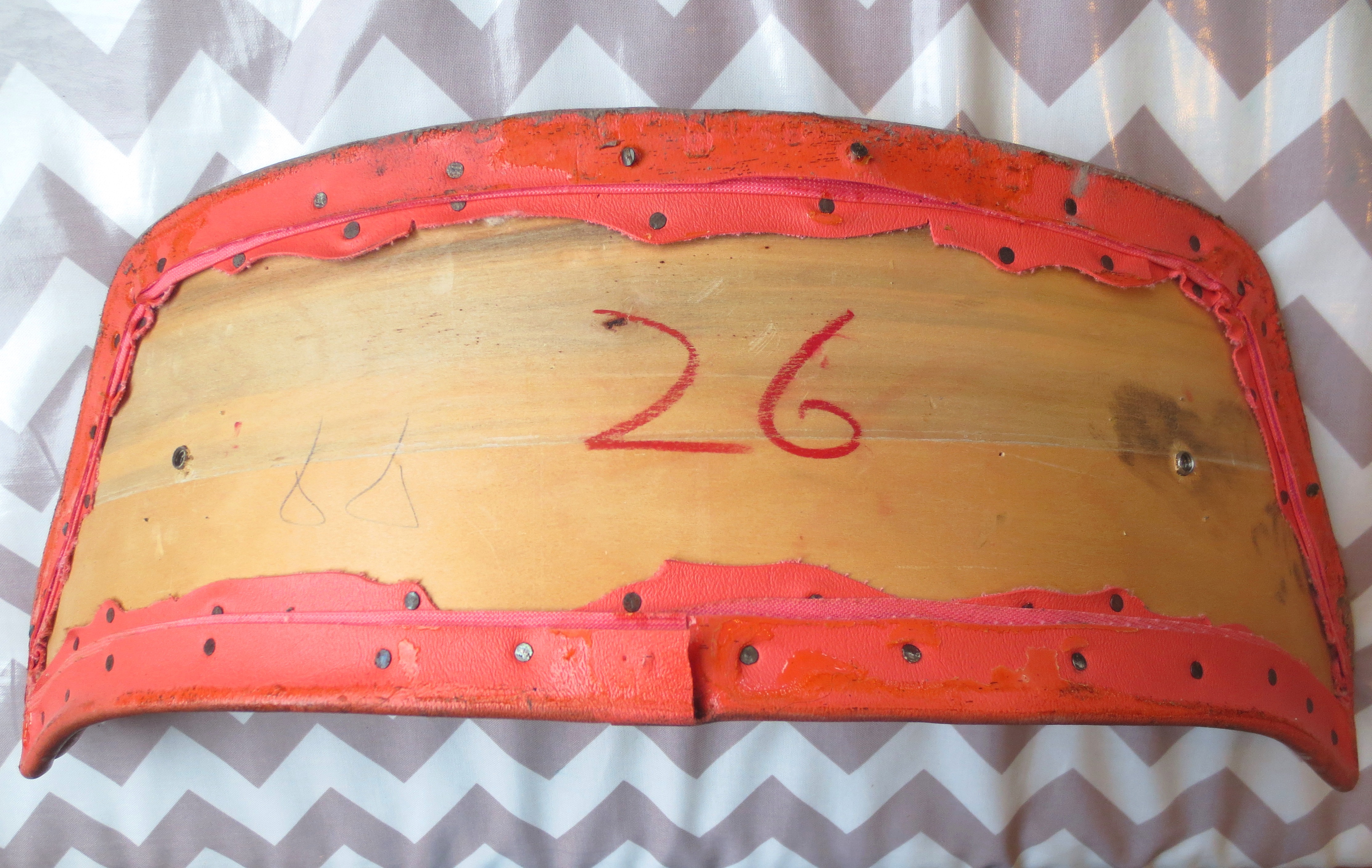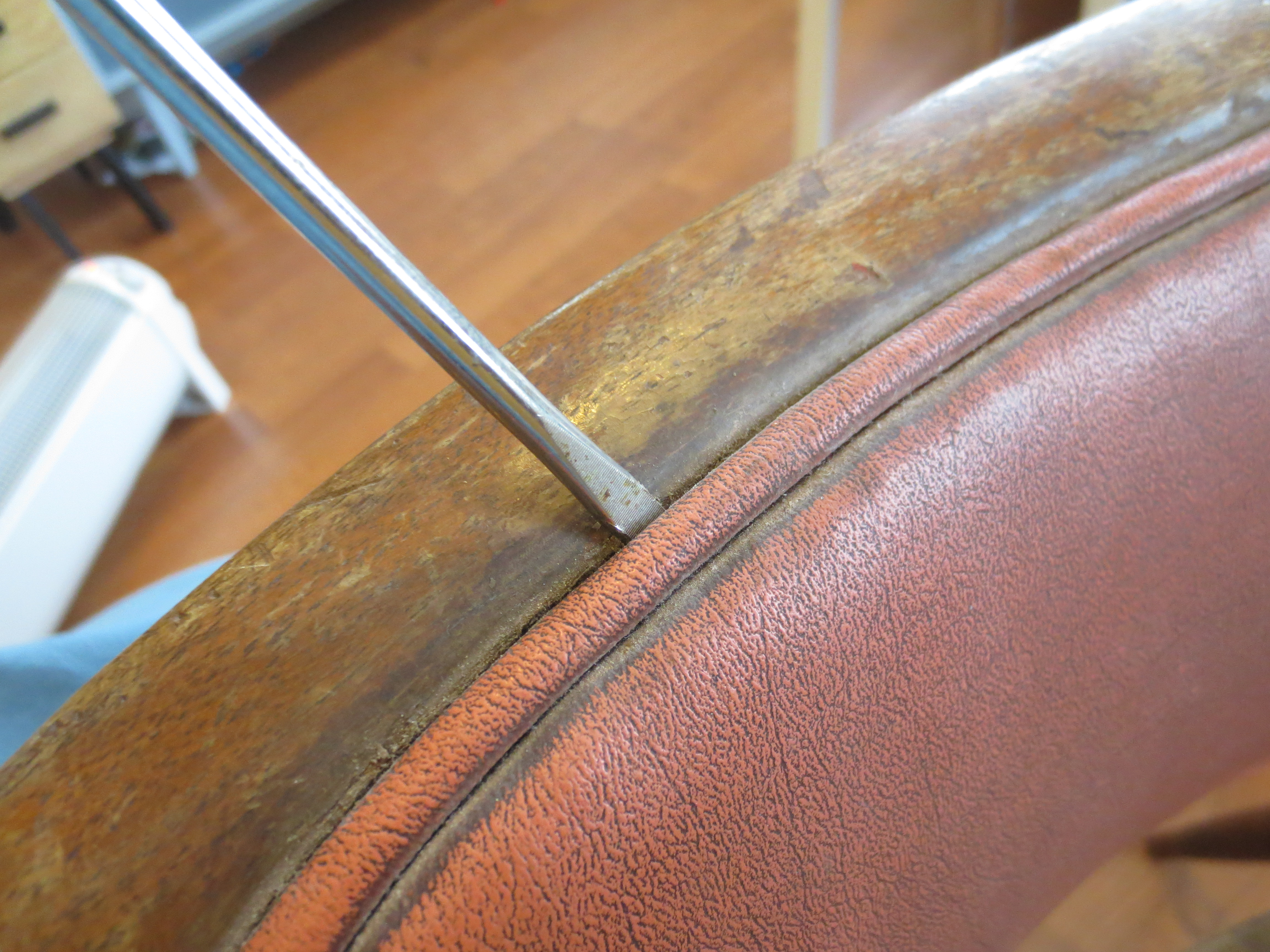 STEP ONE – SEAT BACK CUSHION: This chair’s vinyl cushion was mostly intact, but so permanently filthy that it can only be described as “Dirty Cow Tongue.”**