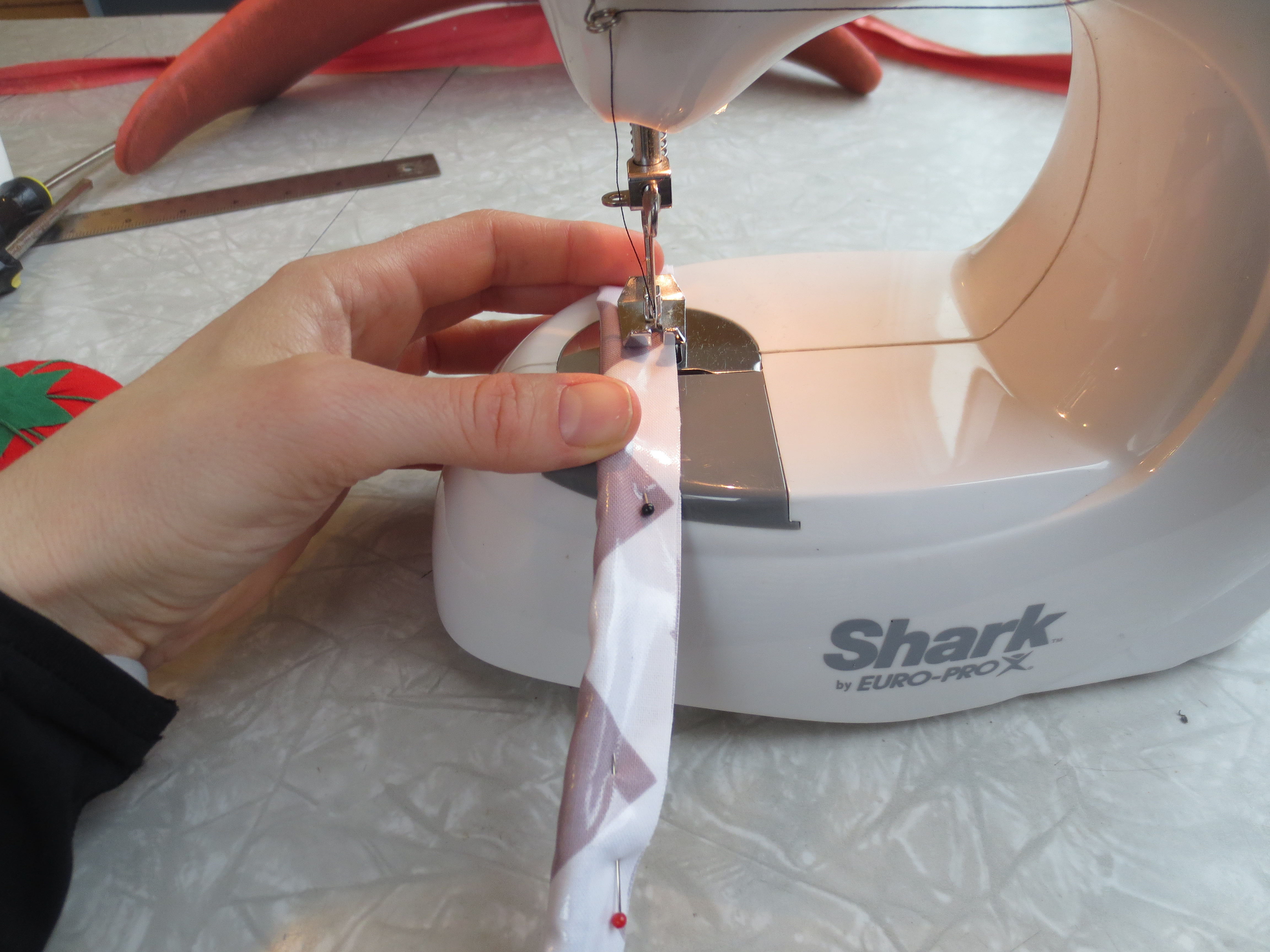 Wrap the new fabric around the cord like a taco, pin it in place and then sew it together. Put aside for a moment.