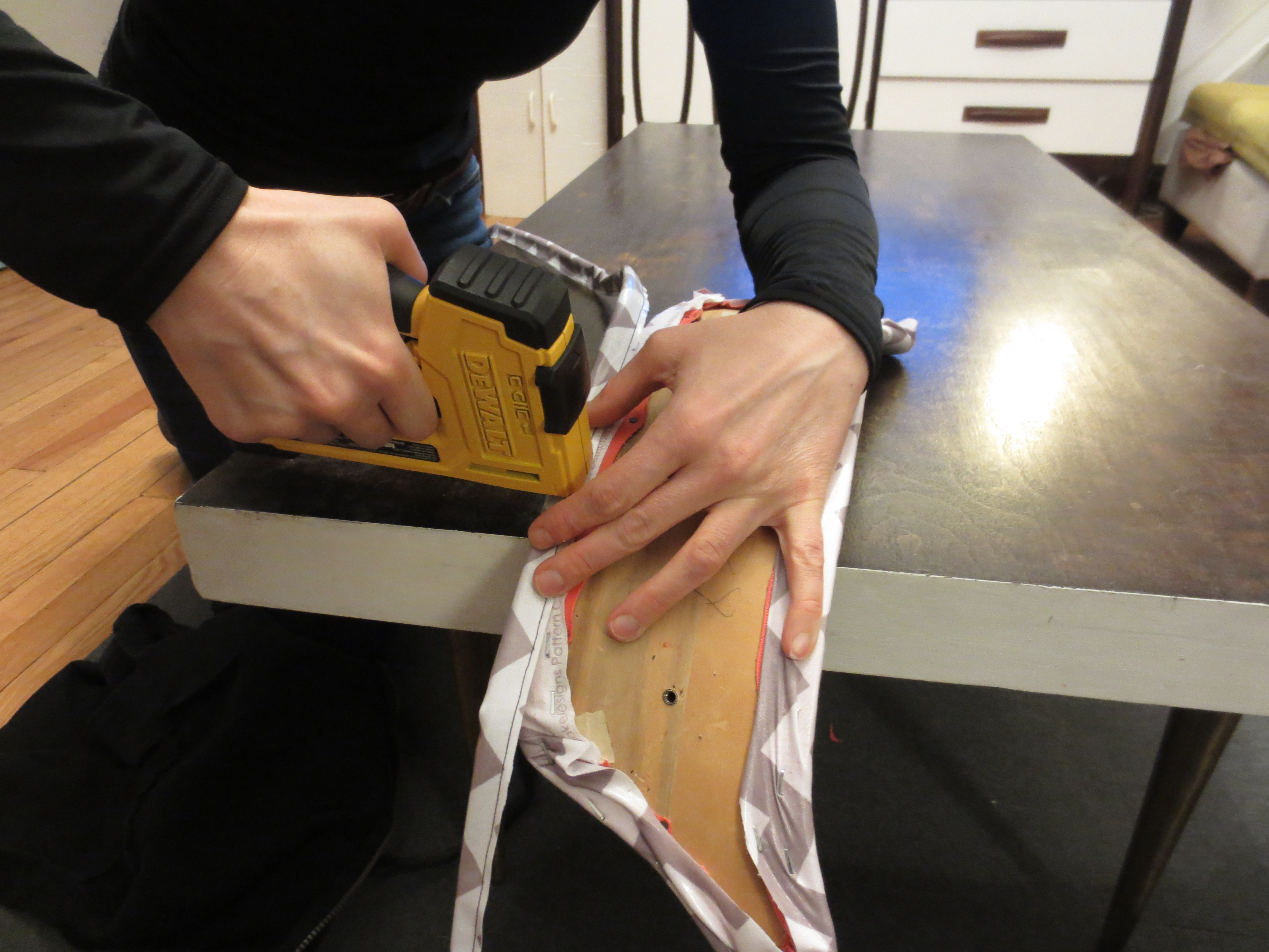 Starting in the center and moving out towards the ends, staple the fabric VERY TIGHTLY to the back of the cushion. Since this cushion has a curve in the middle, it was tricky to staple it on without unsightly bunching. Just keeping pulling tighter and stapling harder, making sure to throw in some swear words for your effort.
