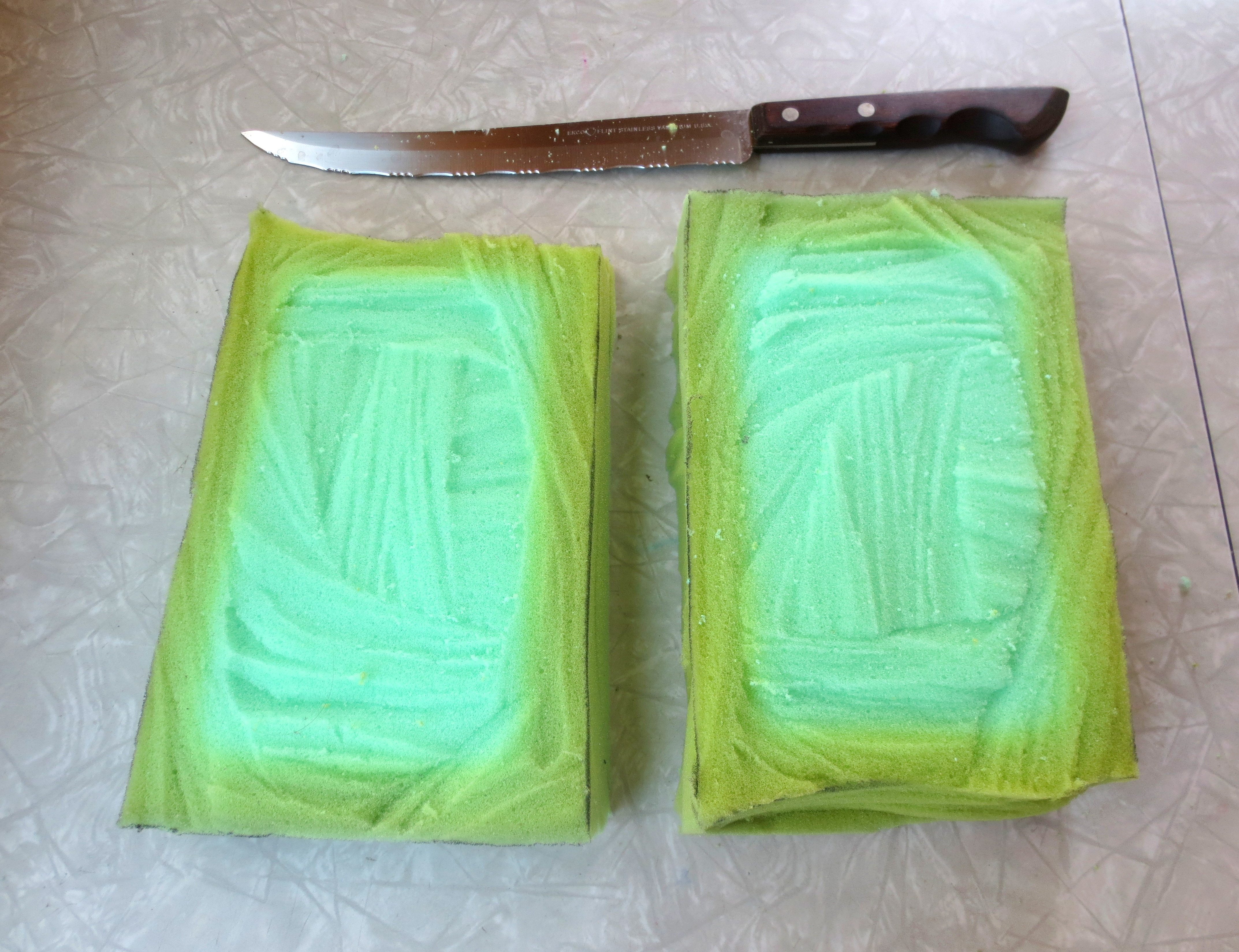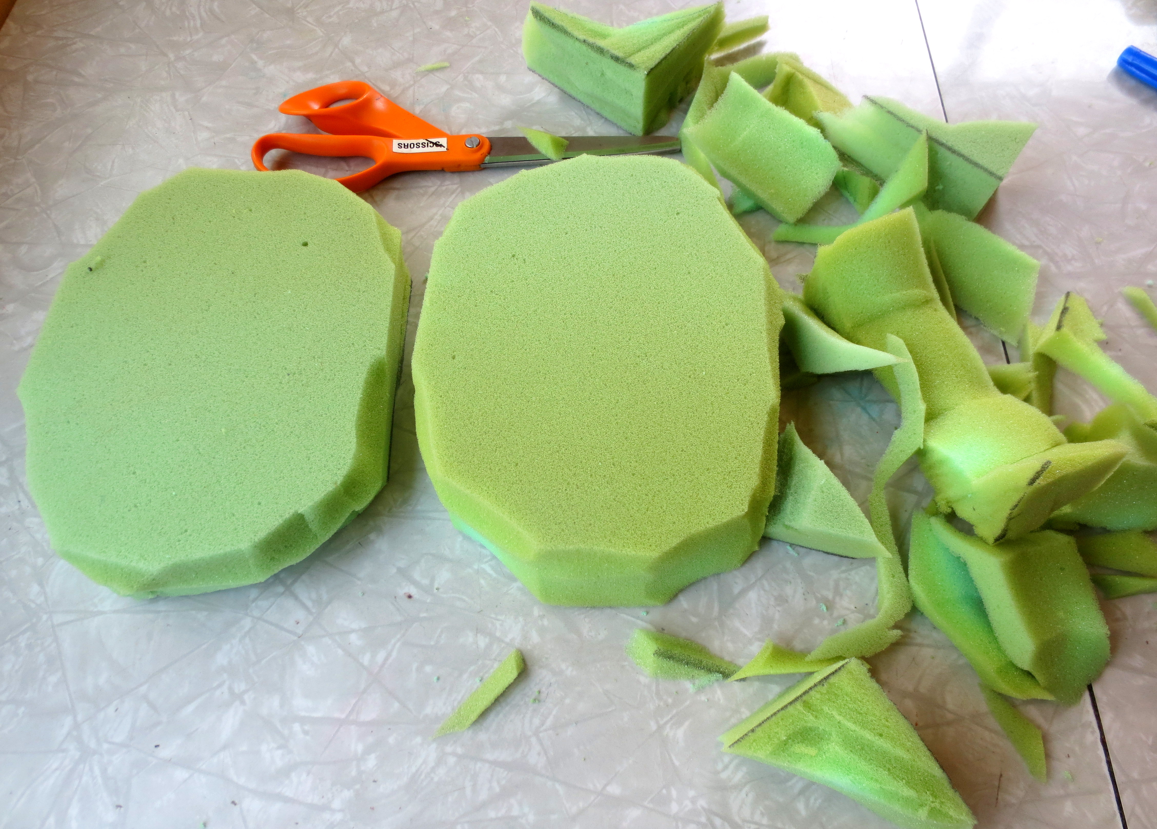 STEP ONE – SCULPT THE PADS:  I happened to have a few big chunks of 4-inch foam laying around. I found it in the alley last year, and already used a big piece of it to recover my IKEA bench. Four inches is too thick for knee pads, so I first cut it in half using a scary kitchen knife of unknown origins.