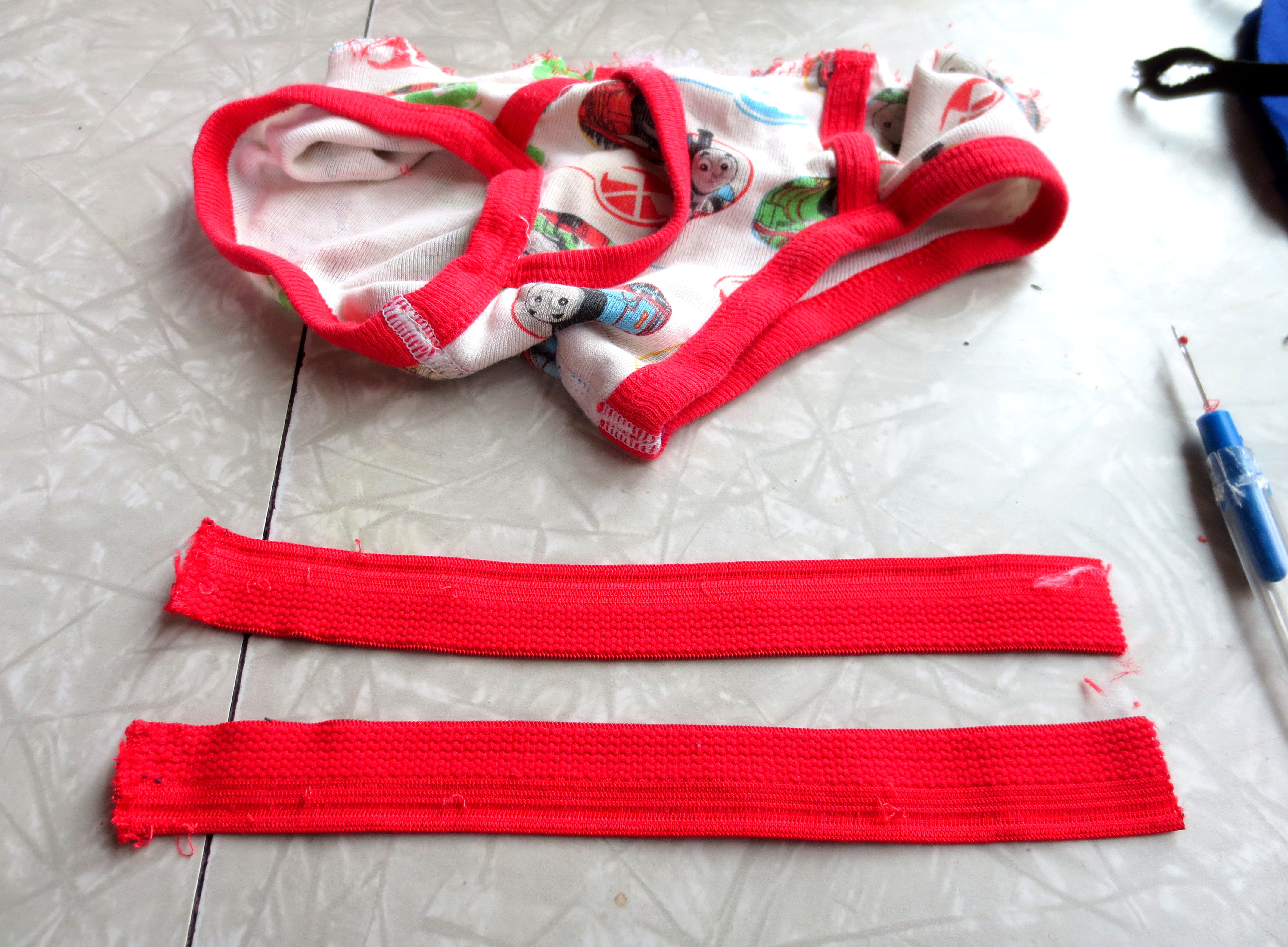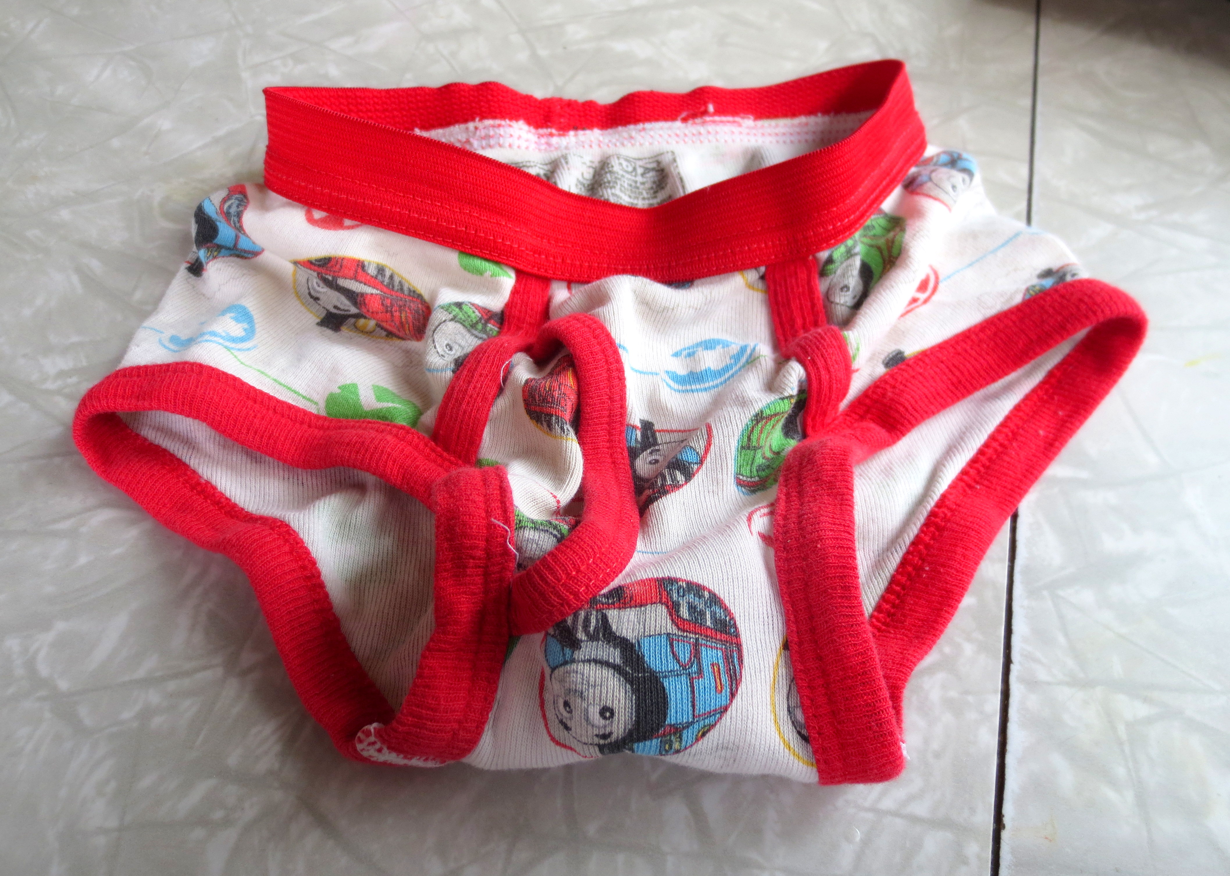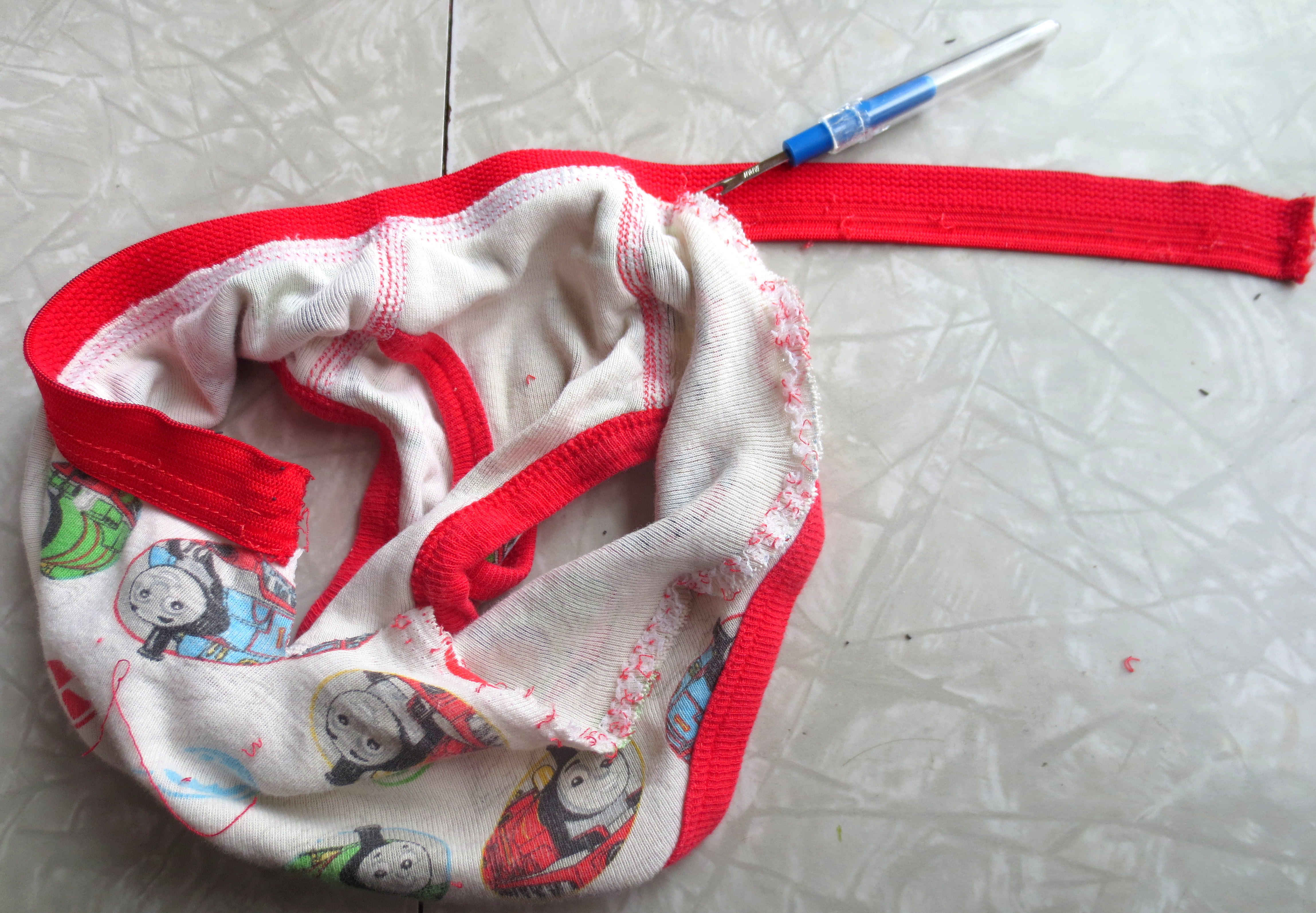 IMG_3959STEP THREE – MAKE A STRAP OUT OF TODDLER UNDERWEAR: And you thought this project couldn’t get any more sophisticated! Whenever I need to add a touch of class, I just reach in my toddler’s underwear drawer. These undies were actually hand-me-downs from some other kid.