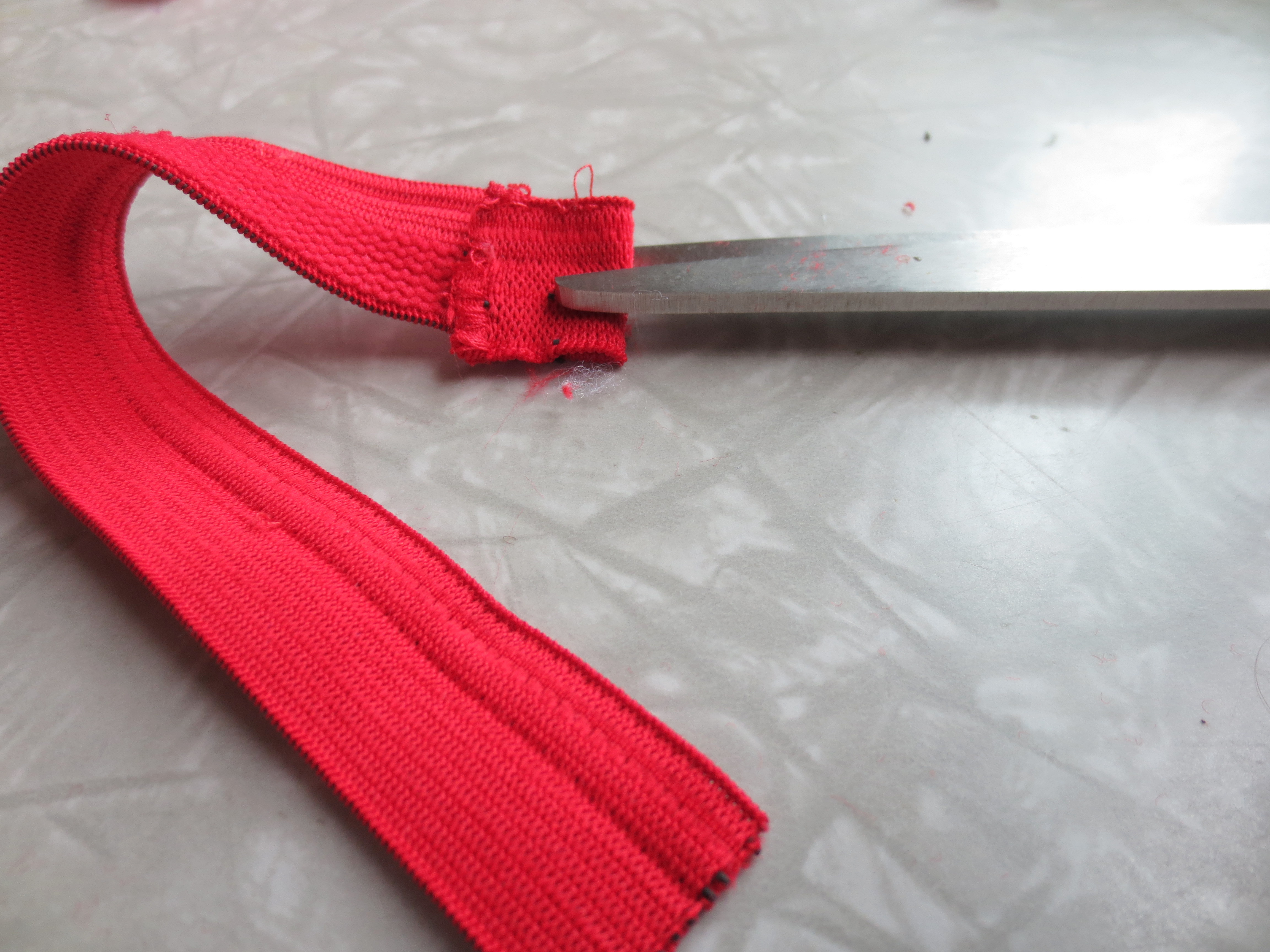 IMG_3966The waistband is the perfect width for my knee-strap, and that bright red elastic will really pop against the deep blue of the cushion. Carefully liberate the waistband using a seam ripper.