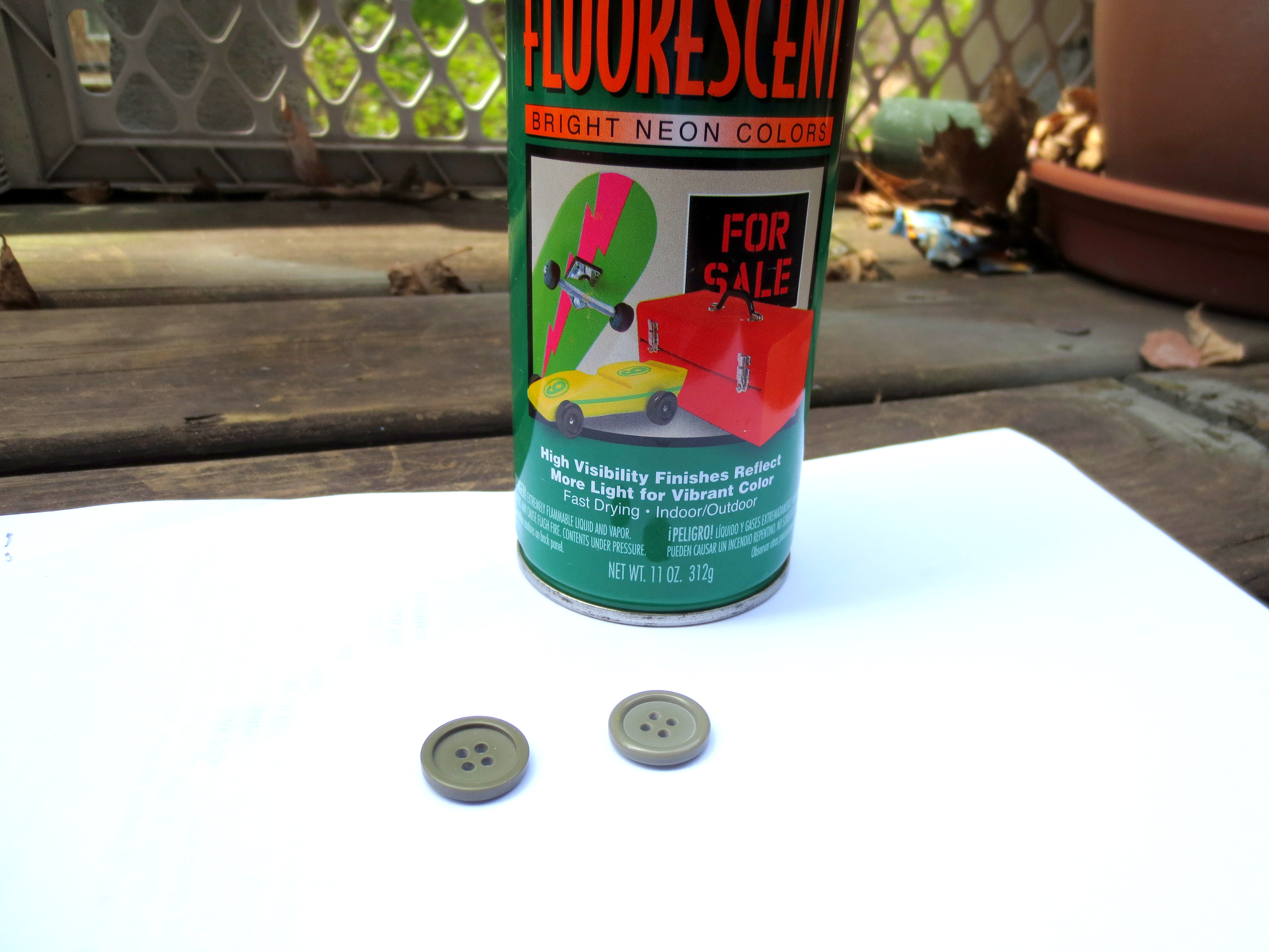 IMG_3980STEP FIVE – FINISHING TOUCHES: I was lucky enough to inherit my grandfather’s button collection,*** so I just grabbed a couple of mid-sized buttons and headed out to the porch with a can of bright orange spray paint. I mean, at this point, why not?