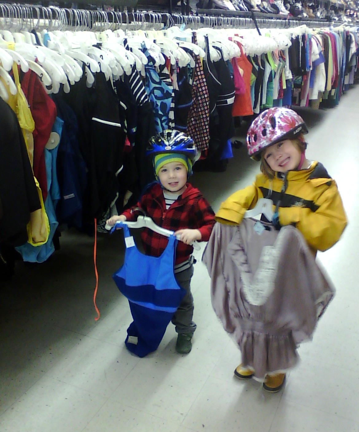 IMG_3957STEP TWO – SWIMSUIT SHOPPING:  If your inner-Cathy is saying “ACK!” to the idea of swimsuit shopping, just relax.  An old swimsuit provides the ideal fabric for floor scrubbing knee pads. It’s soft and smooth, so it won’t scratch the floor, and it can dry quickly. Plus, it’s stretchy and forgiving (just like Mom!). If you don’t have an old suit ready to sacrifice, pack up the kids and hit the thrift store. Luckily, it’s the season for used swimwear shopping. Pick a color or pattern that will hide dirt stains — no whites or pastels.