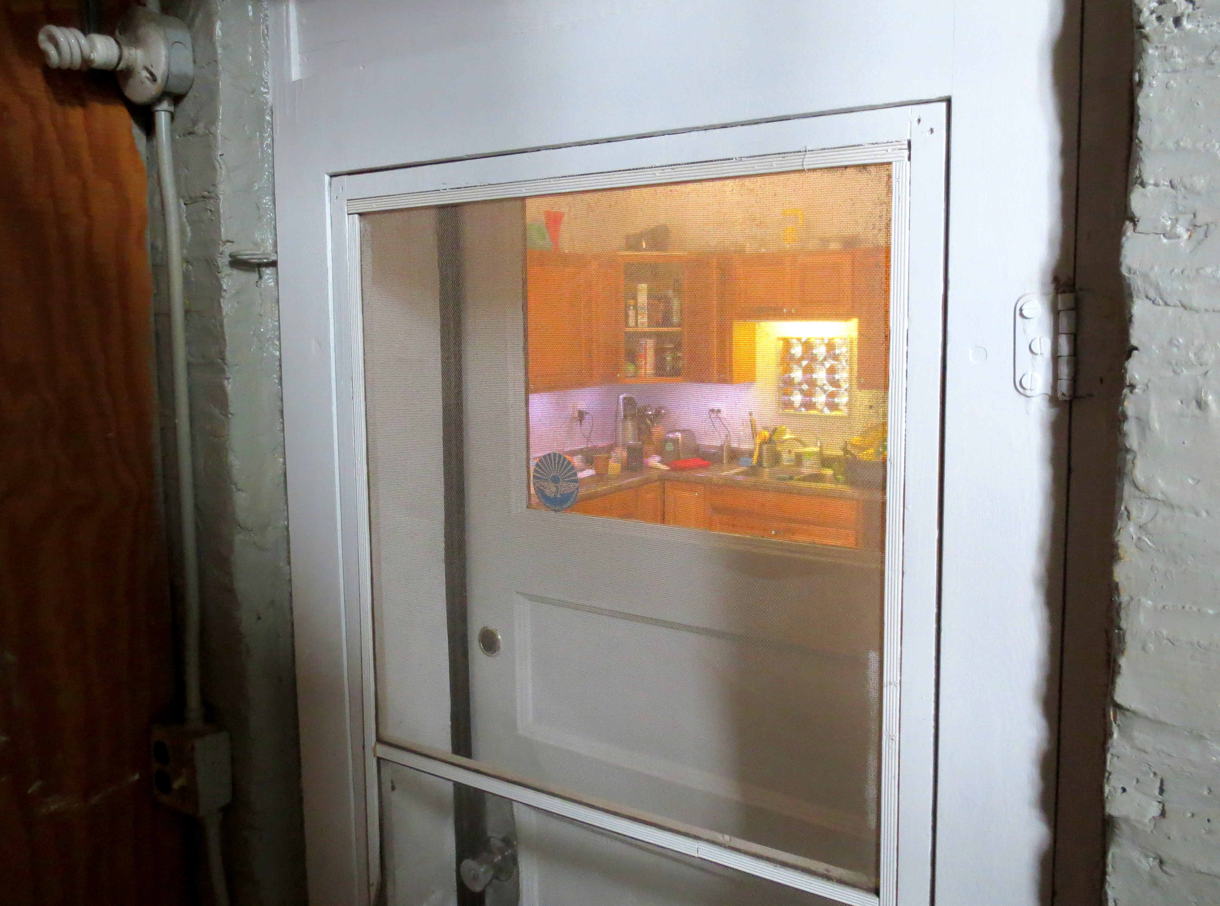 As I cooled off, I wandered into the kitchen to reheat some coffee. Before I could press the “quick minute” button on the microwave,* I heard loud footsteps just outside the kitchen door. I scampered away to the modesty of my bathrobe. My upstairs neighbor was tromping down the back stairs with his laundry, and came within seconds of getting a show through our kitchen door window. Here’s his view: