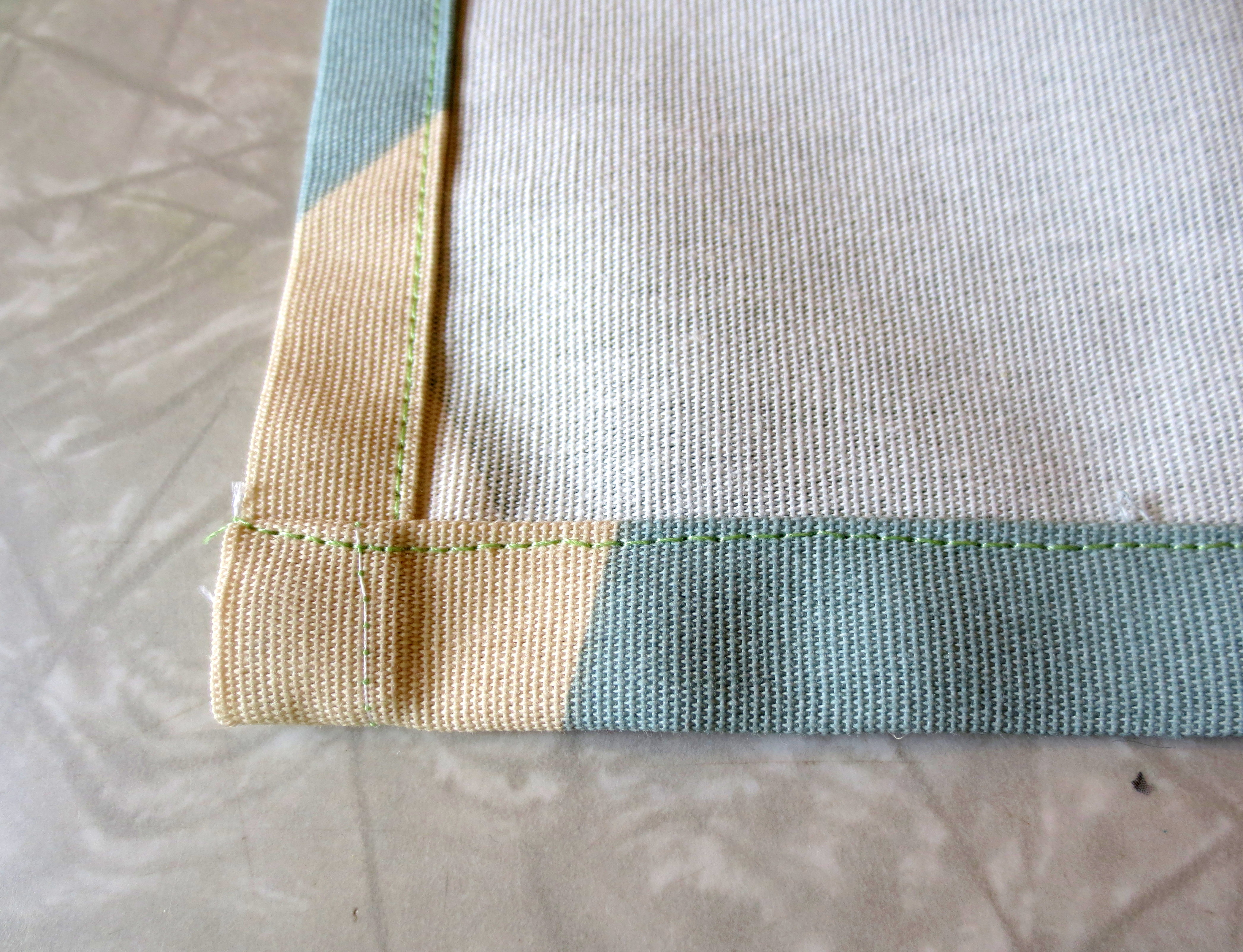 Back to the ironing board, and repeat the steps above (fold and iron, fold and iron, pin and sew) to create the same hem for your bottom edge. Take it to the sewing machine and connect it to your sides. The bottom corner should look like this: