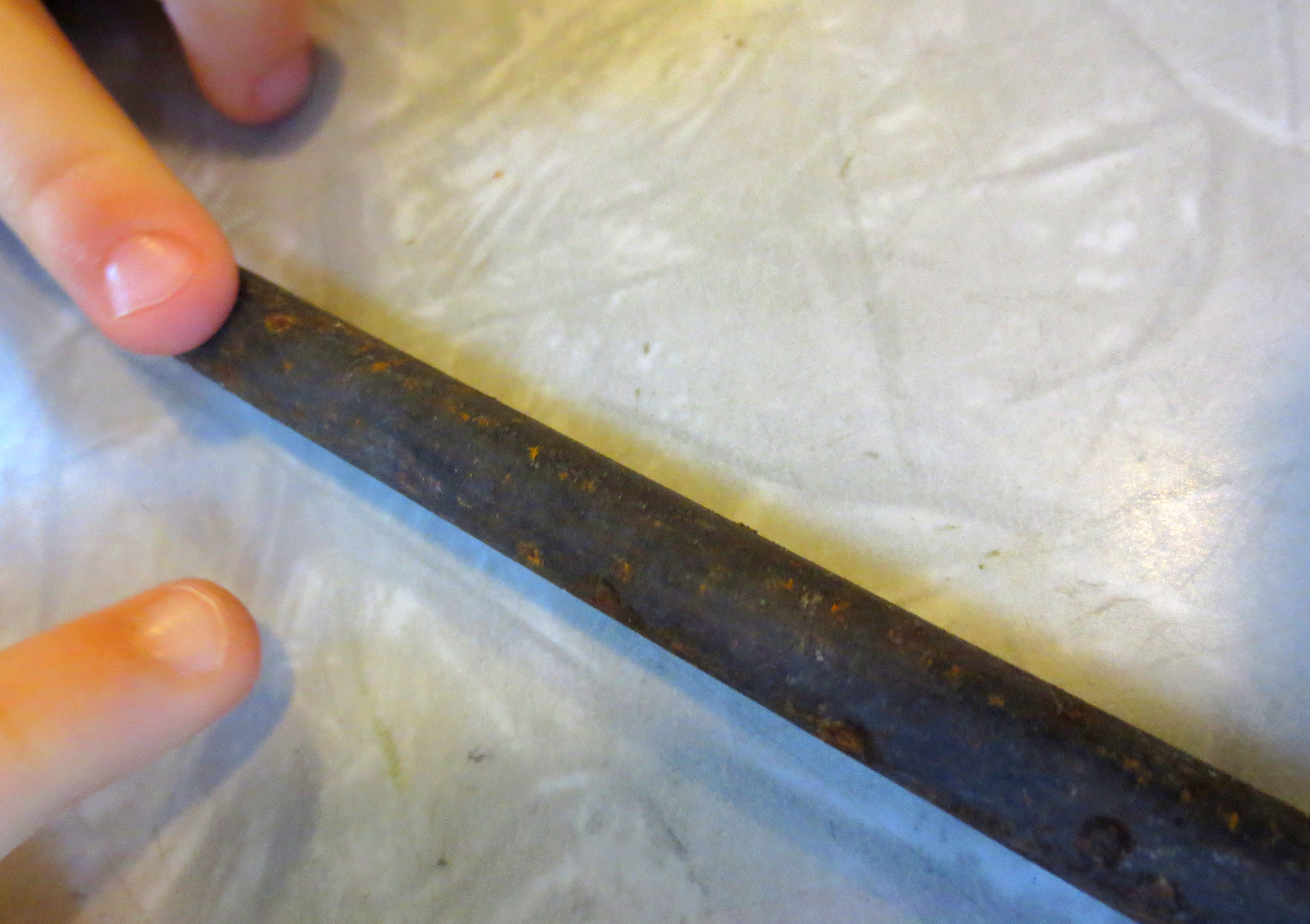 Now, this project wouldn’t be complete without me dragging some garbage into the house. Since I didn’t have an actual curtain rod, I grabbed this rusty “tetanus rod” out of a weed-filled planter in the back yard. I’m guessing my landlord left it back there ten years ago: