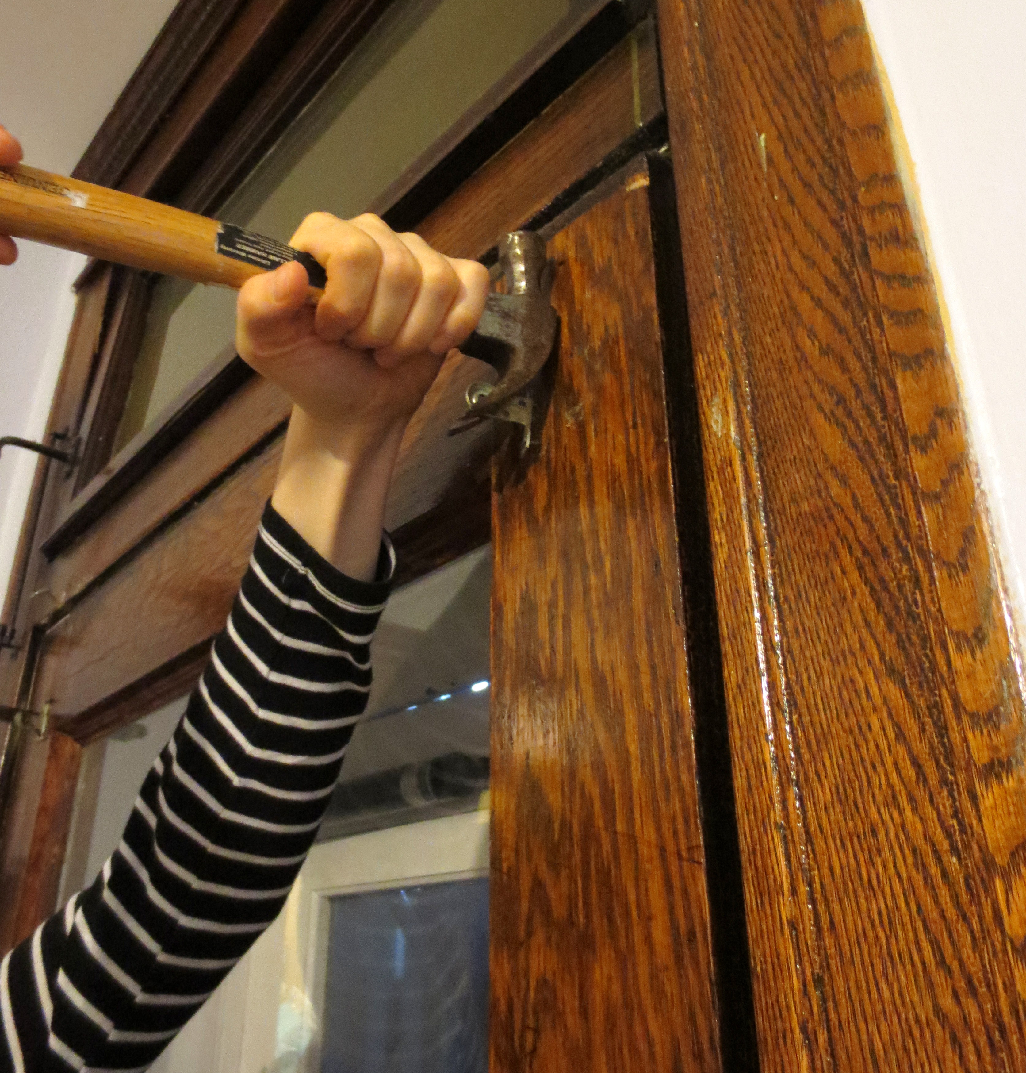 STEP THREE – HANG THE ROD: First, I had to pry off whatever strange old hardware was stuck to the back of my kitchen door, which is always kind of fun.