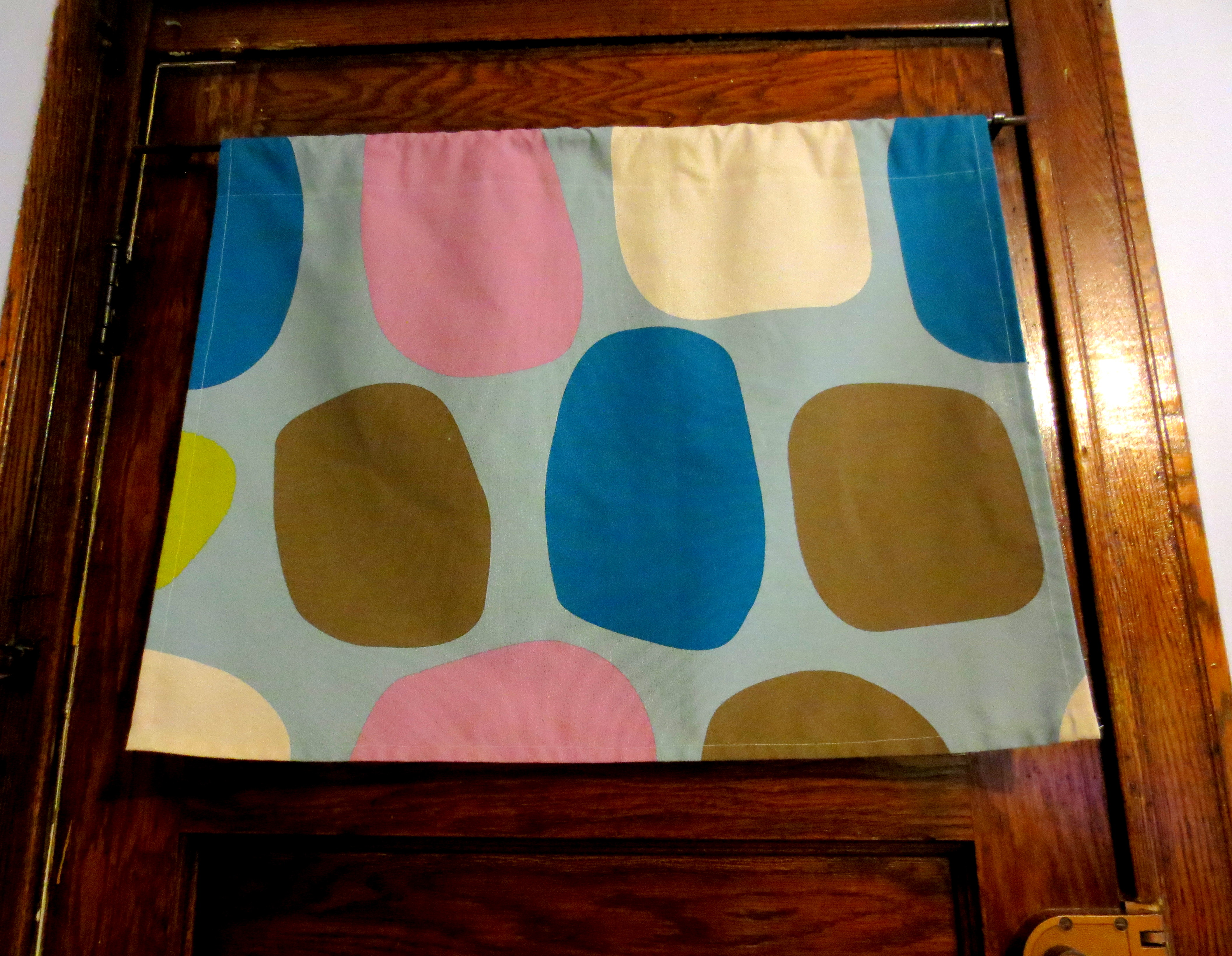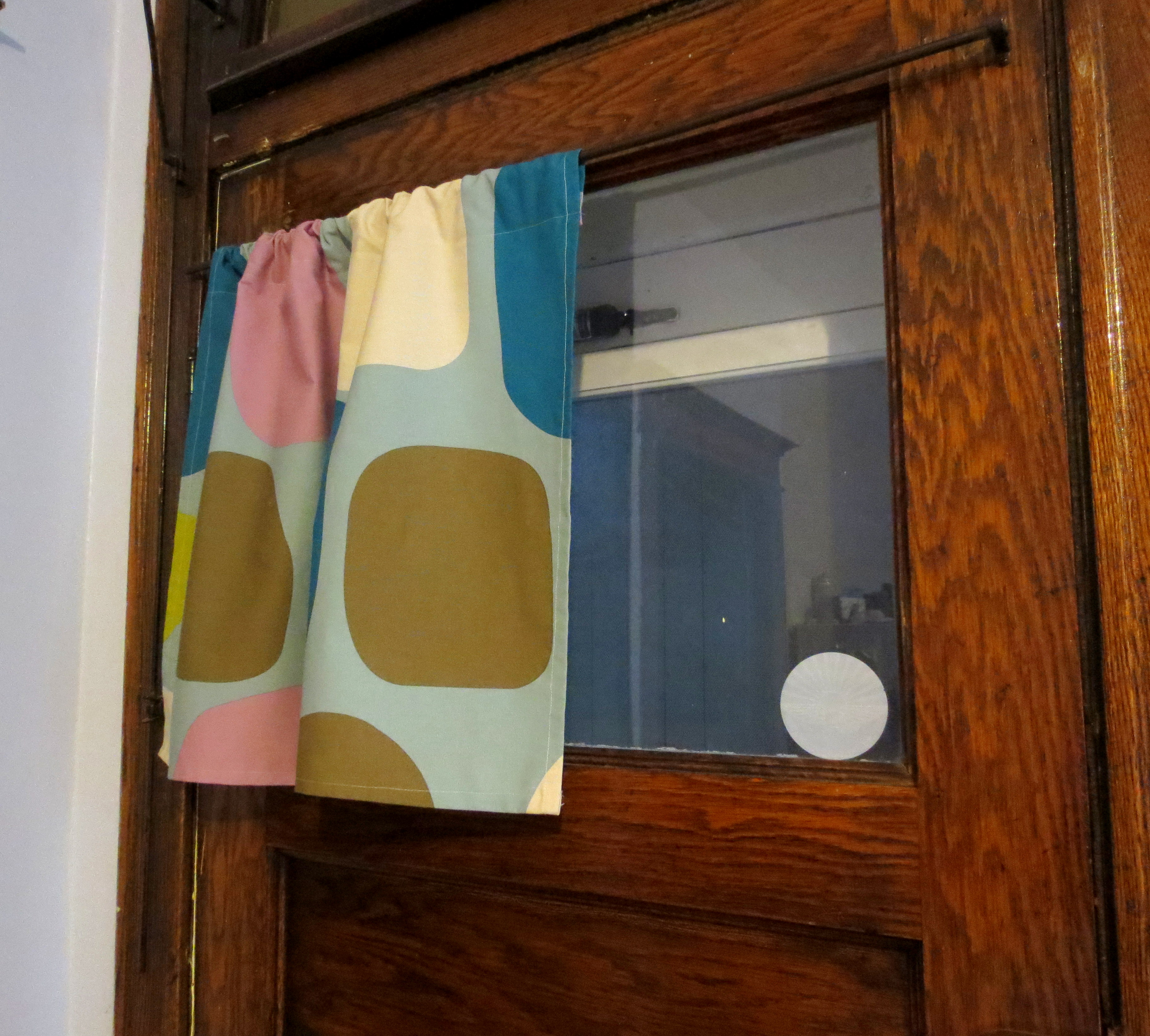 While sipping my stale coffee, I stepped back and thought, Hey, that looks pretty good! The baby blue perfectly matched the walls, the brown made the woodwork pop, and the dark cyan blue even picked up the color of my Bowling Alley Chairs in the dining room. Maybe it was time to get serious about my backdoor modesty!