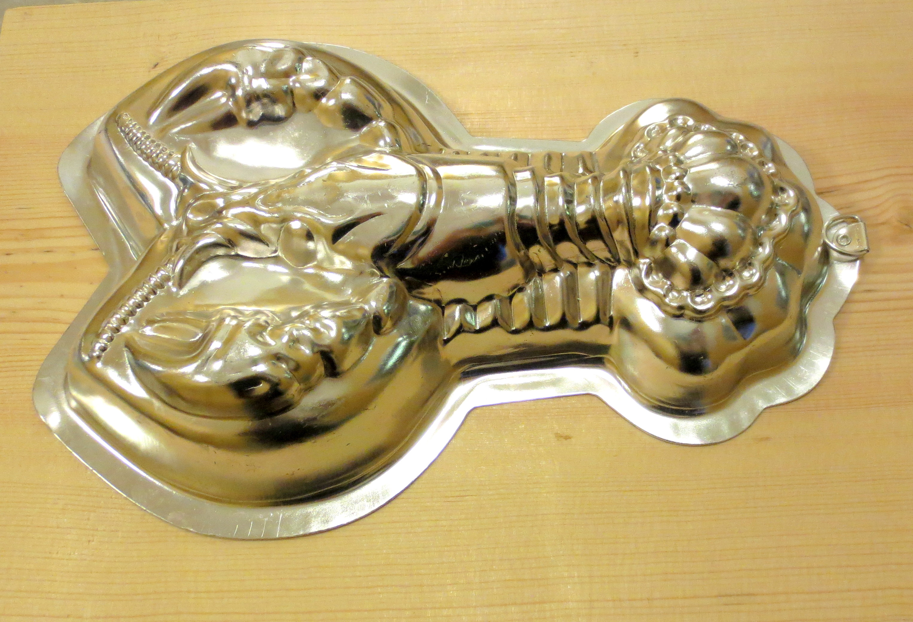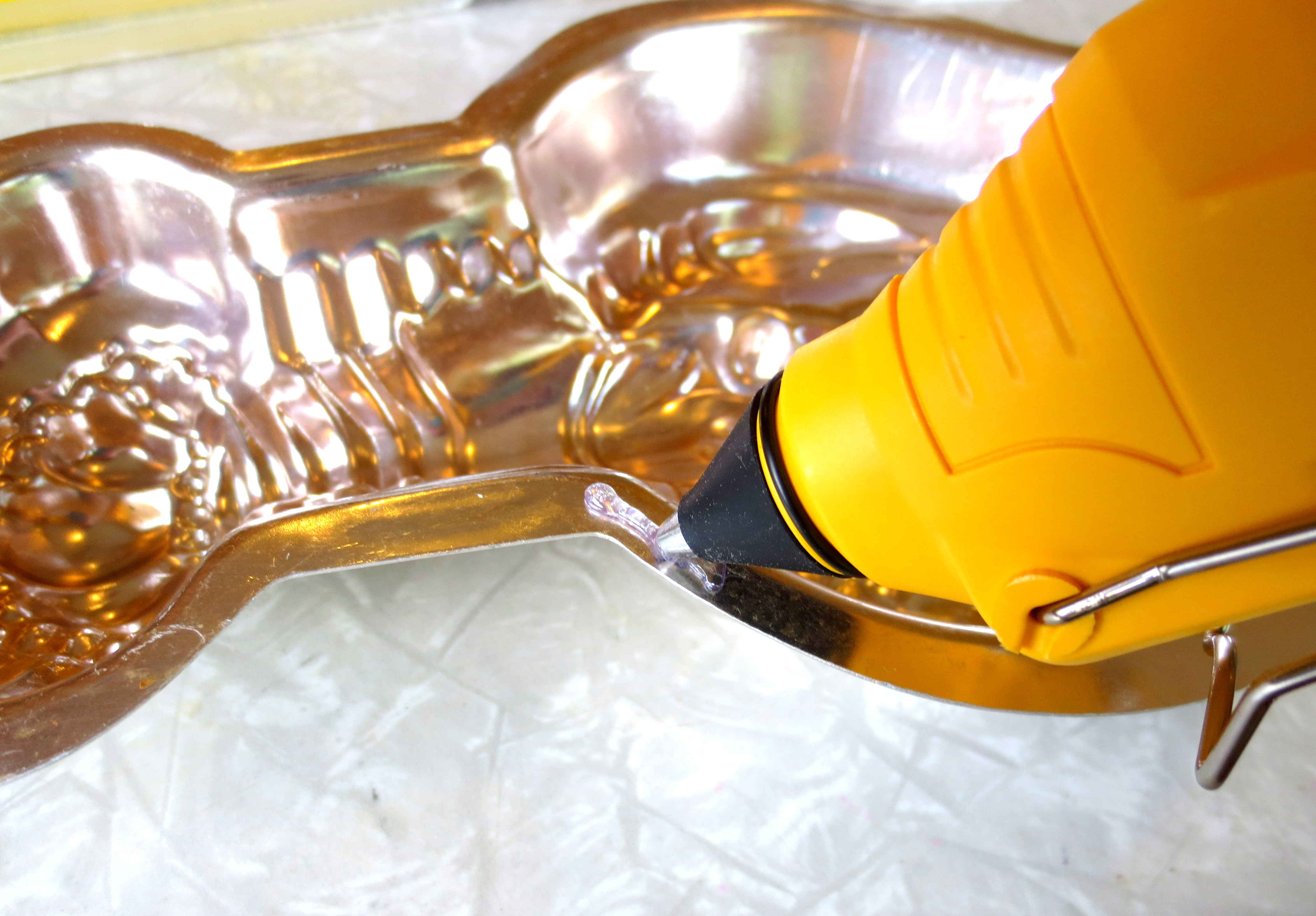 STEP ONE – PREPARE THE MOLD: Head to your friendly neighborhood thrift store and go straight to the corner where they keep all the miscellaneous kitchen trinkets. At our store, the kitchen wares are grouped by material – a shelf each for plastic, wood, metal and appliances. You’ll have to dig around for a few minutes in the metal pile, but you are guaranteed to find at least one or two molds; They are the detritus lurking in the underbrush of the thrift store. This one seems cheerful: