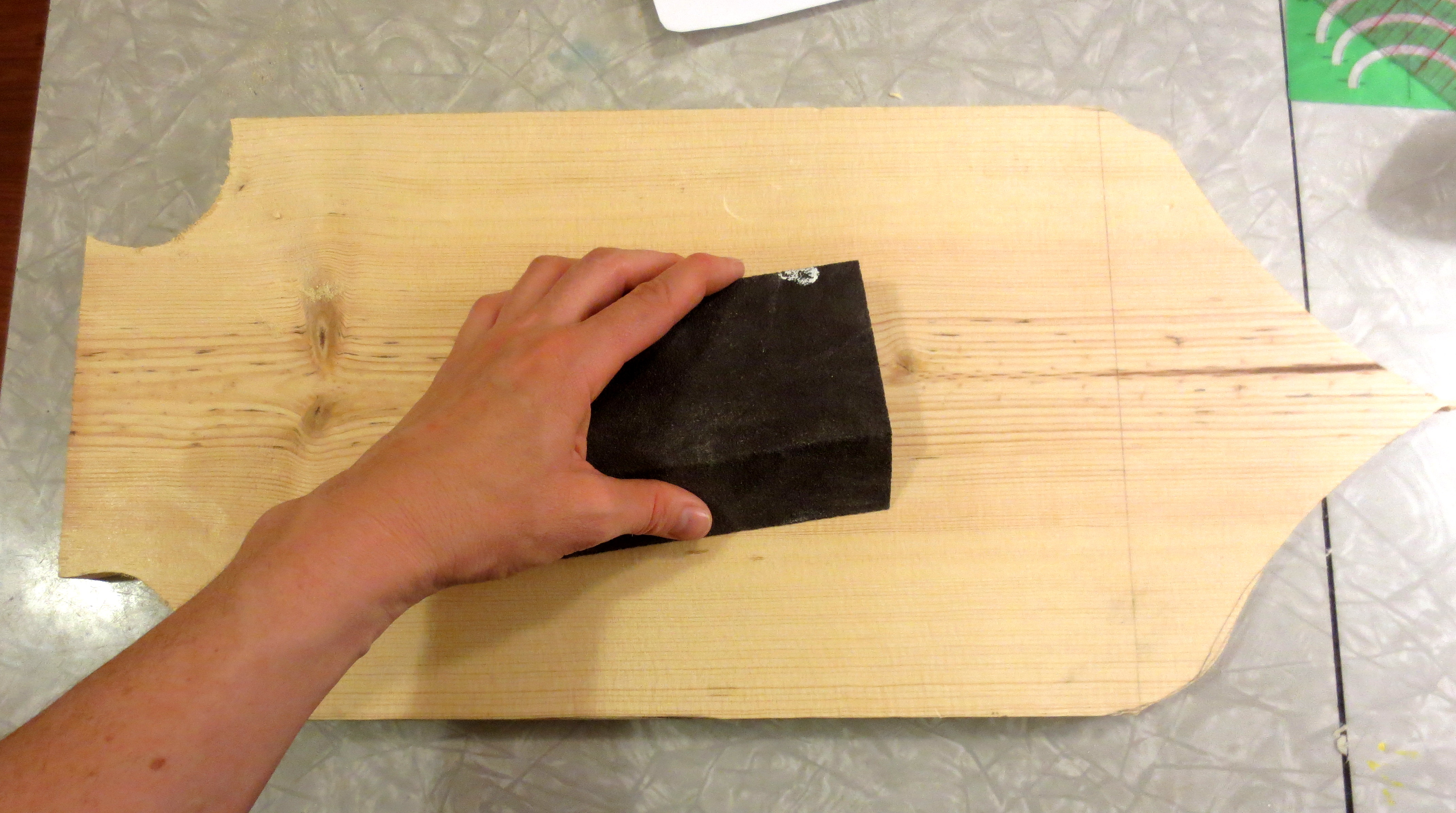 Since my orbital sander was out on loan, I smoothed down my freshly-cut wood with a sanding block, paying special attention to the jagged edges left by the blade.