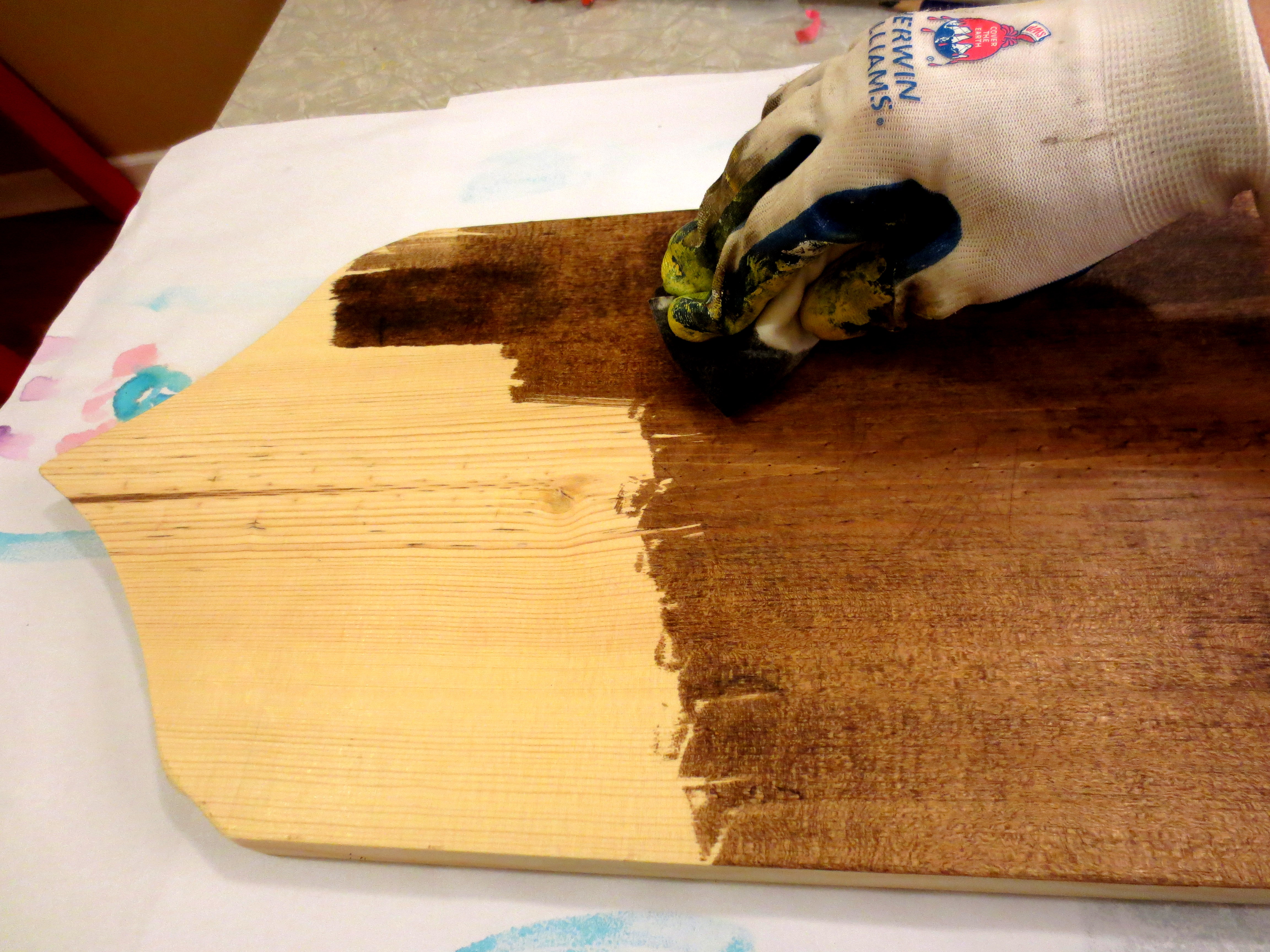 Next, slop on a coat of wood stain with a rag or old baby sock. I used “walnut” flavor – leftovers from the can I bought to refinish the Church Chair.