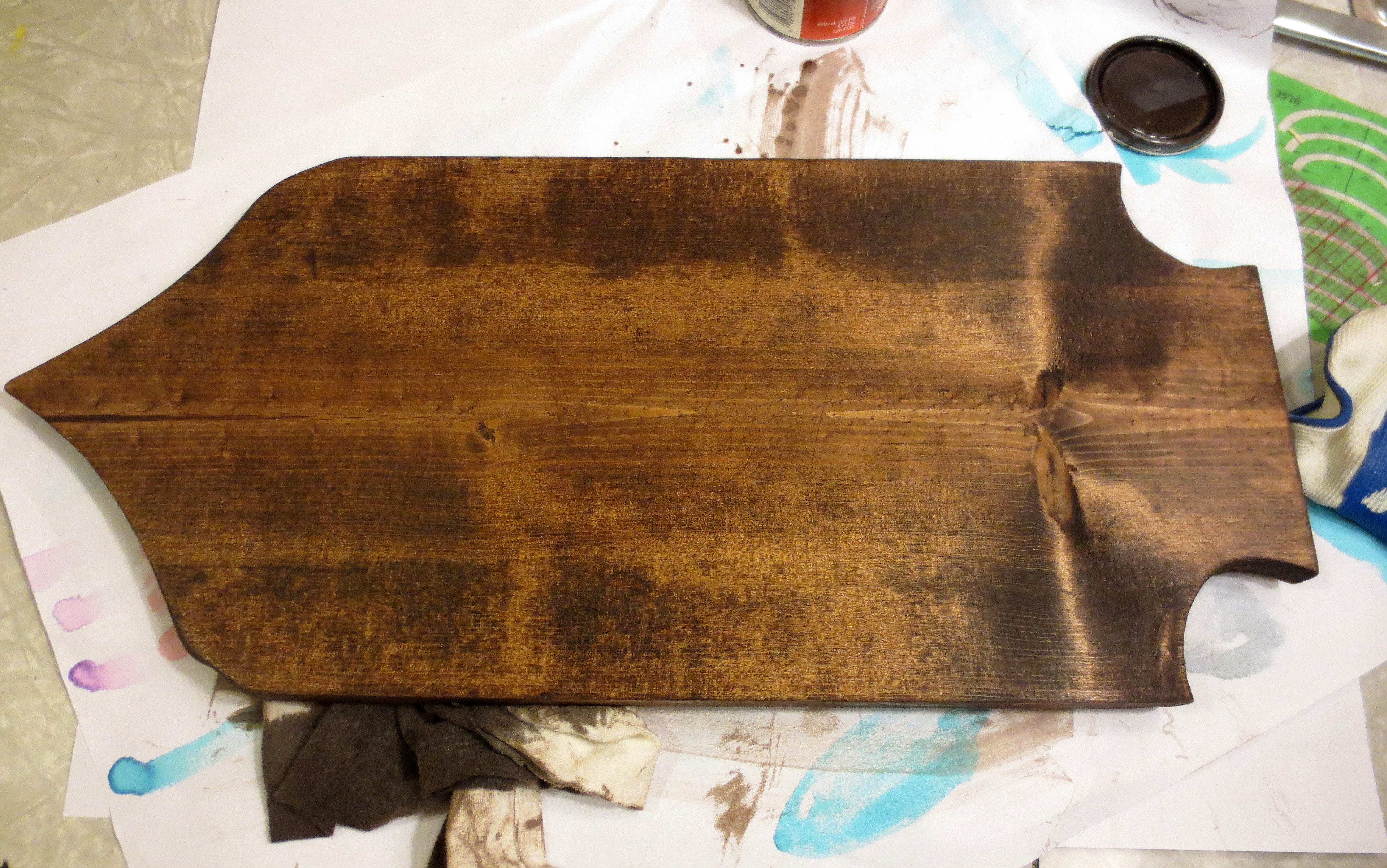 Let the stain sit for about 10 minutes and rub out any remaining wet spots with the rag. Give the stain between 12-24 hours to dry before applying the clear coat. Or, if you’re a big cheater like me, put it in a 150 degree oven for half an hour to speed up drying time. Actually, no, please don’t do that. That’s a terrible idea. Even though 24 hours is a really long time to wait for anything.