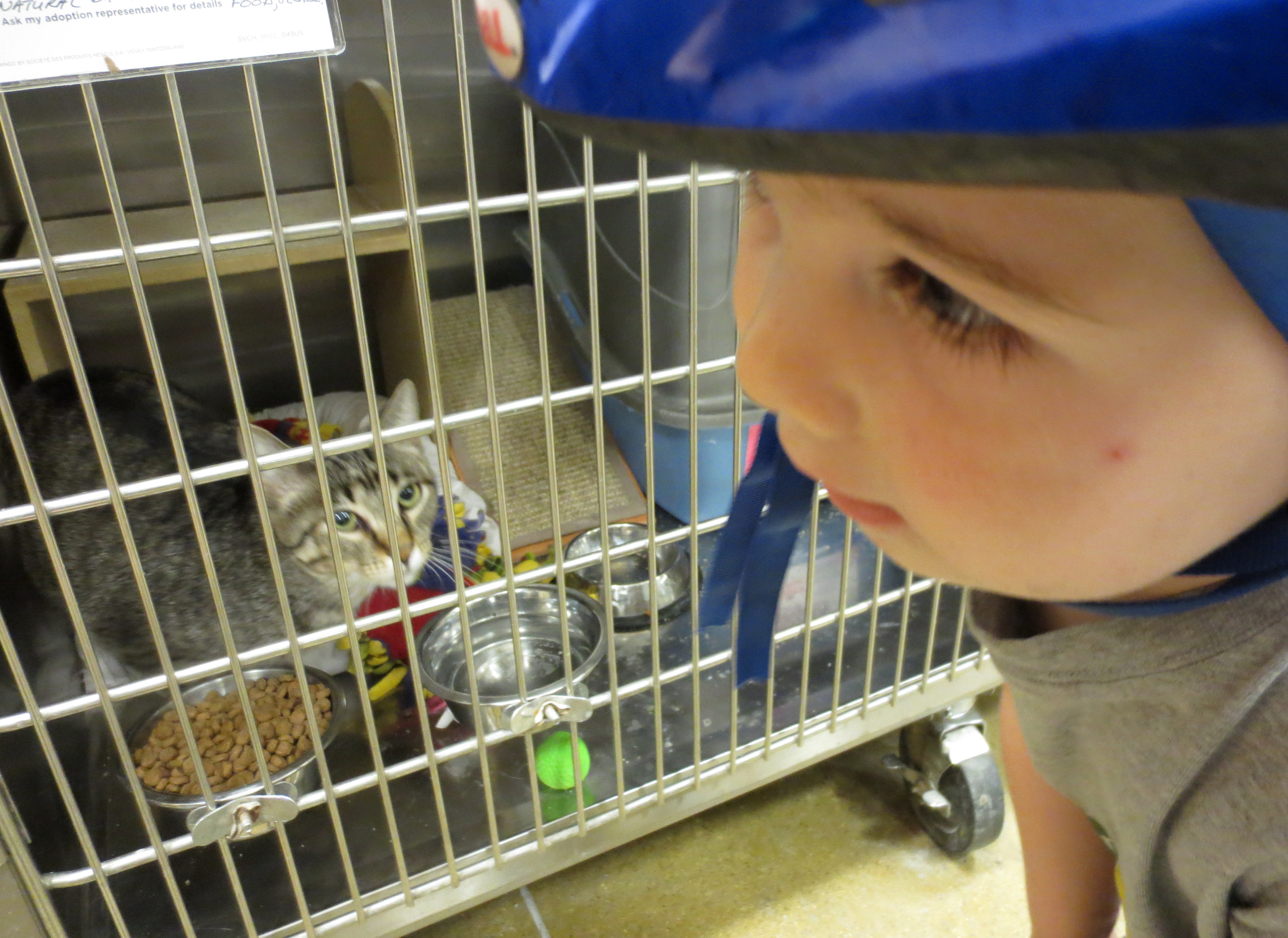 But where do you even get stuff engraved? The mall or something? We don’t even have those around here. But we do have a big box pet store about a half mile away. Sam and I headed there first thing in the morning, first visiting the shelter kitties in the back: