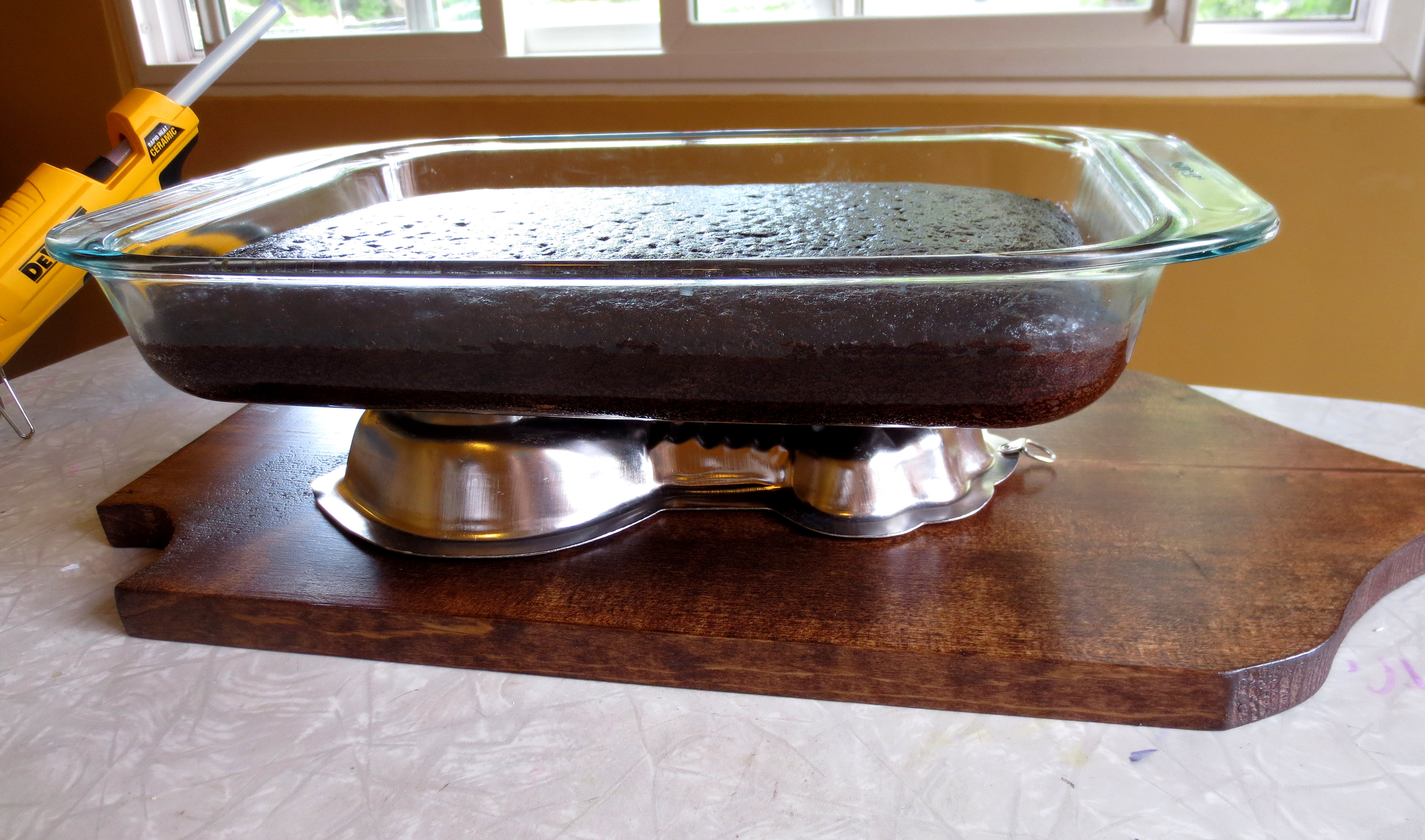 Place the birthday cake on top of the freshly-glued lobster to hold it down while the glue sets.
