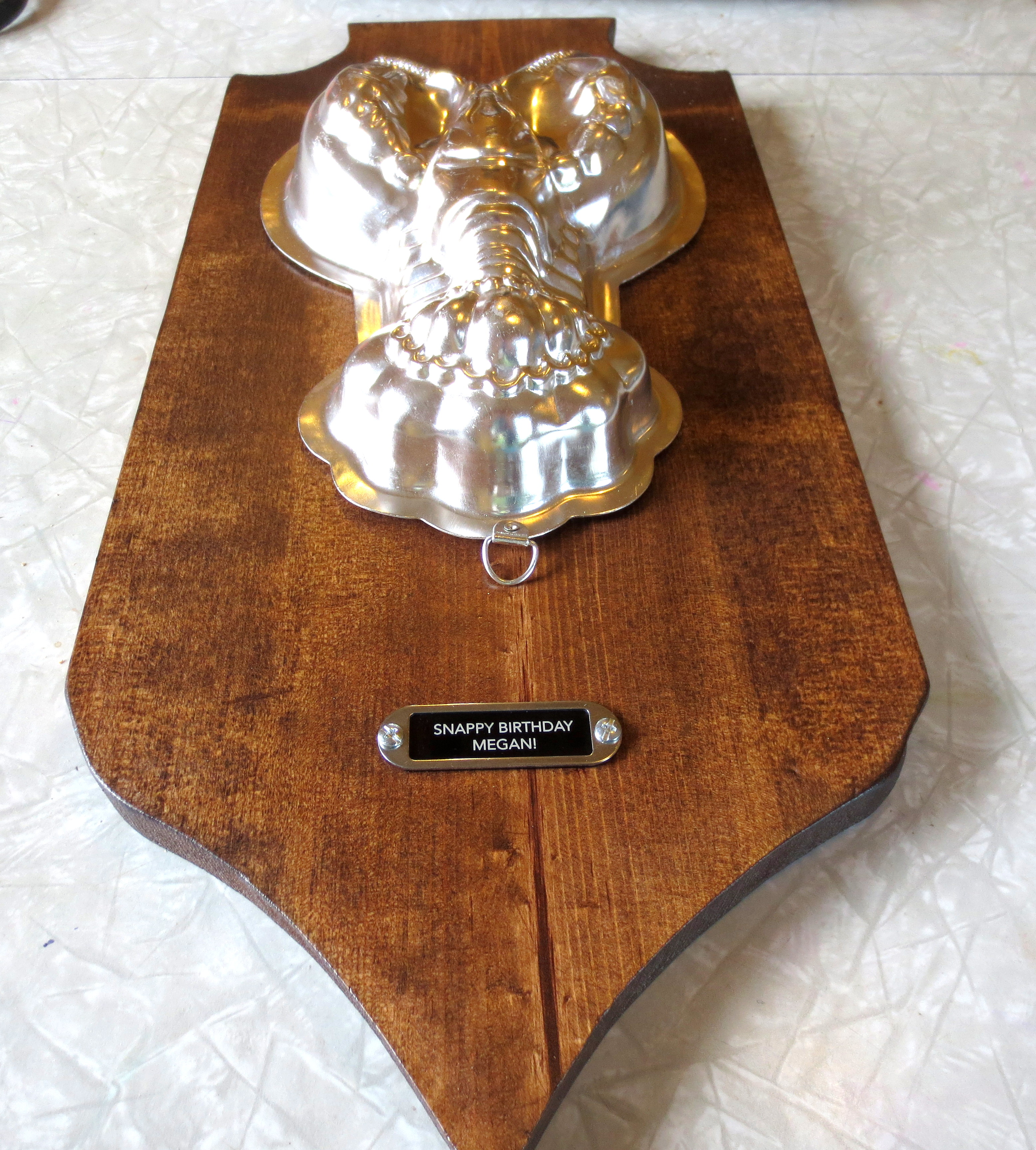 STEP THREE – FINISHING TOUCHES (AND A TRIP TO THE PET STORE): It’s not a plaque without an engraved message. Otherwise, it’s just an aluminum fish glued to a cutting board. Think of something sweet, yet clever, to say to your friend. A pun would be ideal. I agonized for days, but like most great ideas, it flew into my brain as I was trying to fall asleep the night before the surprise party. I sat straight up in bed and elbowed Scott: “SNAPPY BIRTHDAY – get it? Like, lobsters?!” He did.***