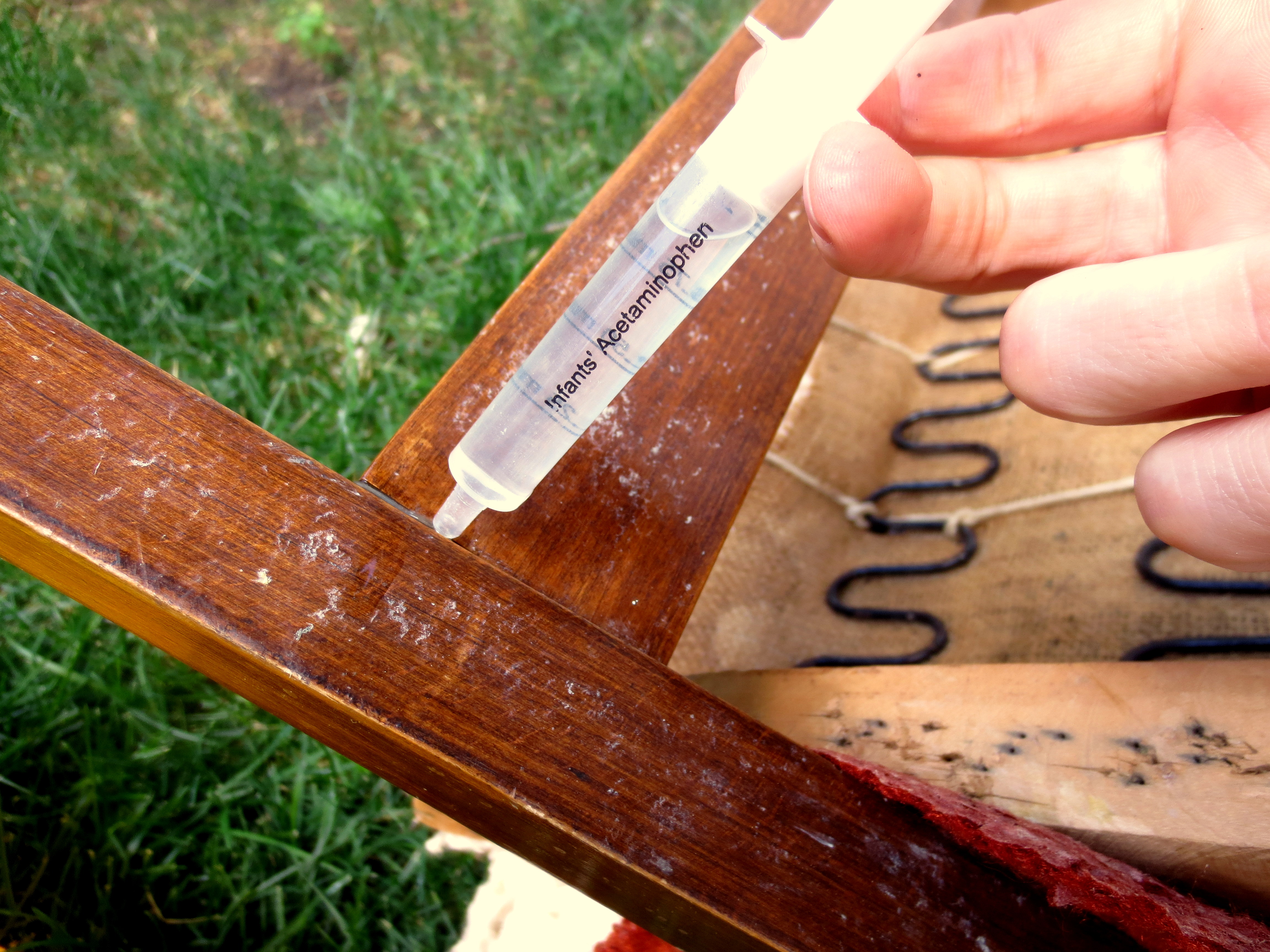 Then, I used a syringe to inject HOT VINEGAR into every joint I could find, in order to dissolve all the wood glue. If you share a home with small children, diabetics or IV drug users, then you probably have at least one syringe in your medicine cabinet or purse. If your lifestyle veers towards meat and firearms, try a turkey baster or water gun.