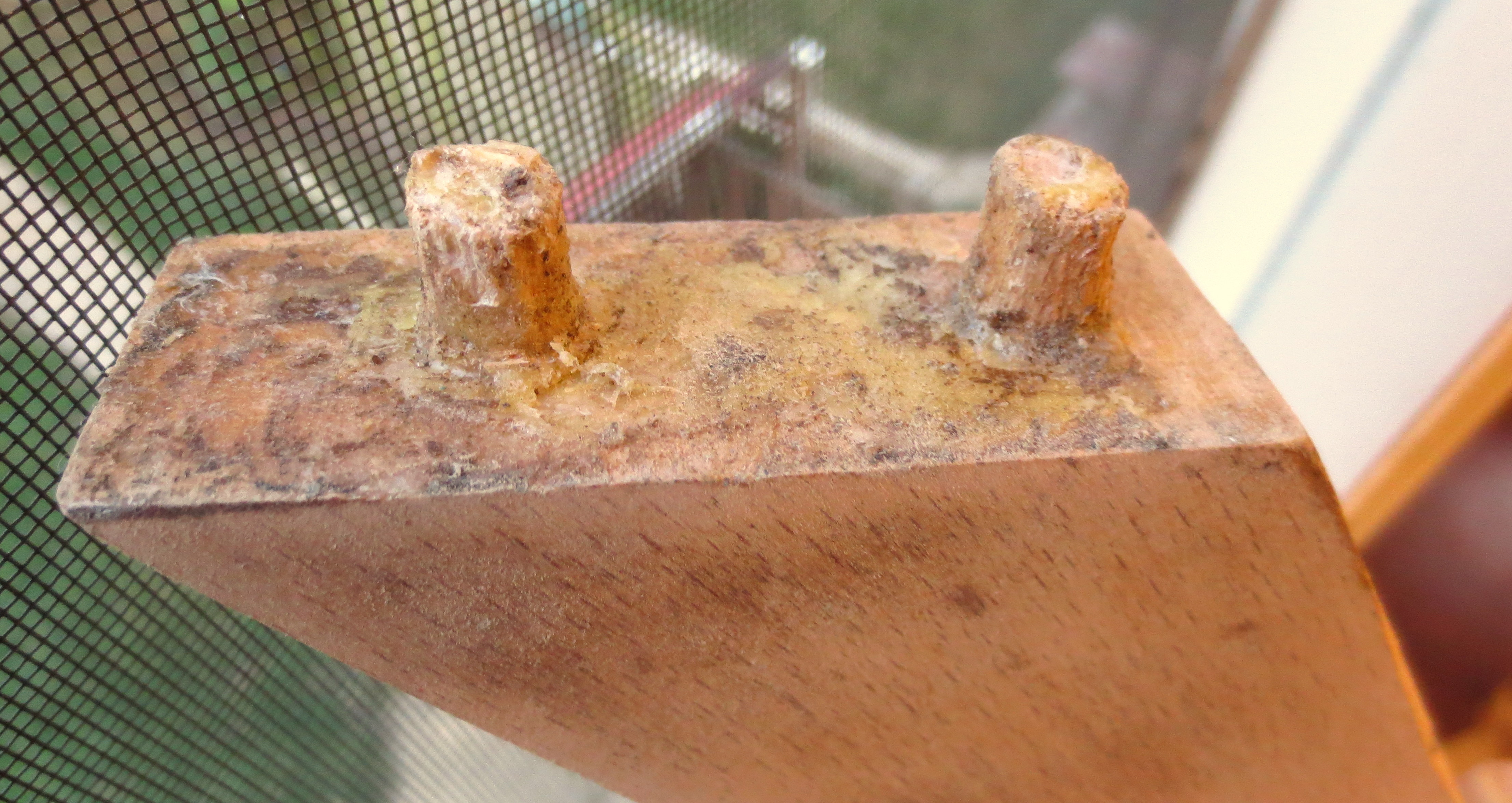Before you apply a new finish, you have to remove all this dried wood glue from the dowels and joints so that the new glue will work. This might be an even bigger pain-in-the-ass than those staples.
