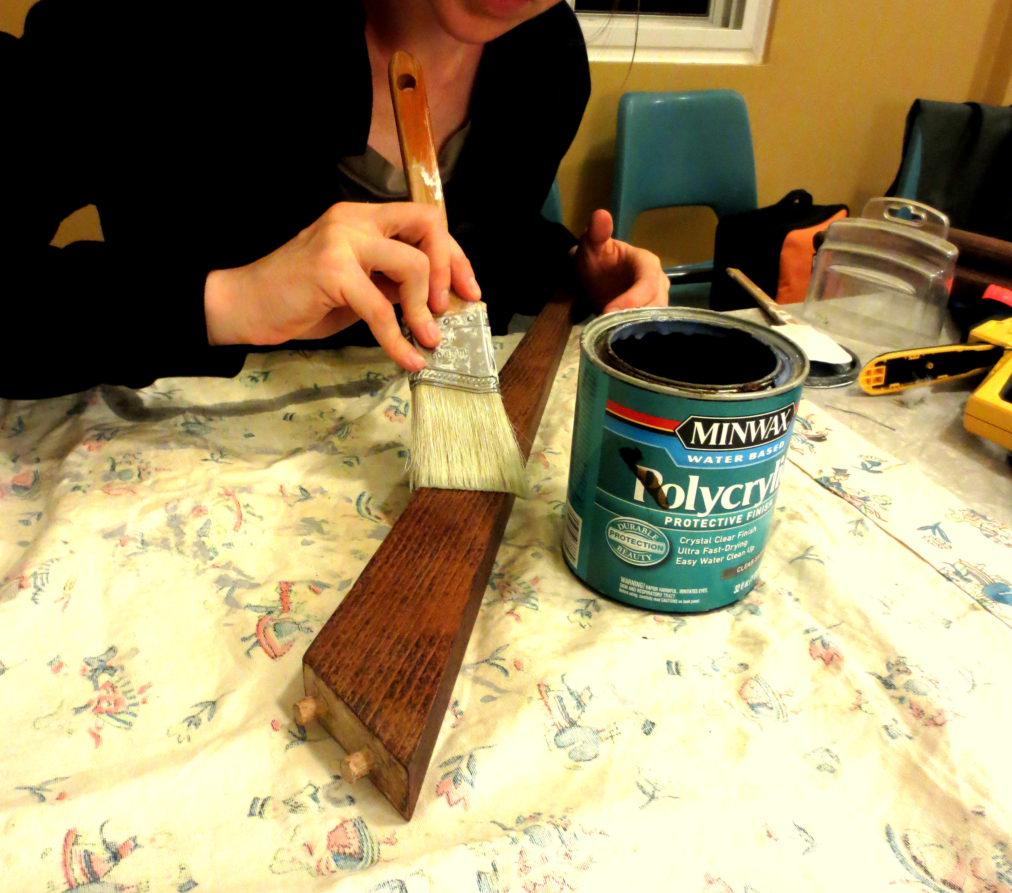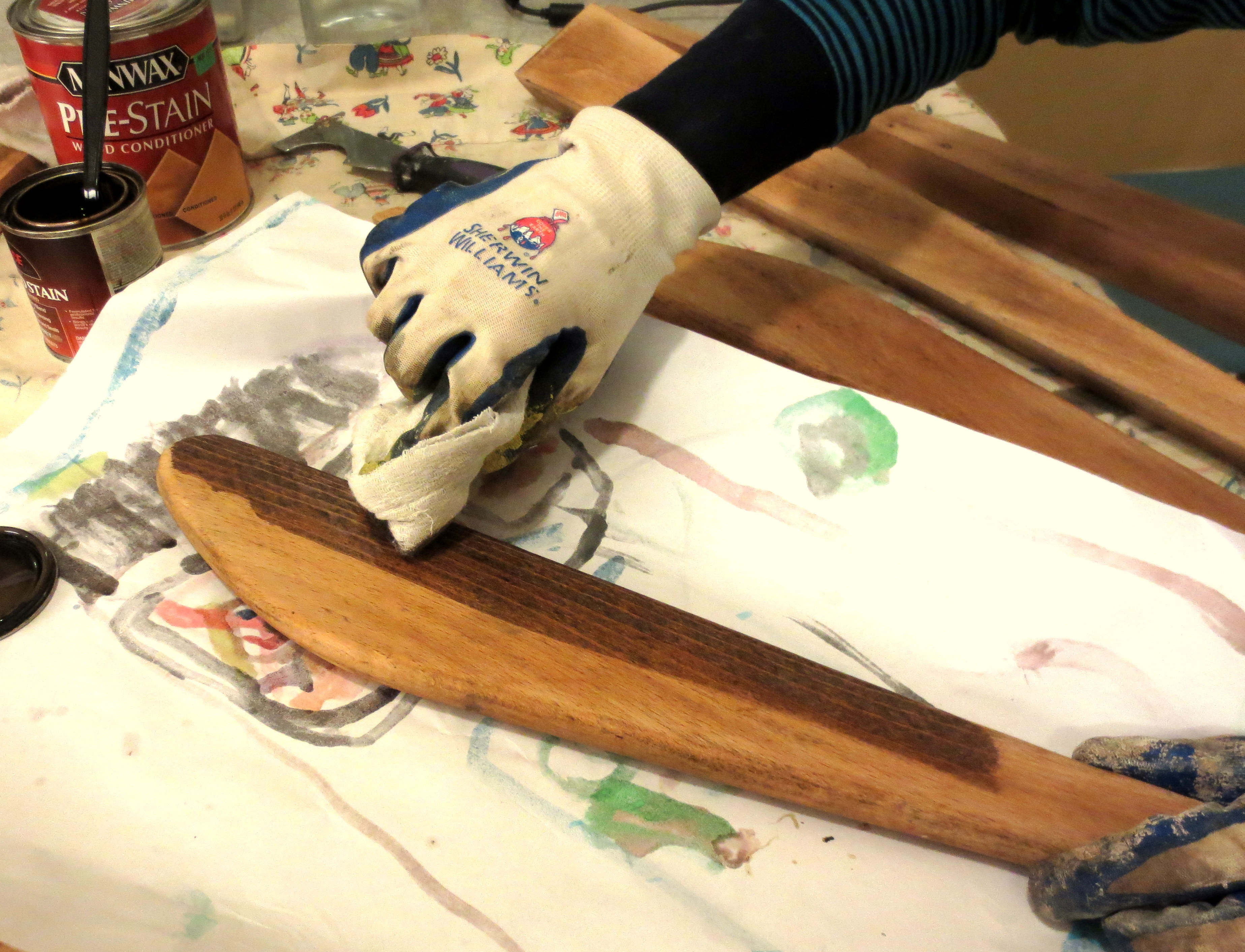 Then apply a sloppy coat of stain (I chose “walnut”), let it sit for 5-10 minutes, then wipe off the excess. I stopped after one coat, but you can go darker with more coats. Just like spray tan, I guess.