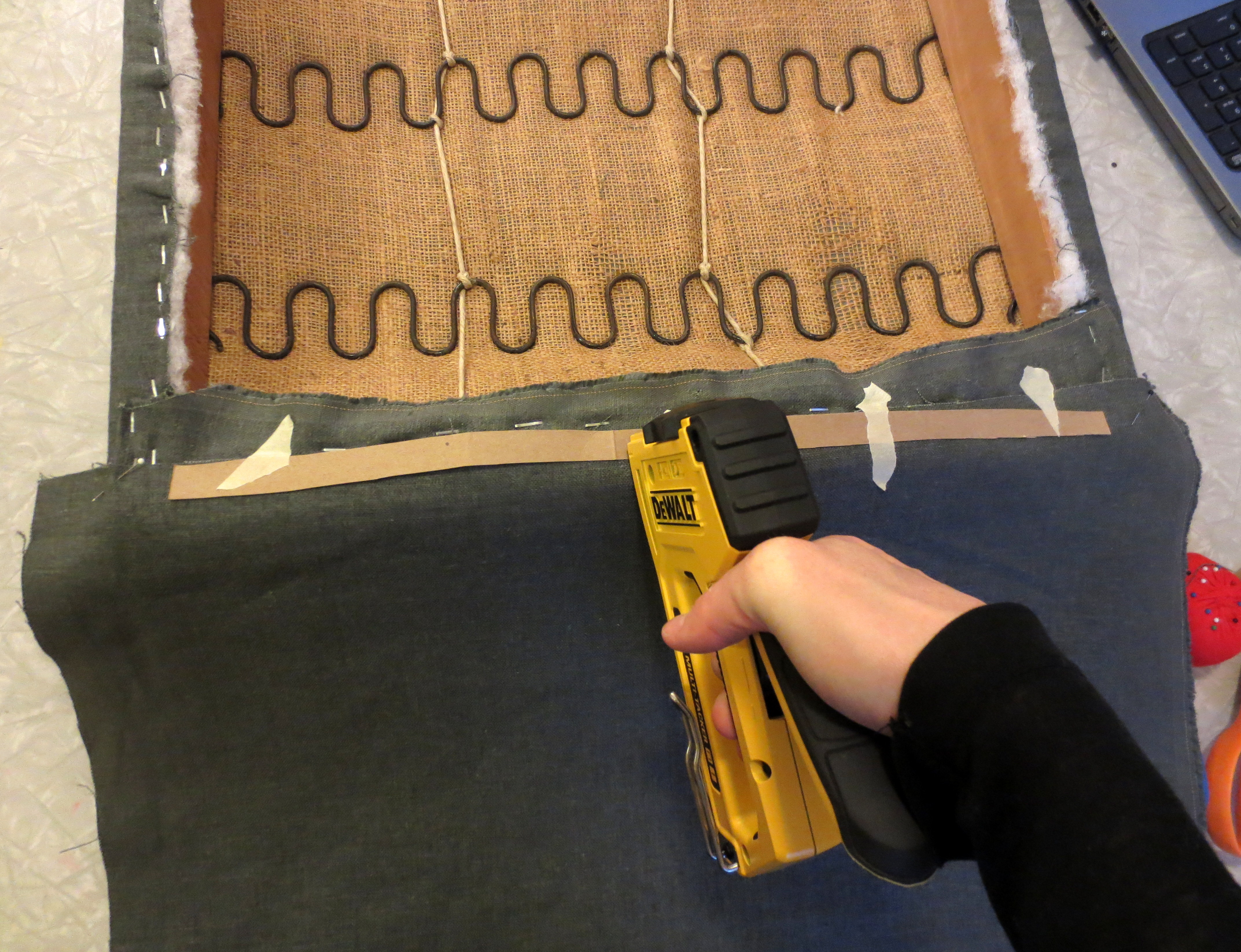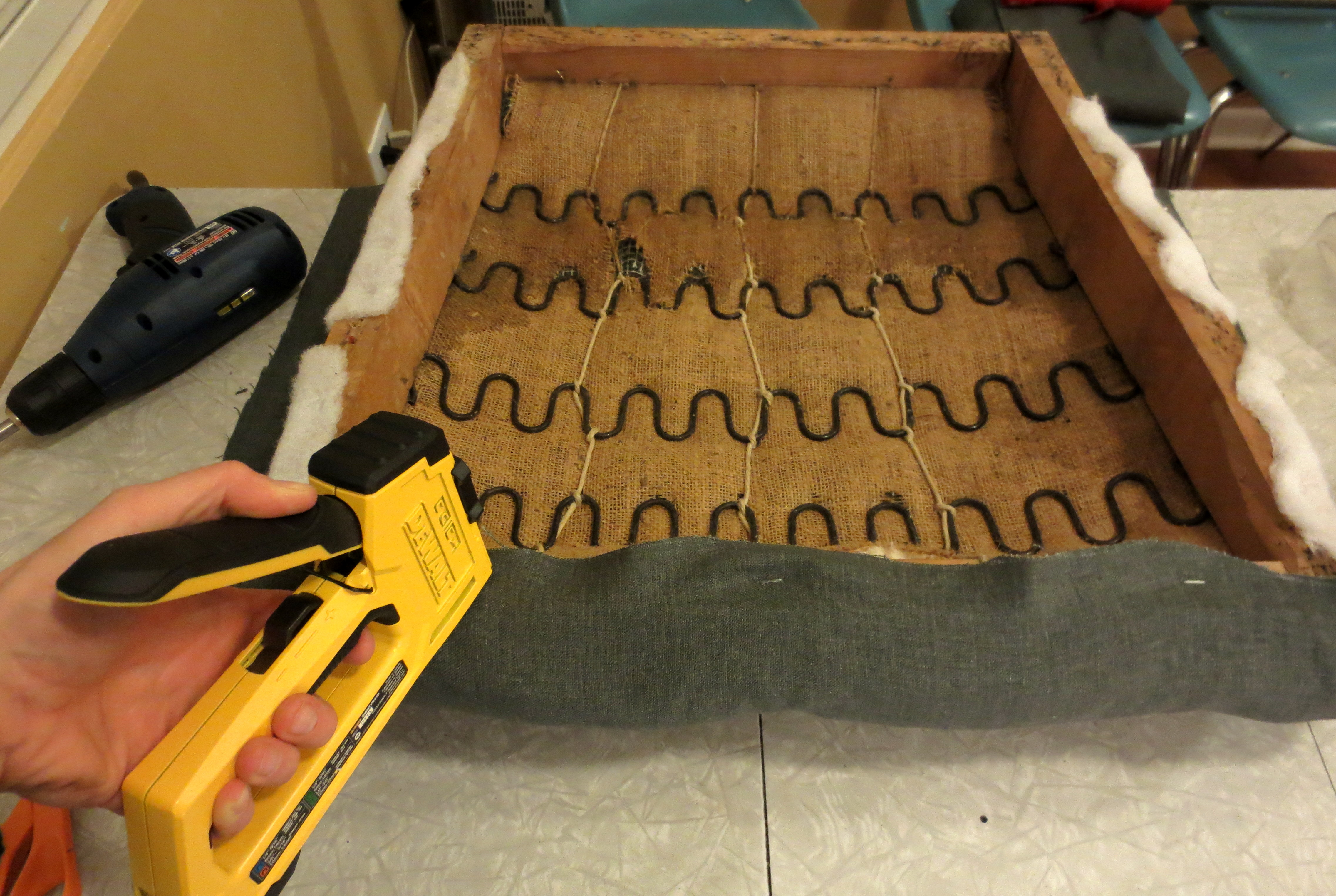 Based on my notes, I knew to start with the bottom seat cover, which was also the easiest. Position the fabric carefully over the seat, making sure it is even on all sides. Push the back of the fabric through the “crotch” of the seat (my term) in order to staple it onto the bottom rail.
