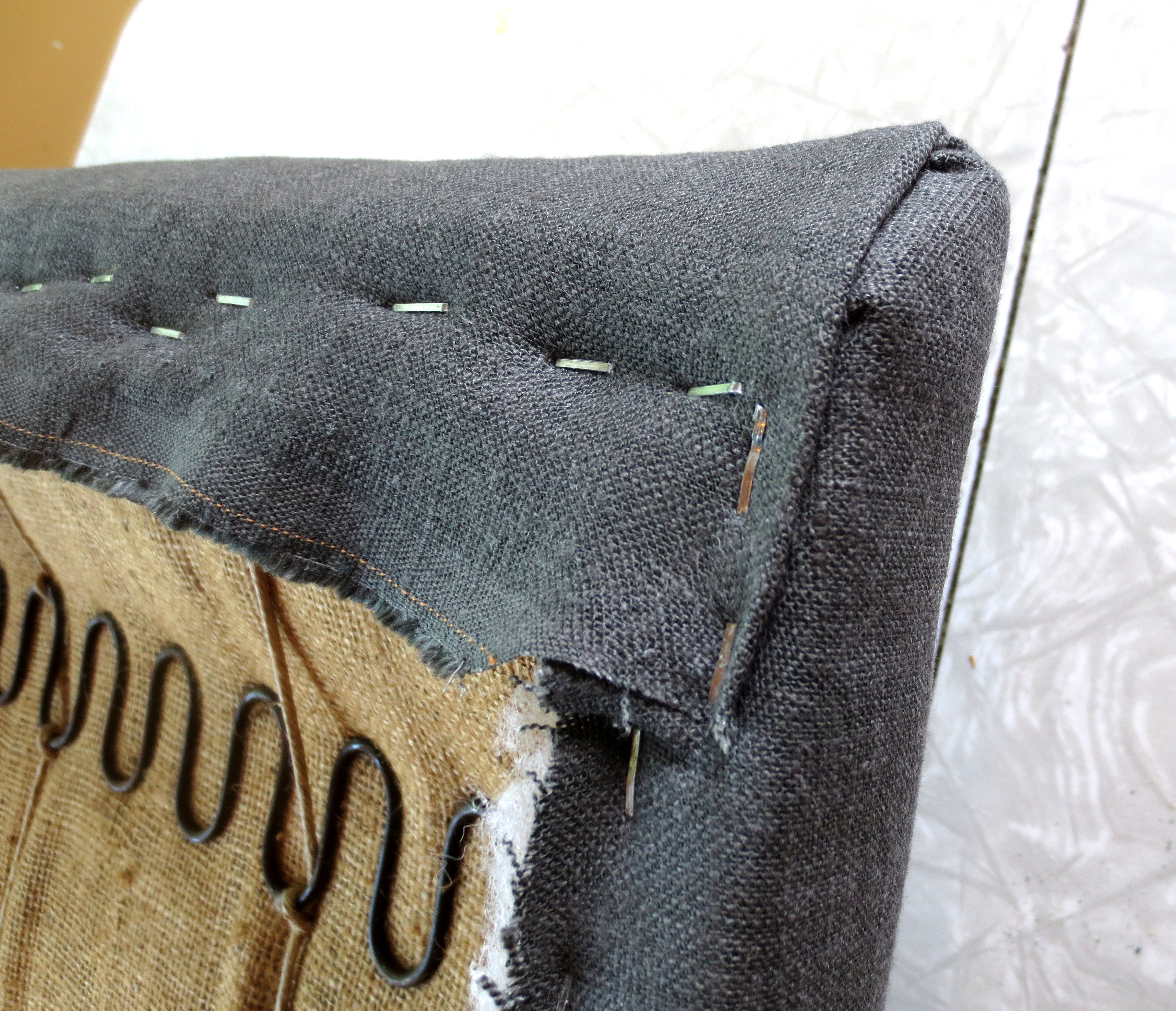 Once all the bottom staples were removed, I unthreaded the back cover, which was slip-stitched up the sides of the back cushion. Then I pulled the staples from the tack cushion to remove the entire back panel.