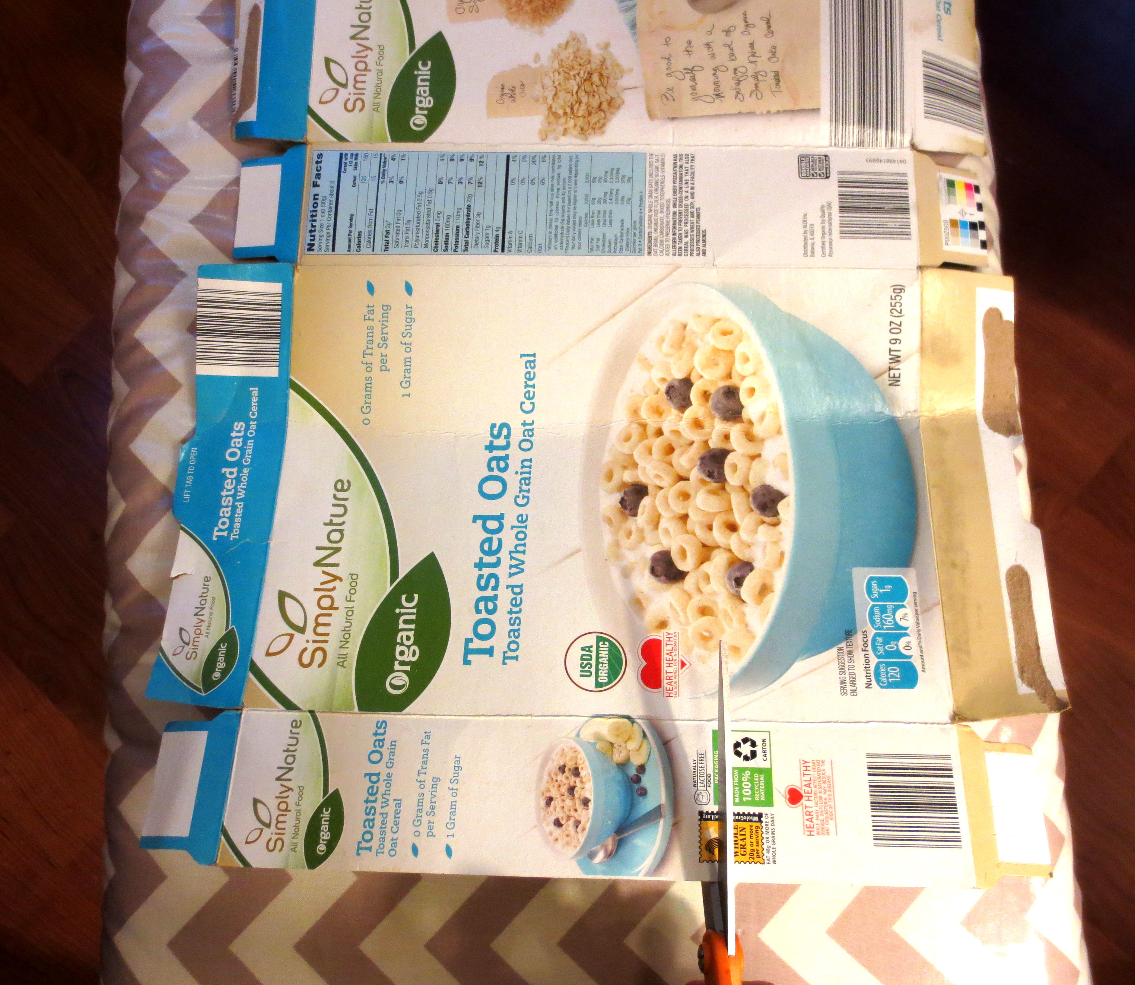 First, we need to staple the fabric to the top rail using a cardboard tack strip, which creates a straight edge for your fabric to drape over. You can buy tack strip if you want, but I just cut a ½-inch strip from a cereal box. And yes, they do sell organic Cherrios at Aldi: