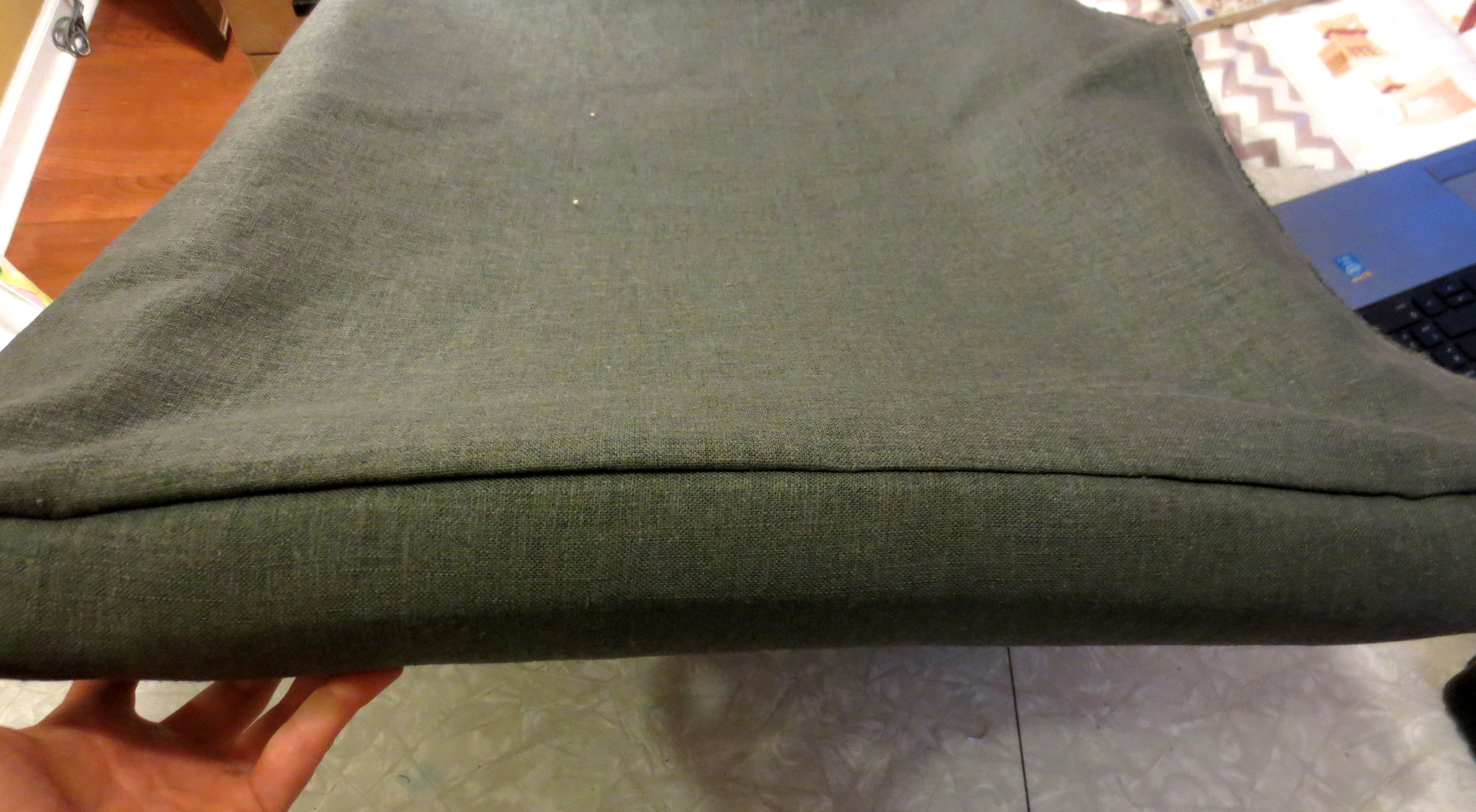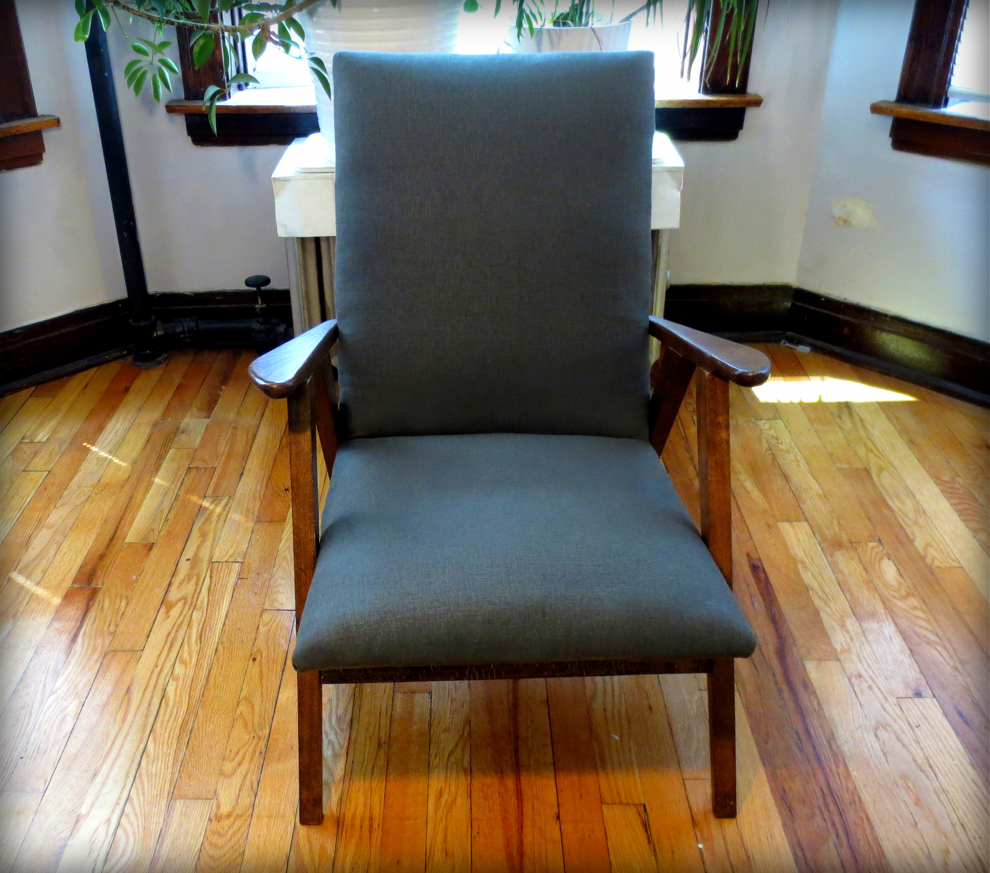 The next day, I used a 40% coupon to buy a couple yards of the most forgiving home décor fabric I could find in solid, serious gray. Since this is my first “real” upholstery project, I shied away from patterns or prints, which I would have to keep straight and aligned between sections of the chair (and inevitably screw up).