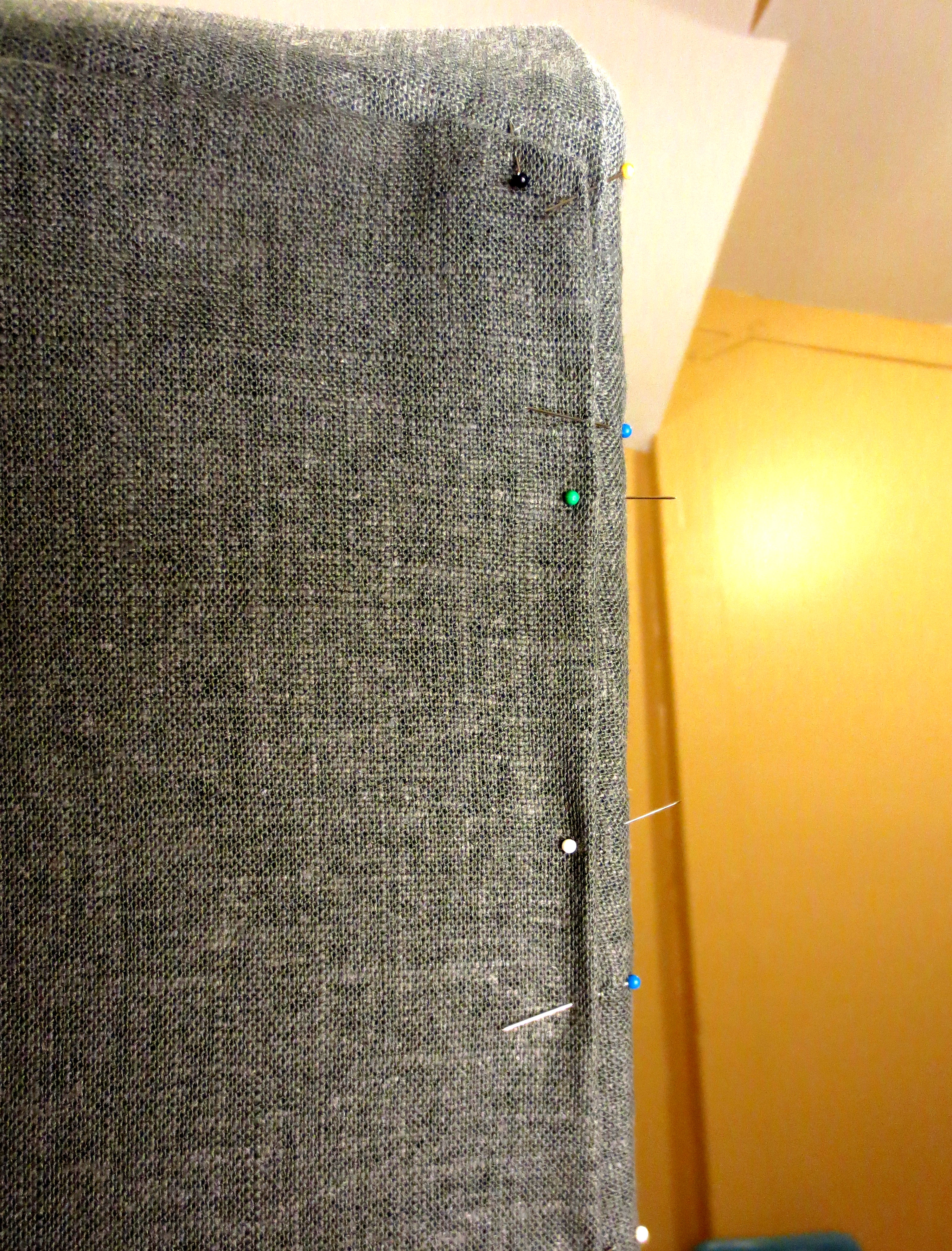Turn the chair back to an upright position. Fold the sides of the fabric in, and pin it to the front cover fabric that’s already stapled to the side rails: