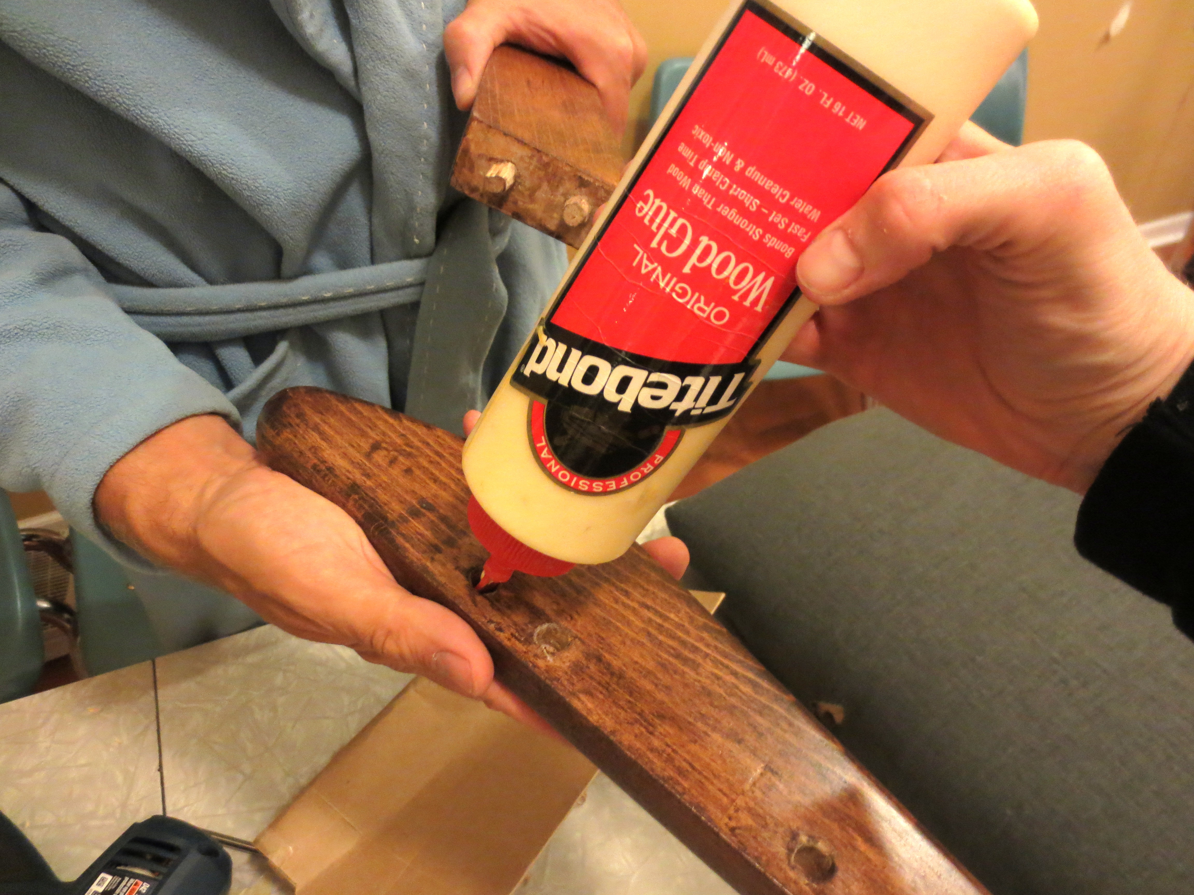 It’s so romantic: he holds the beautifully restored chair arms while you squirt wood glue into their holes. He’s even wearing that robe you bought him 9 years ago that says “Snuggle Champ” on the back: