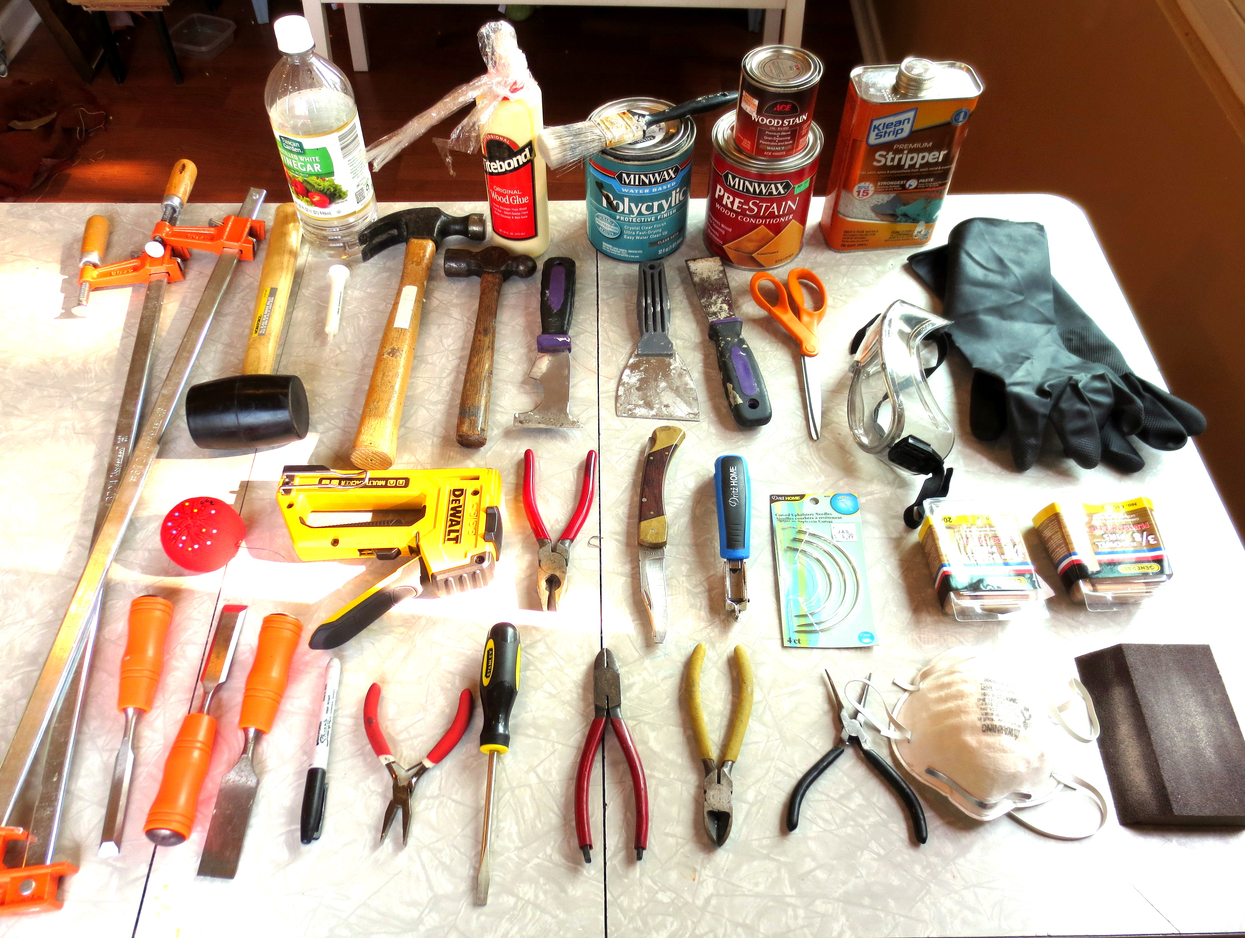 A few of the supplies you will need for this project. Not pictured: Power drill, electric sander, tea kettle, flask of bourbon and marriage counselor.